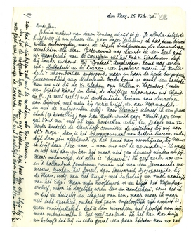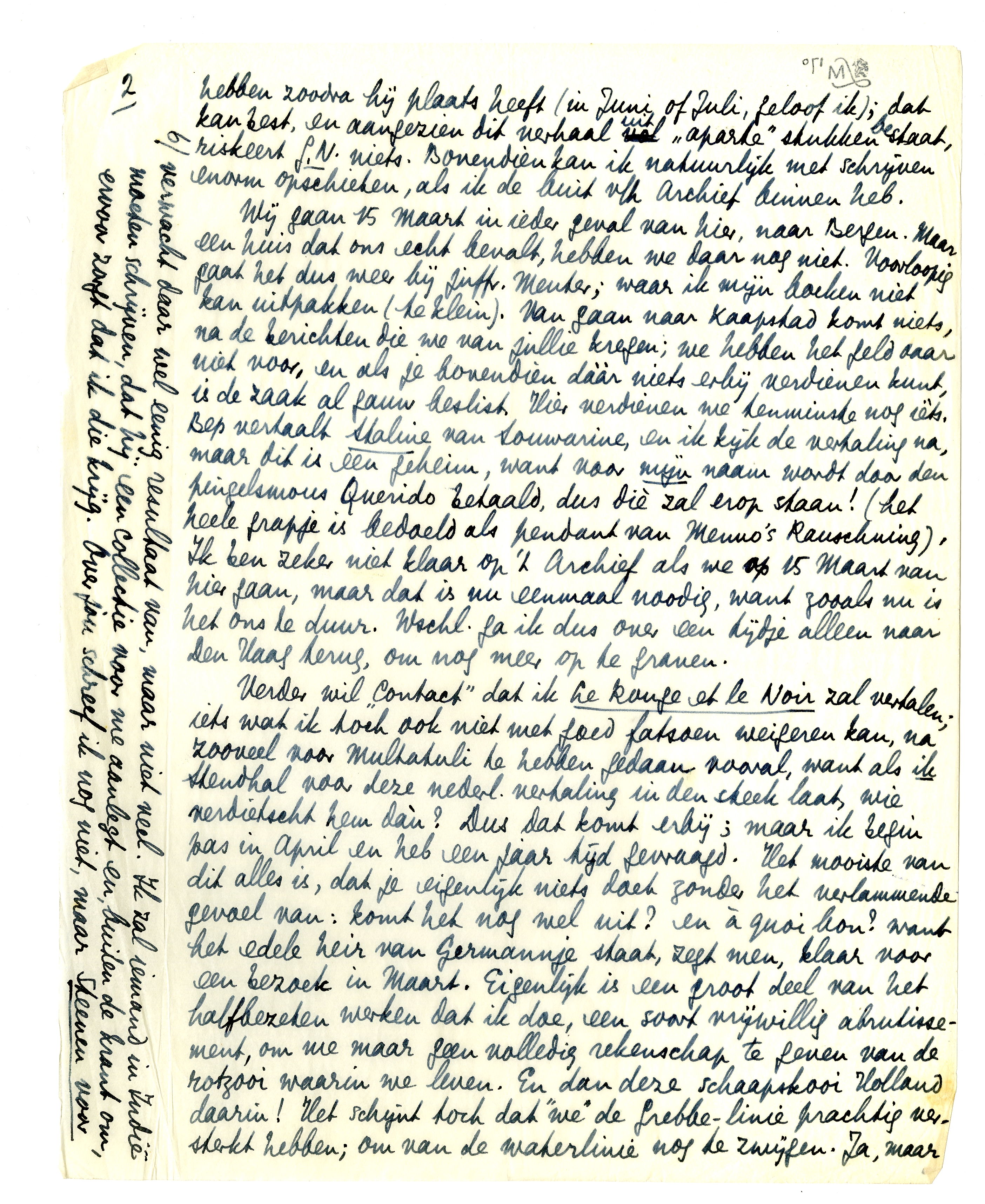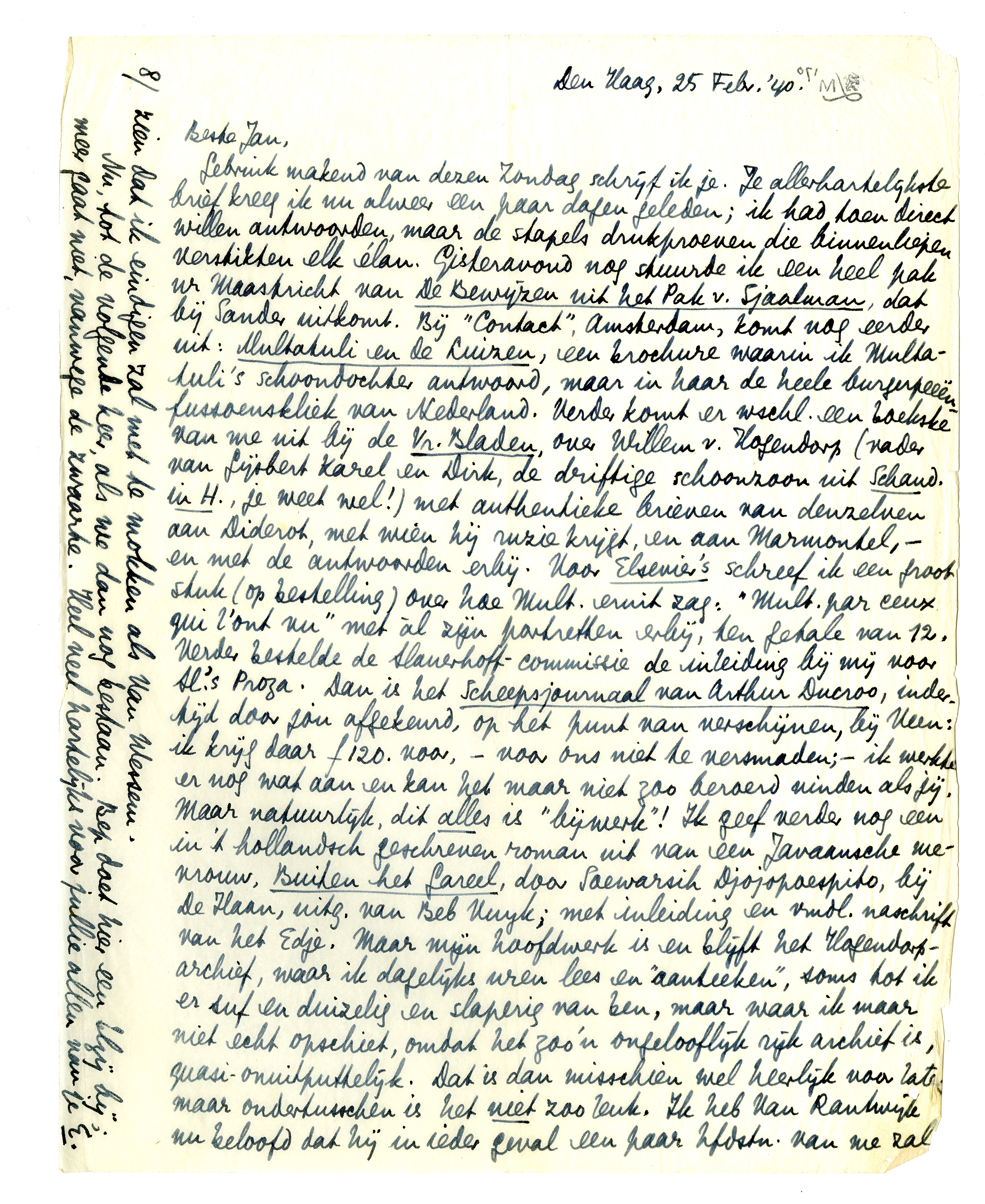 Wij gaan 15 Maart in ieder geval van hier, naar Bergen. Maar een huis dat ons echt bevalt, hebben we daar nog niet. Voorloopig gaat het dus weer bij juffr. Meuter; waar ik mijn boeken niet kan uitpakken (te klein). Van gaan naar Kaapstad komt niets, na de berichten die we van jullie kregen; we hebben het geld daar niet voor, en als je bovendien dààr niets erbij verdienen kunt, is de zaak al gauw beslist. Hier verdienen we tenminste nog ièts. Bep vertaalt Staline van Souwarine, en ik kijk de vertaling na, maar dit is een geheim, want voor mijn naam wordt door den pingelsmous Querido betaald, dus diè zal erop staan! (het heele grapje is bedoeld als pendant van Menno's Rauschning).6774 Ik ben zeker niet klaar op 't Archief als we op 15 Maart van hier gaan, maar dat is nu eenmaal noodig, want zooals nu is het ons te duur. Wschl. ga ik dus over een tijdje alleen naar Den Haag terug, om nog meer op te graven.