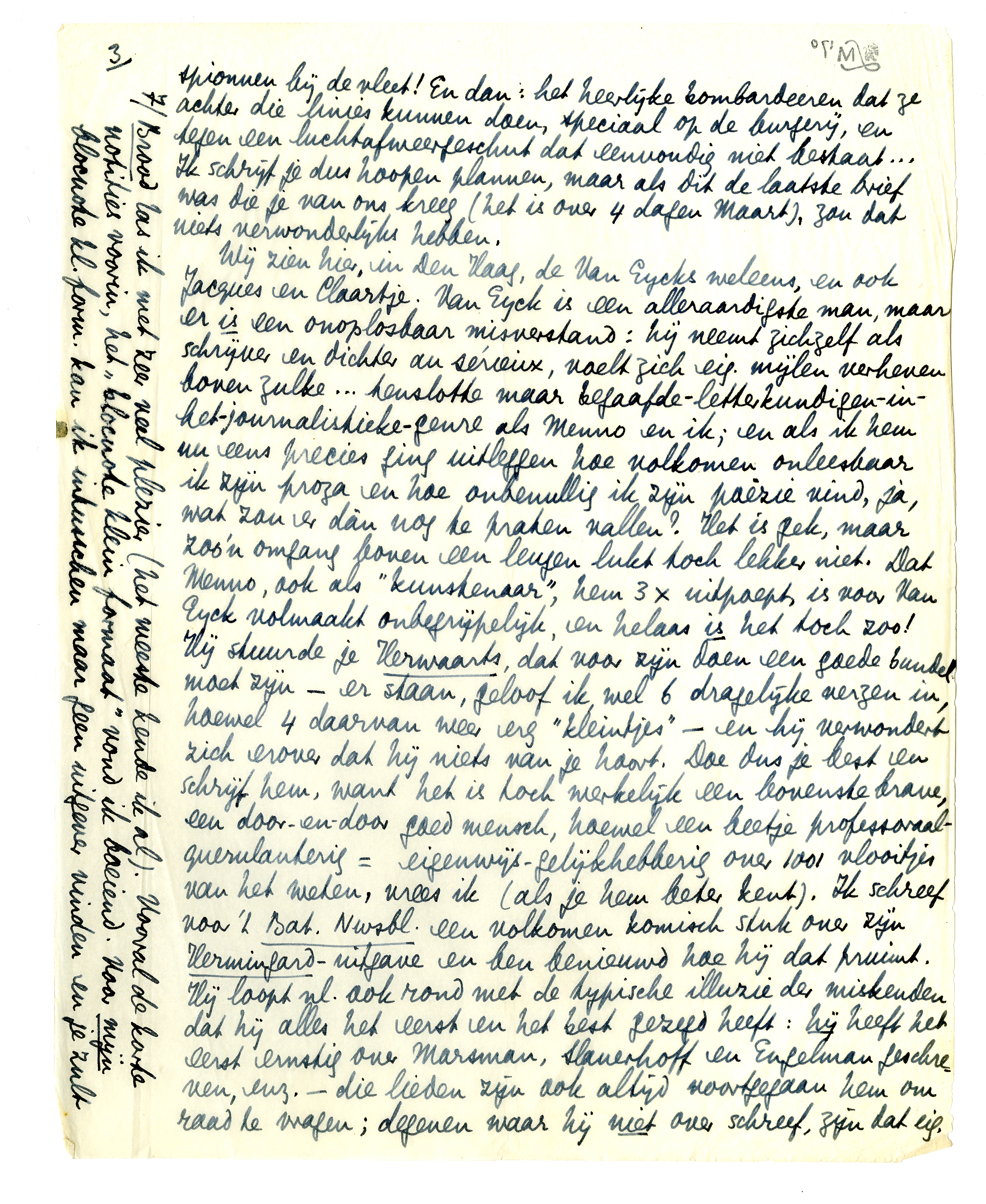 Wij zien hier, in Den Haag, de Van Eycks weleens, en ook Jacques en Claartje.6775 Van Eyck is een alleraardigste man, maar er is een onoplosbaar misverstand: hij neemt zichzelf als schrijver en dichter au sérieux, voelt zich eig. mijlen verheven boven zulke... tenslotte maar begaafde-letterkundigen-in-het-journalistieke-genre als Menno en ik; en als ik hem nu eens precies ging uitleggen hoe volkomen onleesbaar ik zijn proza en hoe onbenullig ik zijn poëzie vind, ja, wat zou er dàn nog te praten vallen? Het is gek, maar zoo'n omgang boven een leugen lukt toch lekker niet. Dat Menno, ook als ‘kunstenaar’, hem 3 × uitpoept, is voor Van Eyck volmaakt onbegrijpelijk, en helaas is het toch zoo! Hij stuurde je Herwaarts, dat voor zijn doen een goede bundel moet zijn - er staan, geloof ik wel 6 dragelijke verzen in, hoewel 4 daarvan weer erg ‘kleintjes’ - en hij verwondert zich erover dat hij niets van je hoort. Doe dus je best en schrijf hem, want het is toch werkelijk een bovenste brave, een door-en-door goed mensch, hoewel een beetje professoraal querulanterig = eigenwijs-gelijkhebberig over 1001 vlooitjes van het weten, vrees ik (als je hem beter kent). Ik schreef voor 't Bat. Nwsbl. een volkomen komisch stuk over zijn Hermingard-uitgave en ben benieuwd hoe hij dat pruimt. Hij loopt nl. ook rond met de typische illuzie der miskenden dat hij alles het eerst en het best gezegd heeft: hij heeft het eerst ernstig over Marsman, Slauerhoff en Engelman6776 geschreven, enz. - die lieden zijn ook altijd voortgegaan hem om raad te vragen; degenen waar hij niet over schreef, zijn dat eig. ook niet waard, enz. In deze opzichten lijkt hij een beetje op Van Wessem, zonder wien Slauerhoff eig. ook niet bestaan zou hebben, zooals je weet. Maar summa summarum, ik vind hem te echt en te aardig om werkelijk eens principieel op dit alles in te gaan. Schrijf hem toch vooral iets aardigs over Herwaarts.