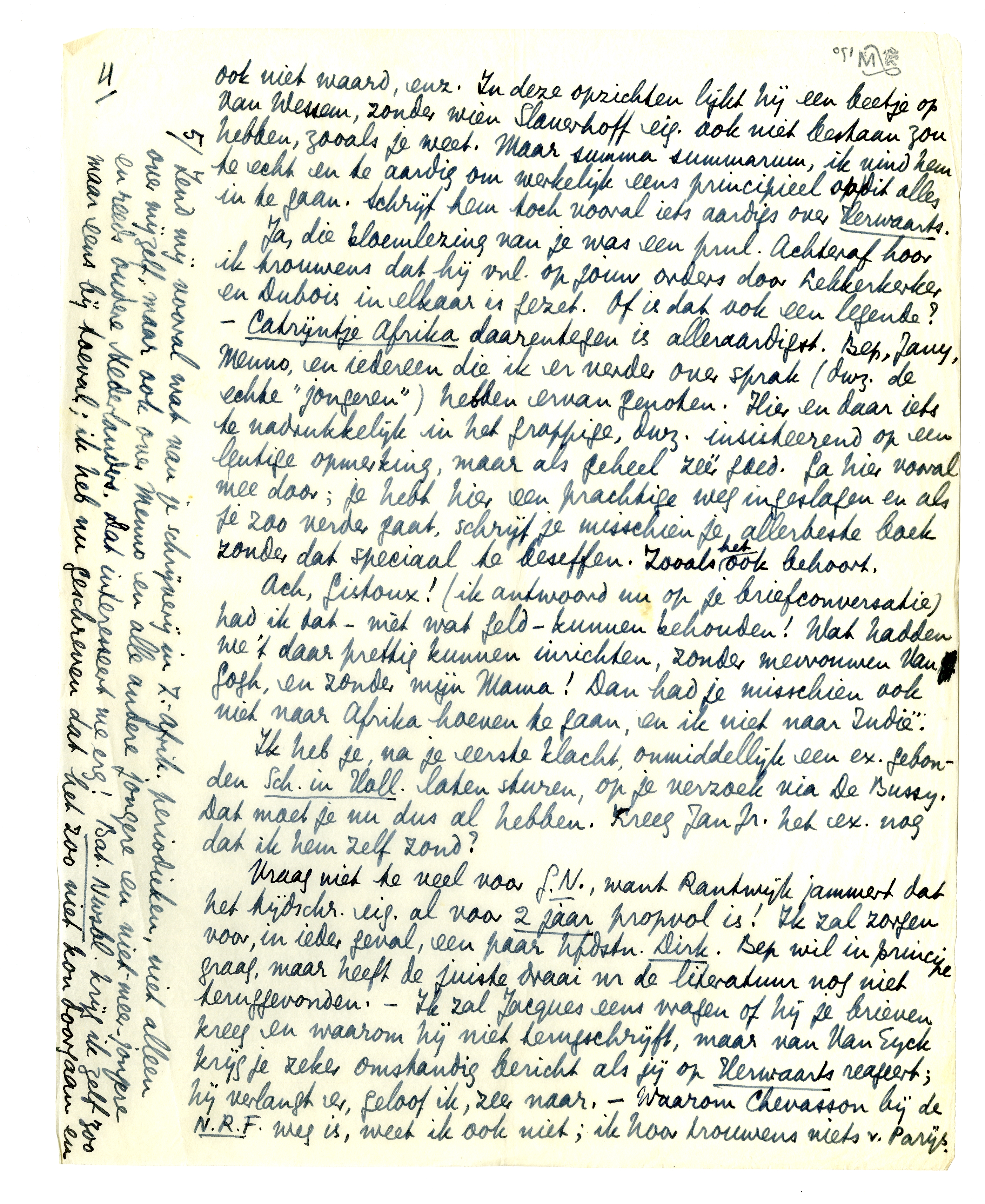 Vraag niet te veel voor G.N., want Rantwijk jammert dat het tijdschr. eig. al voor 2 jaar propvol is! Ik zal zorgen voor, in ieder geval, een paar hfdstn. Dirk. Bep wil in principe graag, maar heeft de juiste draai nr de literatuur nog niet teruggevonden.6779 - Ik zal Jacques eens vragen of hij je brieven kreeg en waarom hij niet terugschrijft, maar van Van Eyck krijg je zeker omstandig bericht als jij op Herwaarts reageert; hij verlangt er, geloof ik, zeer naar. - Waarom Chevasson bij de N.R.F. weg is, weet ik ook niet; ik hoor trouwens niets v. Parijs.