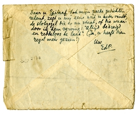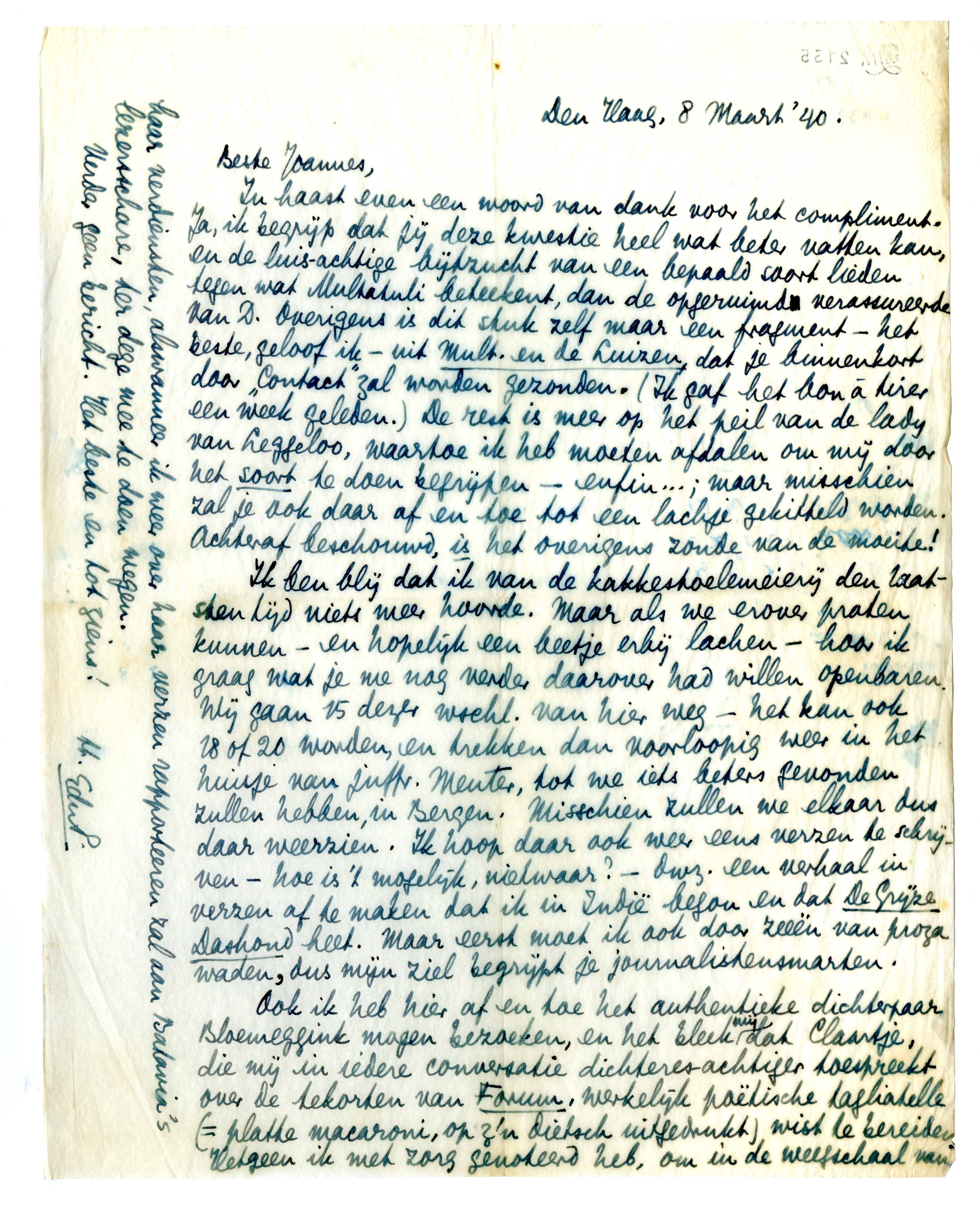 Ik ben blij dat ik van de kakkestoelemeierij6808 den laatsten tijd niets meer hoorde. Maar als we erover praten kunnen - en hopelijk een beetje erbij lachen - hoor ik graag wat je me nog verder daarover had willen openbaren. Wij gaan 15 dezer wschl. van hier weg - het kan ook 18 of 20 worden, en trekken dan voorloopig weer in het huisje van juffr. Meuter, tot we iets beters gevonden zullen hebben, in Bergen. Misschien zullen we elkaar dus daar weerzien. Ik hoop daar ook weer eens verzen te schrijven - hoe is 't mogelijk, nietwaar? - dwz. een verhaal in verzen af te maken dat ik in Indië begon en dat De Grijze Dashond heet. Maar eerst moet ik ook door zeeën van proza waden, dus mijn ziel begrijpt je journalistensmarten.