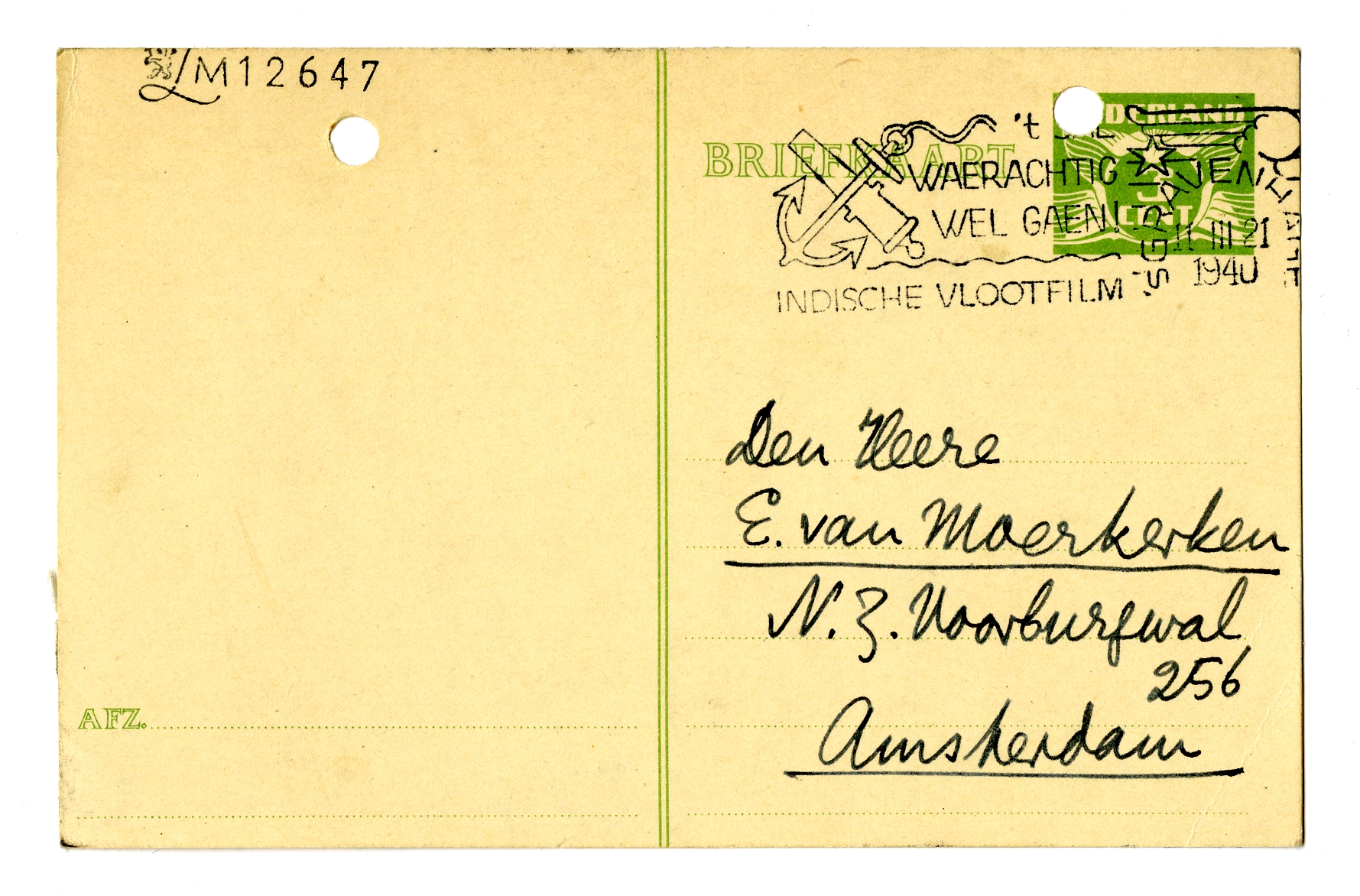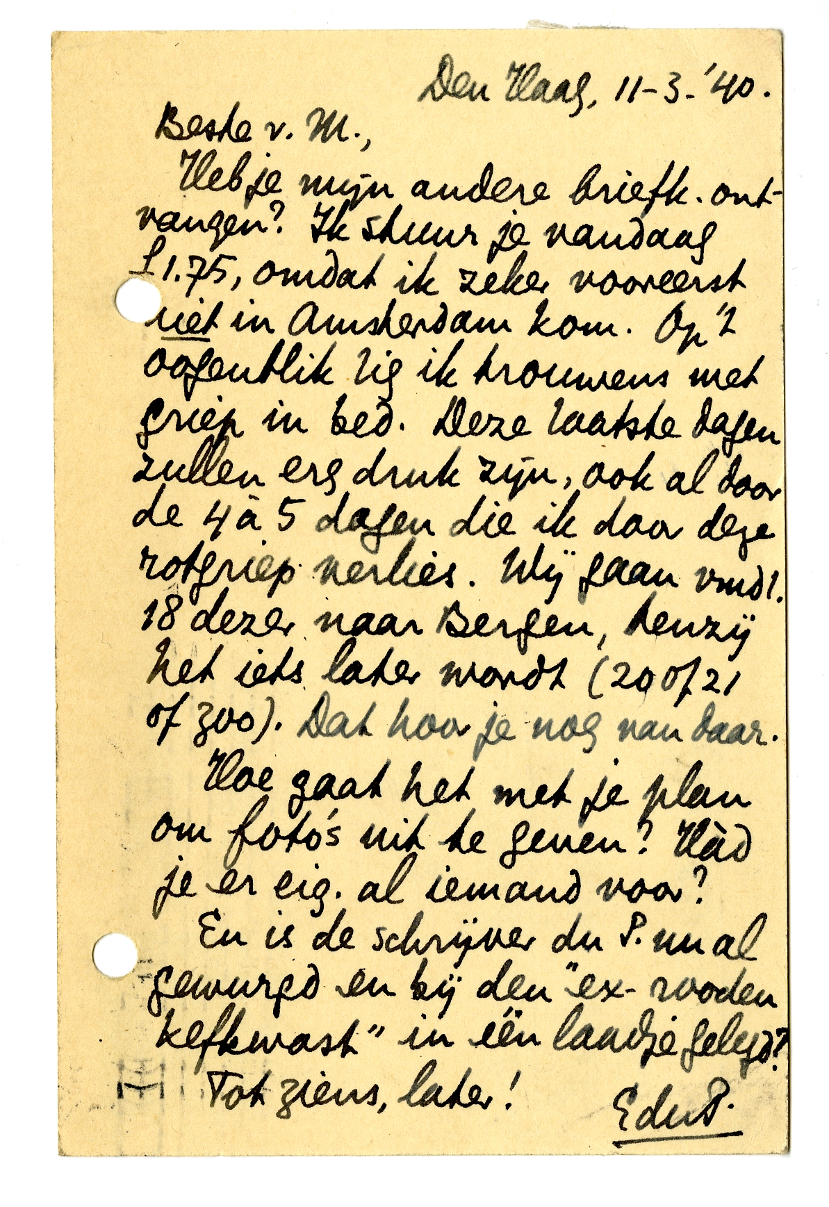 Heb je mijn andere briefk. ontvangen? Ik stuur je vandaag f 1.75, omdat ik zeker vooreerst niet in Amsterdam kom. Op 't oogenblik lig ik trouwens met griep in bed. Deze laatste dagen zullen erg druk zijn, ook al door de 4 à 5 dagen die ik door deze rotgriep verlies. Wij gaan vmdl. 18 dezer naar Bergen, tenzij het iets later wordt (20 of 21 of zoo). Dat hoor je nog van daar.