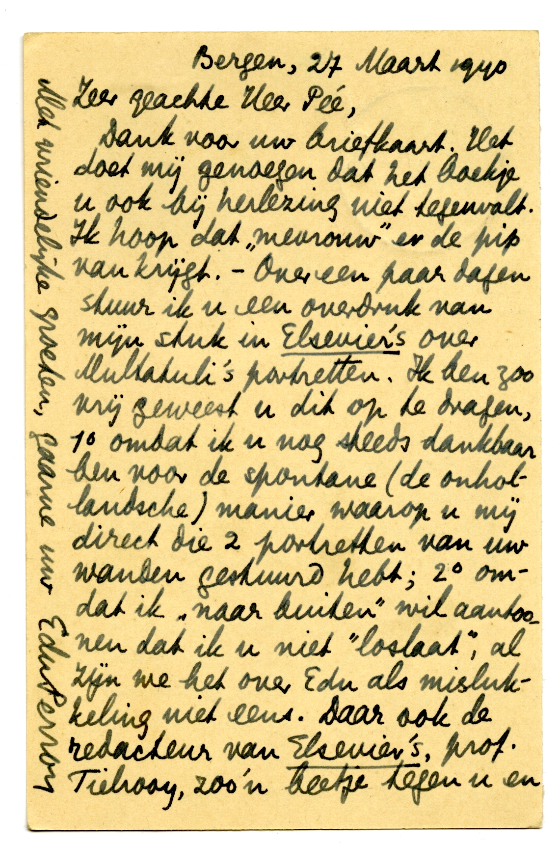 Dank voor uw briefkaart. Het doet mij genoegen dat het boekje u ook bij herlezing niet tegenvalt. Ik hoop dat ‘mevrouw’ er de pip van krijgt. - Over een paar dagen stuur ik u een overdruk van mijn stuk in Elsevier's over Multatuli's portretten. Ik ben zoo vrij geweest u6856 dit op te dragen, 1o omdat ik u nog steeds dankbaar ben voor de spontane (de onhollandsche) manier waarop u mij direct die 2 portretten van uw wanden gestuurd hebt; 2o omdat ik ‘naar buiten’ wil aantoonen dat ik u niet ‘loslaat’, al zijn we het over Edu als mislukkeling niet eens. Daar ook de redacteur van Elsevier's, prof. Tielrooy, zoo'n beetje tegen u en Ter Braak, dwz. pro ‘mevrouw’ geschreven heeft - hoewel zeer gematigd!6857 - vond ik dit extra aardig, nu dit artikel in zijn blad verschijnt. Ik hoop dat u de opdracht aanvaarden wilt. Ter Br. kijkt met spanning uit naar ùw antwoord op ‘mevrouw’; hij zou uw en mijn antwoord liefst samen voor Het Vad. bespreken.