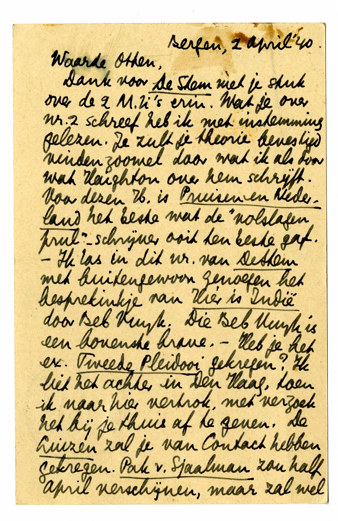 Dank voor De Stem mèt je stuk over de 2 M. li's erin. Wat je over nr. 2 schreef heb ik met instemming gelezen. Je zult je theorie bevestigd vinden zoowel door wat ik als door wat Haighton over hem schrijft. Voor dezen H. is Pruisen en Nederland6897 het beste wat de ‘volslagen prul’-schrijver ooit ten beste gaf. - Ik las in dit nr. van De Stem met buitengewoon genoegen het besprekinkje van Hier is Indië door Beb Vuyk.6898 Die Beb Vuyk is een bovenste brave. - Heb je het ex. Tweede Pleidooi gekregen? Ik liet het achter in Den Haag, toen ik naar hier vertrok, met verzoek het bij je thuis af te geven. De Luizen zal je van Contact hebben gekregen. Pak v. Sjaalman zou half April verschijnen, maar zal wel een week later uitkomen; ik kreeg nog steeds geen 2e revisie. Dat vraag je dus aan Stols.
