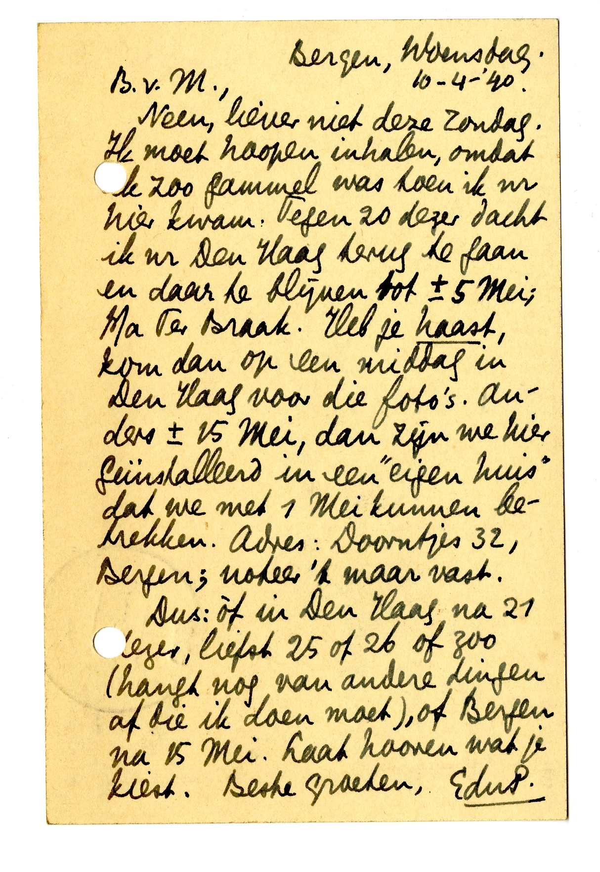 Neen, liever niet deze Zondag. Ik moet hoopen inhalen, omdat ik zoo gammel was toen ik nr hier kwam. Tegen 20 dezer dacht ik nr Den Haag terug te gaan en daar te blijven tot ± 5 Mei; p/a Ter Braak. Heb je haast, kom dan op een middag in Den Haag voor die foto's. Anders ± 15 Mei, dan zijn we hier geïnstalleerd in een ‘eigen huis’ dat we met 1 Mei kunnen betrekken. Adres: Doorntjes 32, Bergen; noteer 't maar vast.