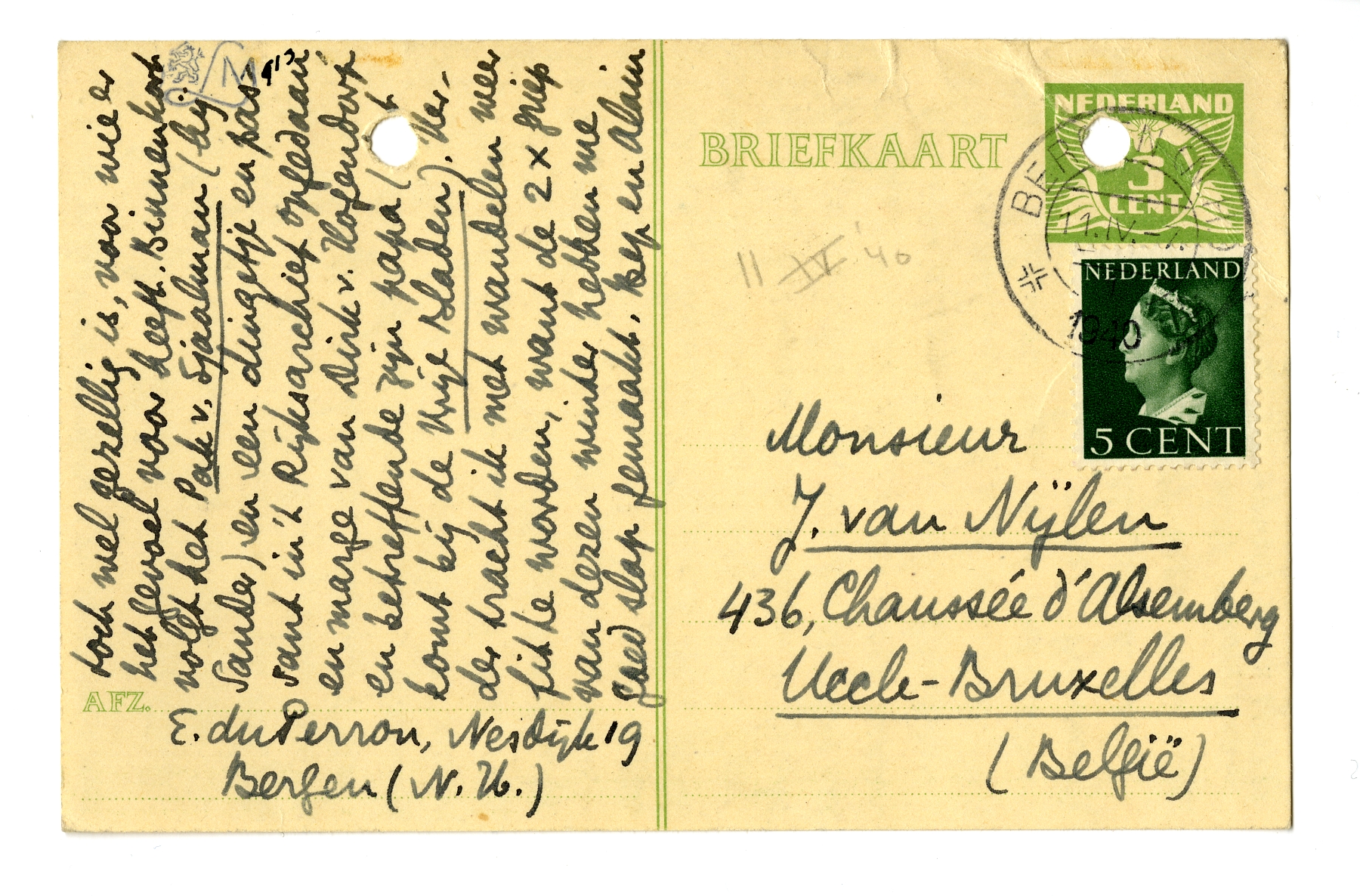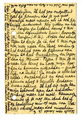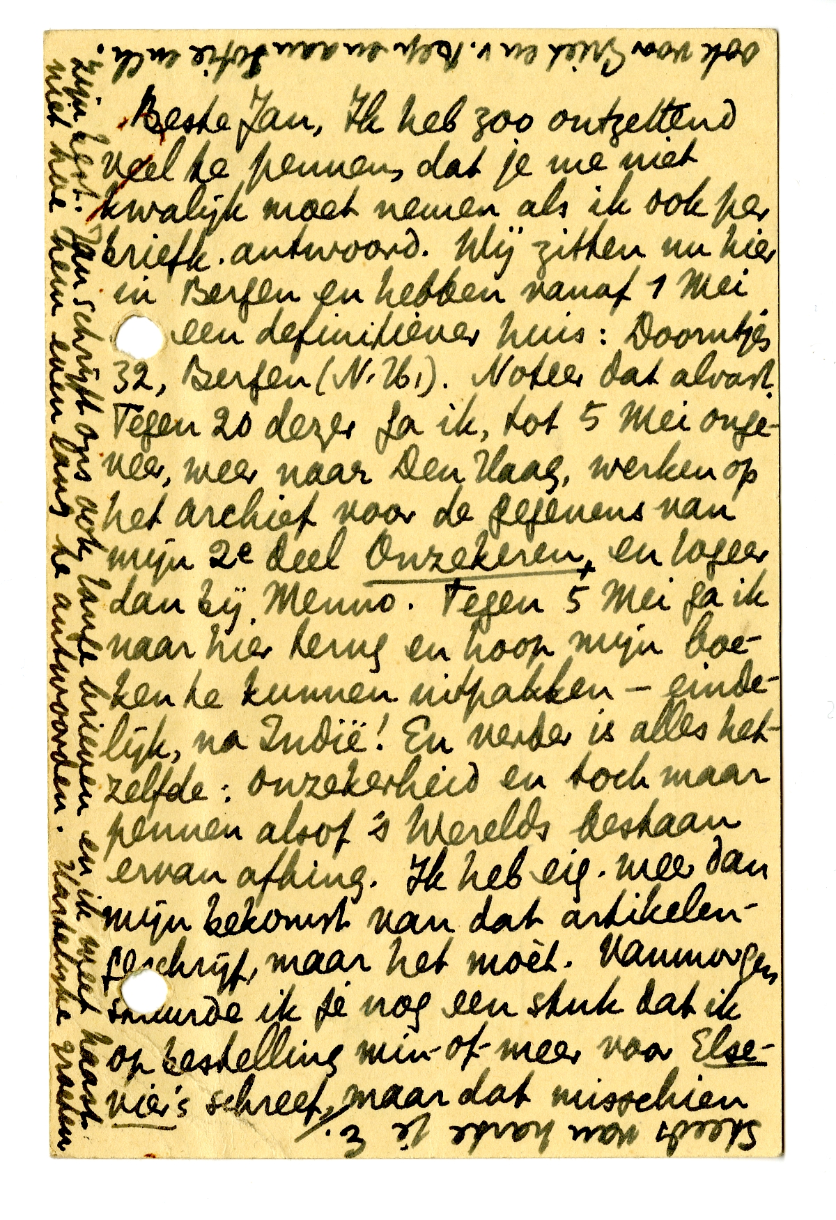 Beste Jan, Ik heb zoo ontzettend veel te pennen, dat je me niet kwalijk moet nemen als ik ook per briefk. antwoord. Wij zitten nu hier in Bergen en hebben vanaf 1 Mei een definitiever huis: Doorntjes 32, Bergen (N.H.). Noteer dat alvast. Tegen 20 dezer ga ik, tot 5 Mei ongeveer, weer naar Den Haag, werken op het Archief voor de gegevens van mijn 2e deel Onzekeren, en logeer dan bij Menno. Tegen 5 Mei ga ik naar hier terug en hoop mijn boeken te kunnen uitpakken - eindelijk, na Indië! En verder is alles hetzelfde: onzekerheid en toch maar pennen alsof 's Werelds bestaan ervan afhing. Ik heb eig. meer dan mijn bekomst van dat artikelen-geschrijf, maar het moèt. Vanmorgen stuurde ik je nog een stuk dat ik op bestelling min-of-meer voor Elsevier's schreef, maar dat misschien toch wel gezellig is, voor wie er het gevoel voor heeft. Binnenkort volgt het Pak v. Sjaalman (bij Sander) en een dingetje en passant in 't Rijksarchief opgedaan, en marge van Dirk v. Hogendorp en betreffende zijn papa (dat komt bij de Vrije Bladen). Verder tracht ik met wandelen weer fit te worden, want de 2 × griep van dezen winter hebben me goed slap gemaakt. Bep en Alain zijn best. Jan schrijft ons ook lange brieven en ik weet haast niet hoe hem even lang te antwoorden. Hartelijke groeten ook voor Griet en v. Bep en aan Sofie en Ch. Steeds van harte je