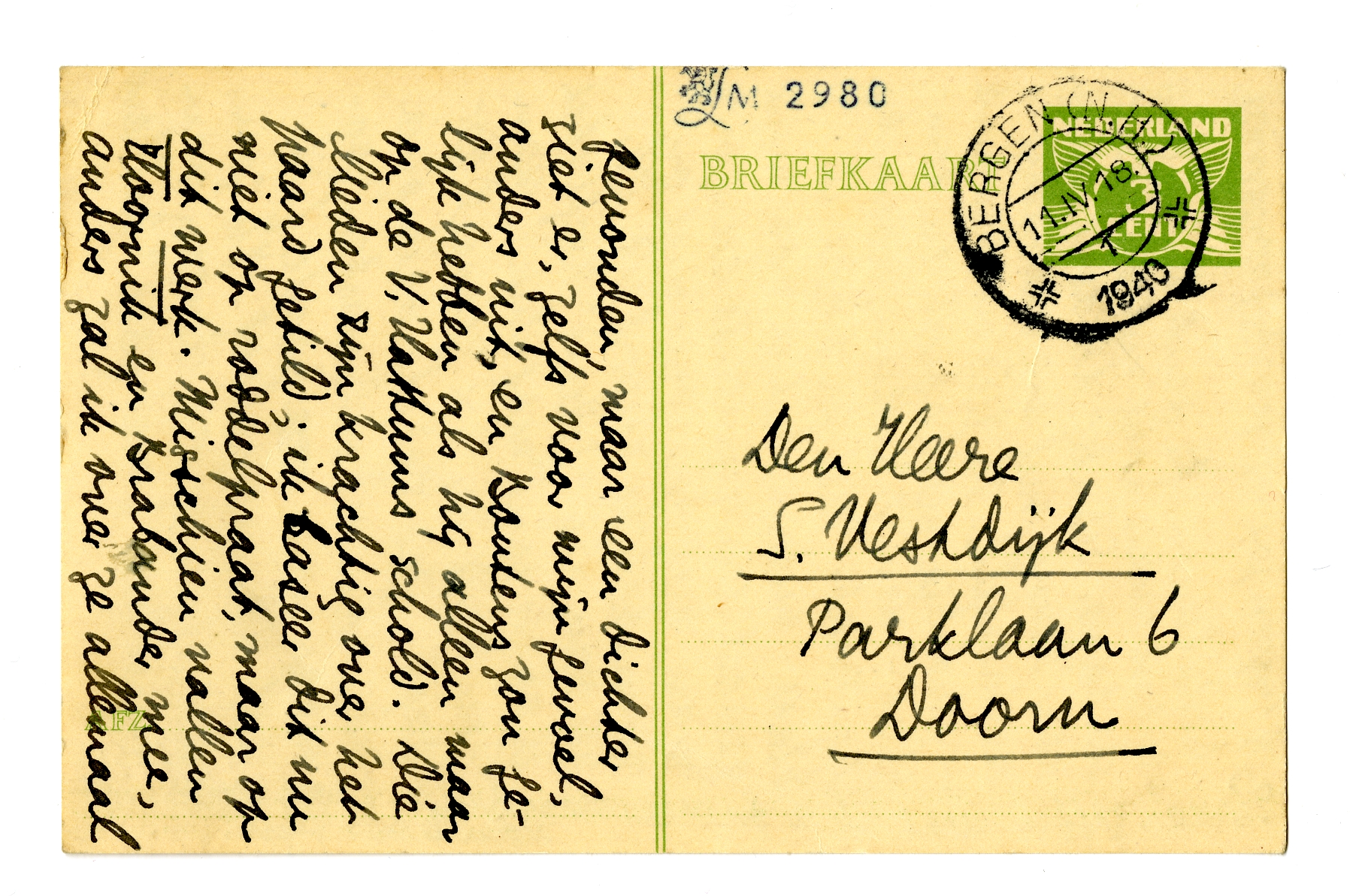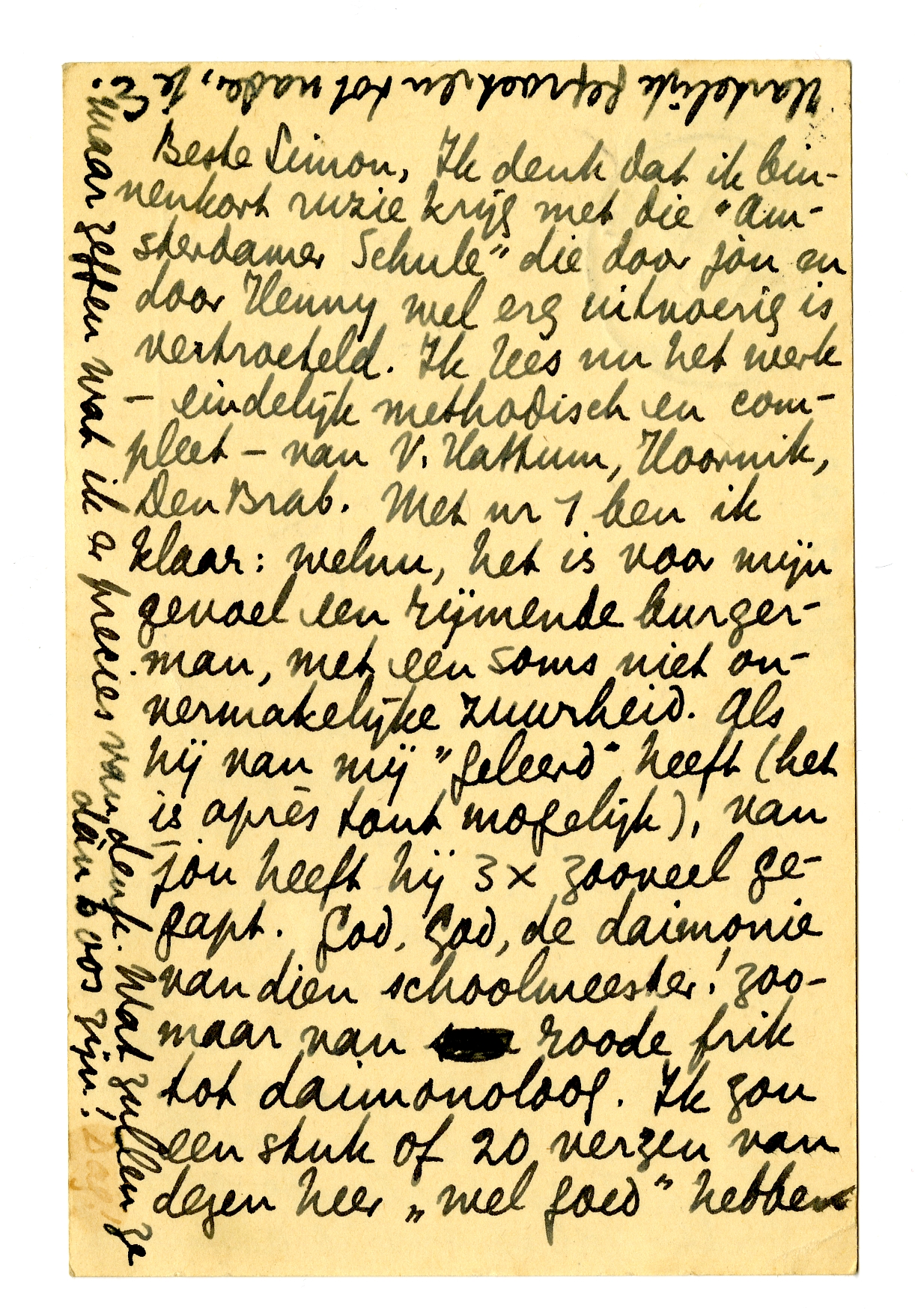 Beste Simon, Ik denk dat ik binnenkort ruzie krijg met die ‘Amsterdamer Schule’ die door jou en door Henny wel erg uitvoerig is vertroeteld.6911 Ik lees nu het werk - eindelijk methodisch en compleet - van V. Hattum, Hoornik, Den Brab. Met nr 1 ben ik klaar: welnu, het is voor mijn gevoel een rijmende burgerman, met een soms niet onvermakelijke zuurheid. Als hij van mij ‘geleerd’ heeft (het is après tout mogelijk), van jou heeft hij 3 × zooveel gegapt. God, God, de daimonie van dien schoolmeester! zoomaar van roode frik tot daimonoloog. Ik zou een stuk of 20 verzen van dezen heer ‘wel goed’ hebben gevonden, maar een dichter ziet er, zelfs voor mijn gevoel, anders uit, en Boutens zou gelijk hebben6912 als hij alleen maar op de V. Hattums schold. Die lieden zijn krachtig over het paard getild; ik baseer dit nu niet op roddelpraat, maar op dit werk. Misschien vallen Hoornik en Brabander mee, anders zal ik over ze allemaal maar zeggen wat ik er precies van denk.6913 Wat zullen ze dàn boos zijn!