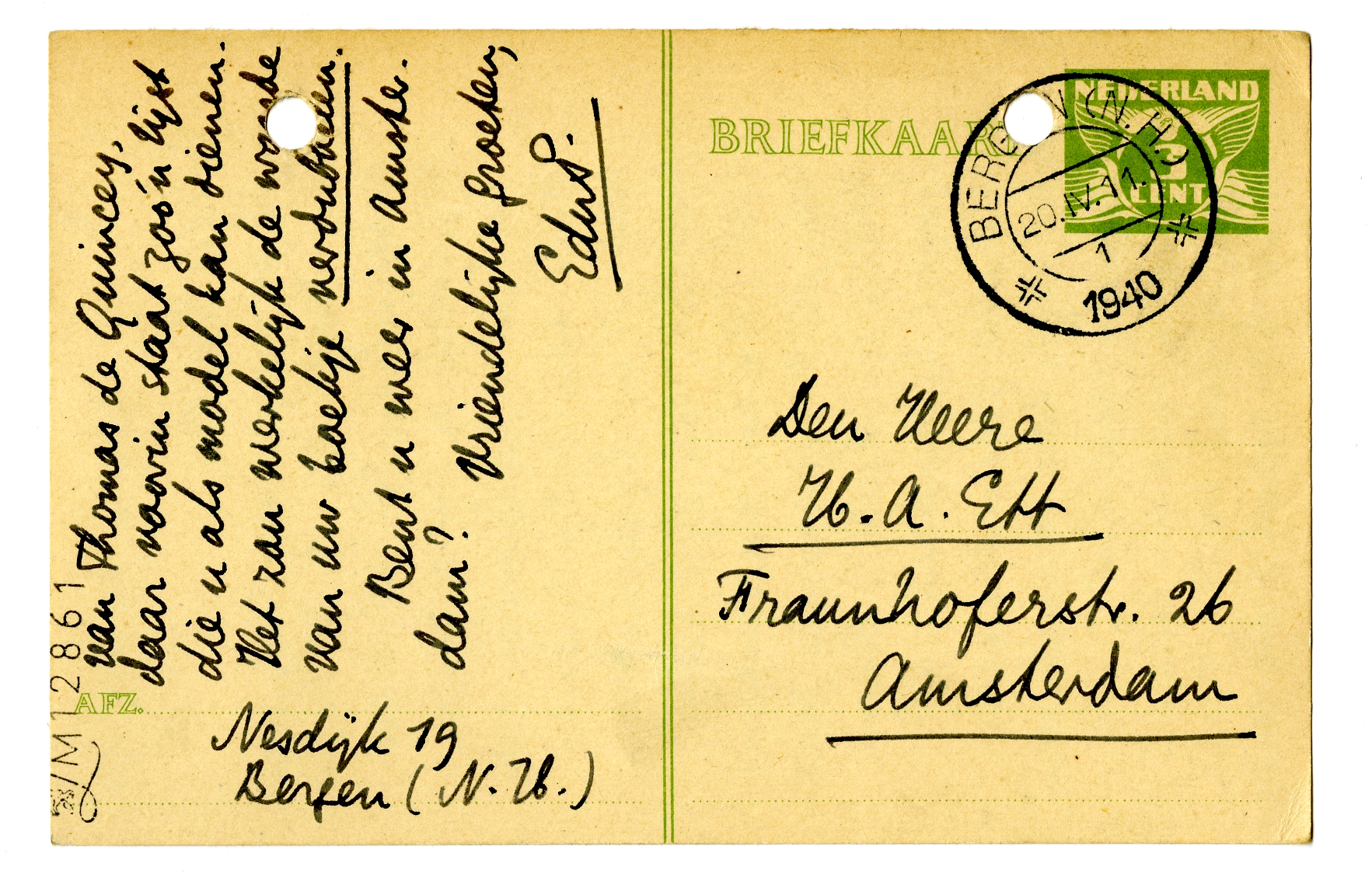 Ik ga morgen van hier naar Den Haag, p/a Dr. M. ter Br. Kraaienlaan 36. Ik vergat nog steeds u iets te zeggen: uw lijst v. publicaties over Mult. zou erbij winnen wanneer u, bijwijze van parallel, een lijst erbij deed (8 blzn. maximum) van de voornaamste jaartallen in Mult.'s leven. Zoowel biografische als literaire gebeurtenissen: dus ‘werkt aan Minnebrieven’, ‘Minnebr. verschijnt’, etc. - ‘Vlucht v. Tine nr Italië’. Kijkt u eens in een boekh. in de Nonesuch-press-editie van Thomas de Quincey,6951 daar voorin staat zoo'n lijst die u als model kan dienen. Het zou werkelijk de waarde van uw boekje verdubbelen.