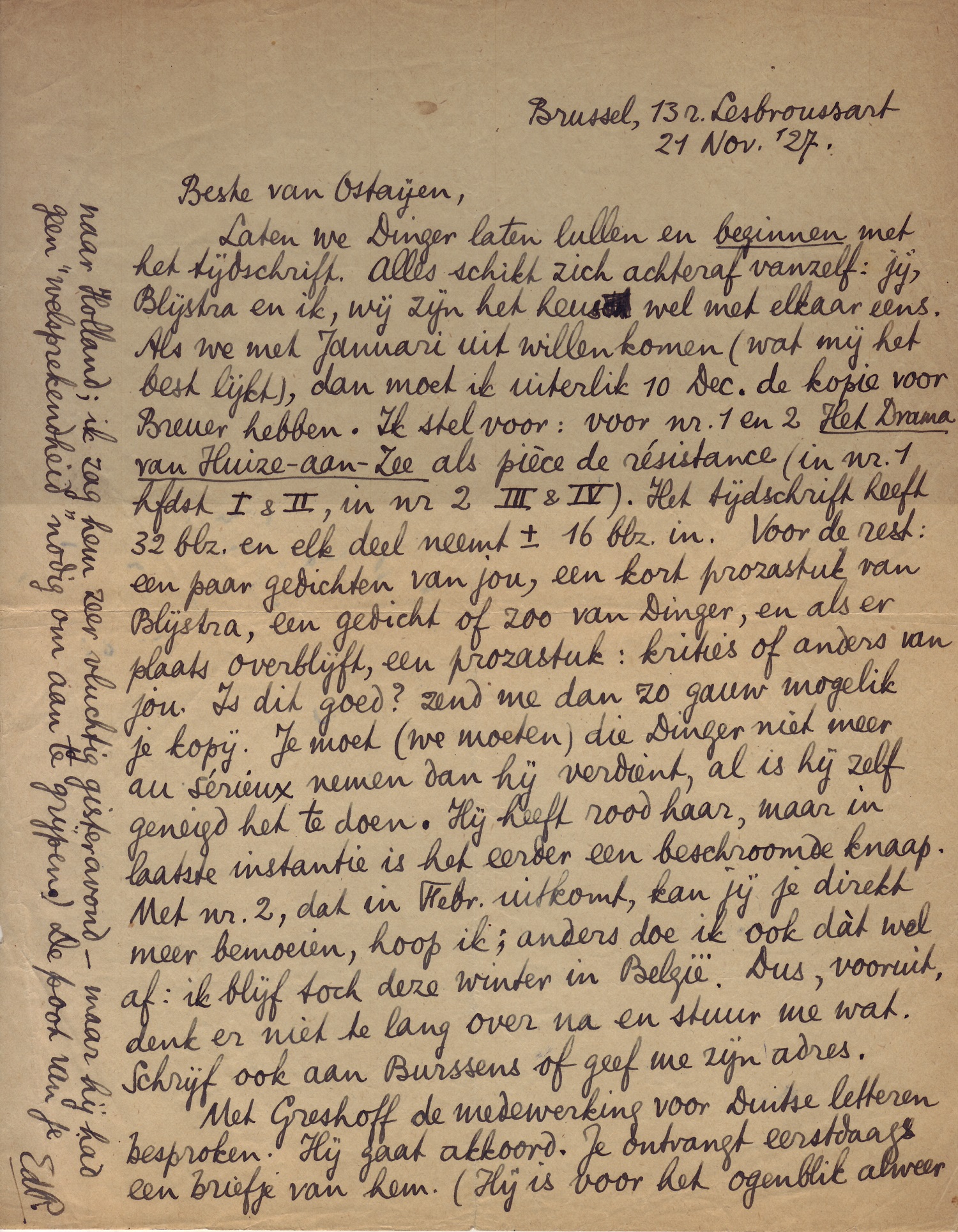Laten we Dinger laten lullen en beginnen met het tijdschrift.6993 Alles schikt zich achteraf vanzelf: jij, Blijstra en ik, wij zijn het heus wel met elkaar eens. Als we met Januari uit willen komen (wat mij het best lijkt), dan moet ik uiterlik 10 Dec. de kopie voor Breuer hebben. Ik stel voor: voor nr. 1 en 2 Het Drama van Huize-aan-Zee als pièce de résistance (in nr. 1 hfdst I & II, in nr 2 III & IV). Het tijdschrift heeft 32 blz. en elk deel neemt ± 16 blz. in. Voor de rest: een paar gedichten van jou, een kort prozastuk van Blijstra, een gedicht of zoo van Dinger, en als er plaats overblijft, een prozastuk: krities of anders van jou. Is dit goed? zend me dan zo gauw mogelik je kopij. Je moet (we moeten) die Dinger niet meer au sérieux nemen dan hij verdient, al is hij zelf geneigd het te doen. Hij heeft rood haar, maar in laatste instantie is het eerder een beschroomde knaap. Met nr. 2, dat in Febr. uitkomt, kan jij je direkt meer bemoeien, hoop ik; anders doe ik ook dàt wel af: ik blijf toch deze winter in België. Dus, vooruit, denk er niet te lang over na en stuur me wat. Schrijf ook aan Burssens6994 of geef me zijn adres.