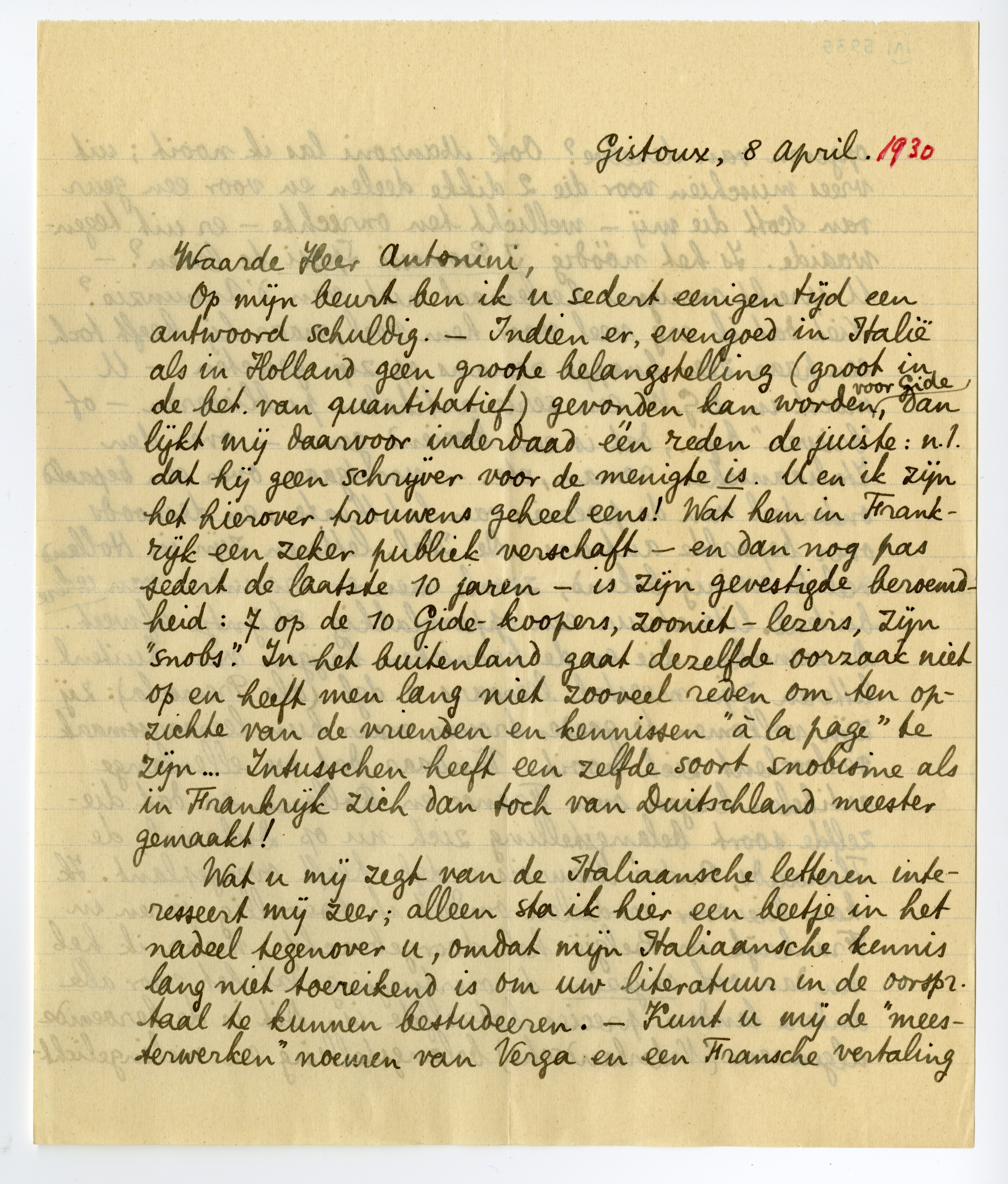 Op mijn beurt ben ik u sedert eenigen tijd een antwoord schuldig. - Indien er, evengoed in Italië als in Holland geen groote belangstelling (groot in de bet. van quantitatief) gevonden kan worden voor Gide,7029 dan lijkt mij daarvoor inderdaad één reden de juiste: n.l. dat hij geen schrijver voor de menigte is. U en ik zijn het hierover trouwens geheel eens! Wat hem in Frankrijk een zeker publiek verschaft - en dan nog pas sedert de laatste 10 jaren - is zijn gevestigde beroemdheid: 7 op de 10 Gide-koopers, zooniet-lezers, zijn ‘snobs’. In het buitenland gaat dezelfde oorzaak niet op en heeft men lang niet zooveel reden om ten opzichte van de vrienden en kennissen ‘à la page’ te zijn... Intusschen heeft een zelfde soort snobisme als in Frankrijk zich dan toch van Duitschland meester gemaakt!