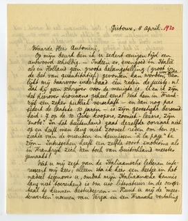 Wat u mij zegt van de Italiaansche letteren interesseert mij zeer; alleen sta ik hier een beetje in het nadeel tegenover u, omdat mijn Italiaansche kennis lang niet toereikend is om uw literatuur in de oorspr. taal te kunnen bestudeeren. - Kunt u mij de ‘meesterwerken’ noemen van Verga7030 en een Fransche vertaling opgeven van dezelve? Ook Manzoni las ik nooit; uit vrees misschien voor die 2 dikke deelen en voor een geur van Scott die mij - wellicht ten onrechte - er uit tegenwaaide. Is het nóódig I Promessi Sposi te lezen? - U spreekt overigens heelemaal niet van d'Annunzio? Niet dat ik erg veel voor hem voel, maar hij heeft toch een paar zeer knappe romans op zijn geweten. - U moest in D.G.W. een serie artikelen publiceeren7031 - of ‘brieven’ bijv., dat is een boeiend genre - over den Italiaanschen roman, etc. - voortgaan over een bepaald onderdeel van de poëzie; van het theater; en desnoods over bepaalde auteurs. De Ital. letteren zijn in Holland veel te weinig bekend; zooals men er trouwens van iedere buitenl. literatuur een oppervlakkig schijntje afweet. De menschen die er de kronieken krijgen van buitenl. letteren zijn meestal leeraars e, dgl. (als Premsela7032): zij zijn volkomen te goeder trouw, maar hun leeraarssmaak verloochent zich nooit. Vandaar dat we ellenlange artikelen kregen over France en Rolland, en dat diezelfde soort belangstelling zich nu op Duhamel, de Tharauds, André Maurois e. dgl. heeft overgeplant. Ik kan hierover oordeelen omdat ik toevallig jaren in Frankrijk en België heb doorgebracht; maar ik heb nu dan ook ongezien de overtuiging dat het voor alle andere landen precies hetzelfde is. Dit is de beroemde algemeene (Nederlandsche) belangstelling en welingelichtheid. Ze zijn er zoo tròtsch op, in de kleine lage landen, dat ze zoo bij zijn! En de jongeren, die ijveren voor hun ‘vitaliteit’, geven een nieuw woord voor een oude zaak, die nog altijd is: de Nederlandsche braafheid en weldenkendheid vóór alles. ‘We zullen om braafheid schreeuwen en stampvoeten, als de preektoon dan wèrkelijk uit de mode is.’7033