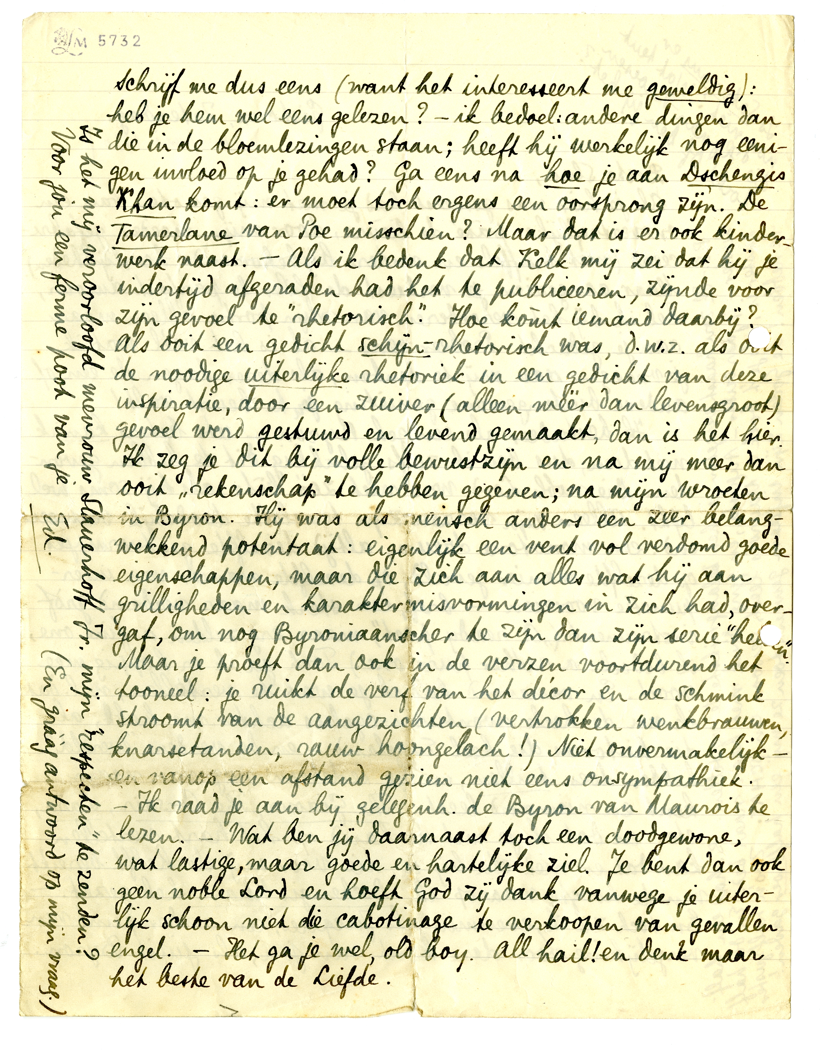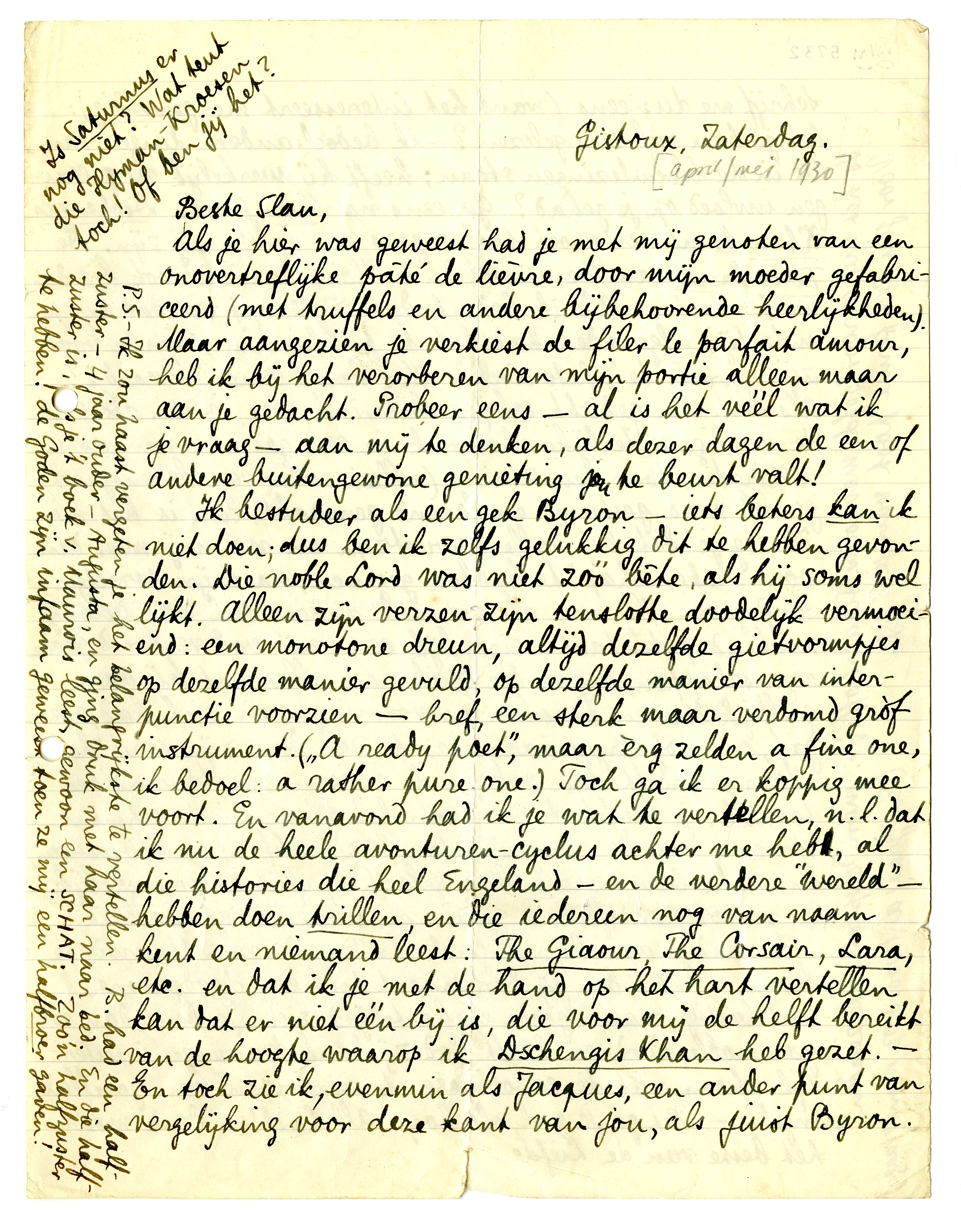 Ik bestudeer als een gek Byron7036 - iets beters kan ik niet doen; dus ben ik zelfs gelukkig dit te hebben gevonden. Die noble Lord was niet zóó bête, als hij soms wel lijkt. Alleen zijn verzen zijn tenslotte doodelijk vermoeiend: een monotone dreun, altijd dezelfde gietvormpjes op dezelfde manier gevuld, op dezelfde manier van interpunctie voorzien - bref, een sterk maar verdomd grof instrument. (‘A ready poet’, maar èrg zelden a fine one, ik bedoel: a rather pure one.) Toch ga ik er koppig mee voort. En vanavond had ik je wat te vertellen, n.l. dat ik nu de heele avonturen-cyclus achter me heb, al die histories die heel Engeland - en de verdere ‘wereld’ - hebben doen trillen, en die iedereen nog van naam kent en niemand leest: The Giaour, The Corsair, Lara etc. en dat ik je met de hand op het hart vertellen kan dat er niet één bij is, die voor mij de helft bereikt van de hoogte waarop ik Dschengis Khan heb gezet. - En toch zie ik, evenmin als Jacques, een ander punt van vergelijking voor deze kant van jou, als juist Byron. Schrijf me dus eens (want het interesseert me geweldig): heb je hem weleens gelezen? - ik bedoel: andere dingen dan die in de bloemlezingen staan; heeft hij werkelijk nog eenigen invloed op je gehad? Ga eens na hoe je aan Dschengis Khan komt: er moet toch ergens een oorsprong zijn. De Tamerlane van Poe misschien? Maar dat is er ook kinderwerk naast. - Als ik bedenk dat Kelk mij zei dat hij je indertijd afgeraden had het te publiceeren, zijnde voor zijn gevoel te ‘rhetorisch’. Hoe kòmt iemand daarbij? Als ooit een gedicht schijn-rhetorisch was, d.w.z. als ooit de noodige uiterlijke rhetoriek in een gedicht van deze inspiratie, door een zuiver (alleen méér dan levensgroot) gevoel werd gestuwd en levend gemaakt, dan is het hier. Ik zegje dit bij volle bewustzijn en na mij meer dan ooit ‘rekenschap’ te hebben gegeven; na mijn wroeten in Byron. Hij was als mensch anders een zeer belangwekkend potentaat: eigenlijk een vent vol verdomd goede eigenschappen, maar die zich aan alles wat hij aan grilligheden en karaktermisvormingen in zich had, overgaf, om nog Byroniaanscher te zijn dan zijn serie ‘helden’. Maar je proeft dan ook in de verzen voortdurend het tooneel: je ruikt de verf van het décor en de schmink stroomt van de aangezichten (vertrokken wenkbrauwen, knarsetanden, rauw hoongelach!) Niet onvermakelijk en vanop een afstand gezien niet eens onsympathiek. - Ik raad je aan bij gelegenh. de Byron van Maurois te lezen. - Wat ben jij daarnaast toch een doodgewone, wat lastige, maar goede en hartelijke ziel. Je bent dan ook geen noble Lord en hoeft God zij dank vanwege je uiterlijk schoon niet die cabotinage te verkoopen van gevallen engel. - Het ga je wel, old boy: All hail! en denk maar het beste van de Liefde. Is het mij veroorloofd mevrouw Slauerhoff Jr.7037 mijn ‘respecten’ te zenden? Voor jou een ferme poot van je