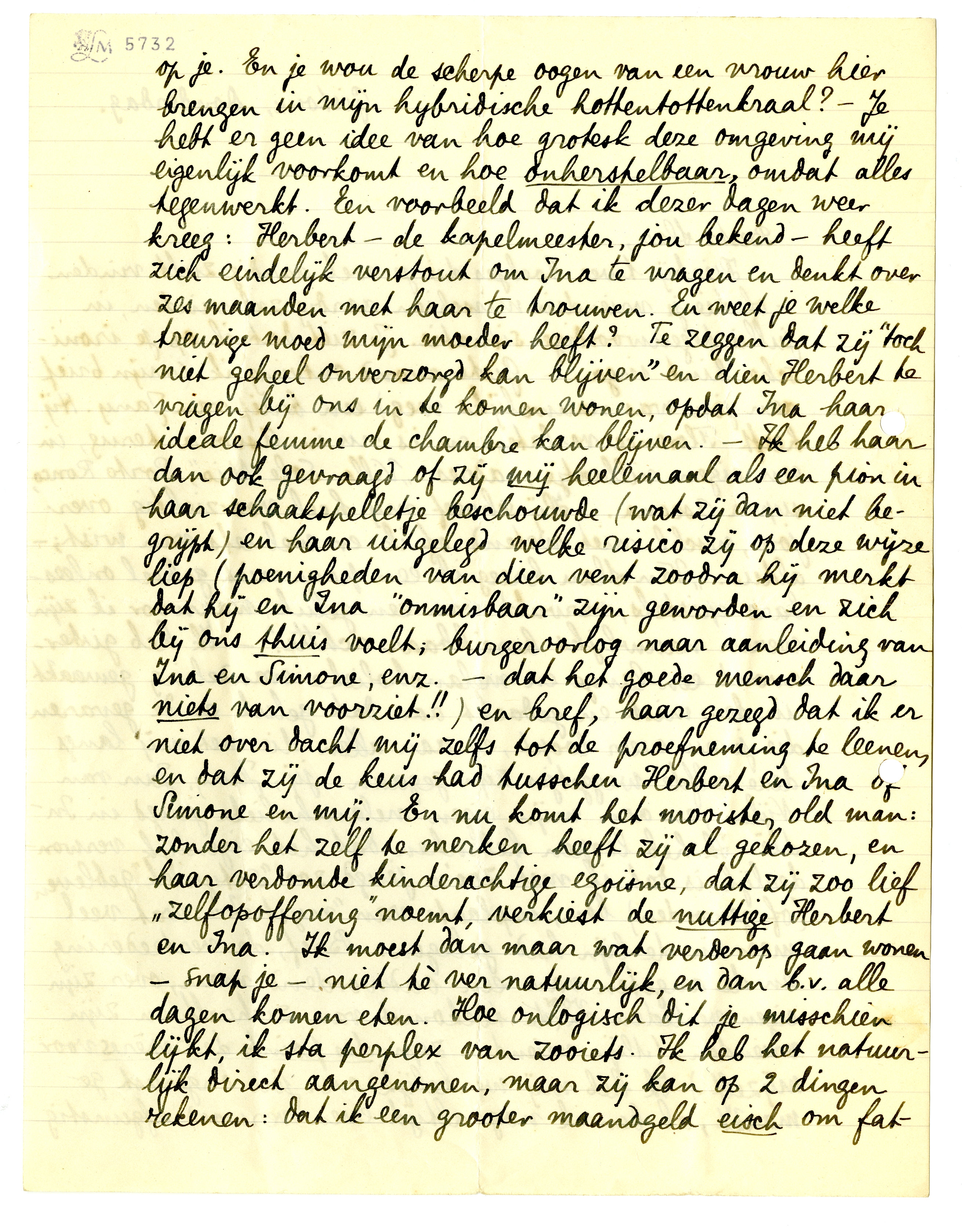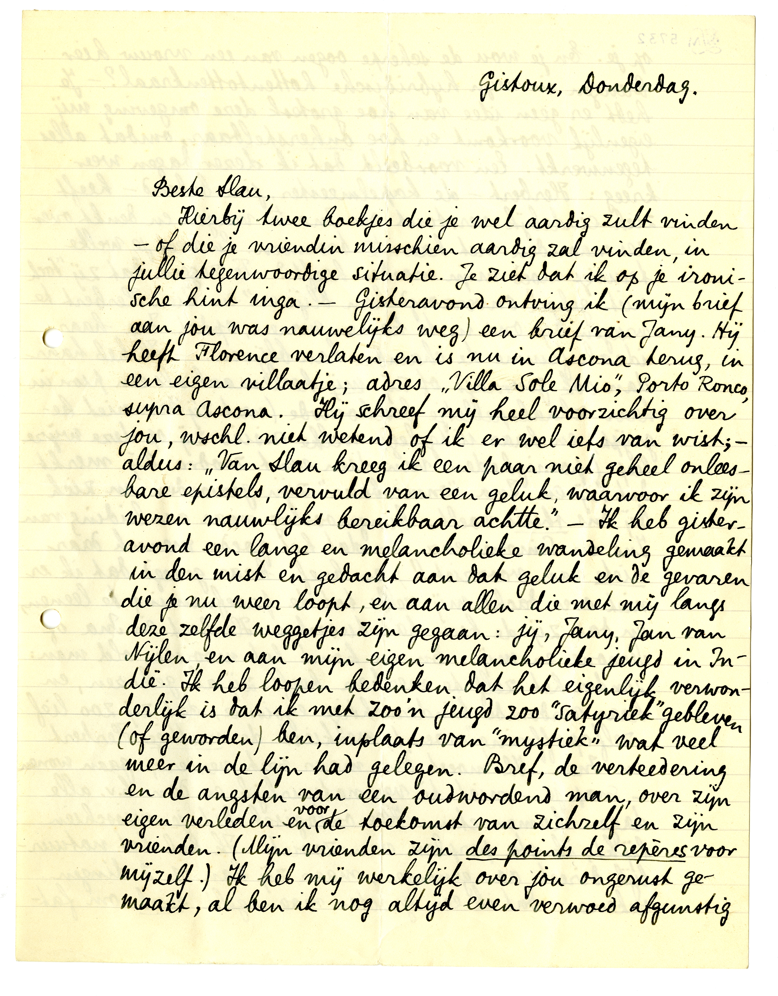 Hierbij twee boekjes die je wel aardig zult vinden - of die je vriendin misschien aardig zal vinden, in jullie tegenwoordige situatie. Je ziet dat ik op je ironische hint inga. - Gisteravond ontving ik (mijn brief aan jou7040 was nauwelijks weg) een brief van Jany. Hij heeft Florence verlaten en is nu in Ascona terug, in een eigen villaatje; adres ‘Villa Sole Mio’, Porto Ronco, supra Ascona.7041 Hij schreef mij heel voorzichtig over jou, wschl. niet wetend of ik er wel iets van wist; - aldus: ‘Van Slau kreeg ik een paar niet geheel onleesbare epistels, vervuld van een geluk, waarvoor ik zijn wezen nauwlijks bereikbaar achtte.’ - Ik heb gisteravond een lange en melancholieke wandeling gemaakt in den mist en gedacht aan dat geluk en de gevaren die je nu weer loopt, en aan allen die met mij langs deze zelfde weggetjes zijn gegaan: jij, Jany, Jan van Nijlen, en aan mijn eigen melancholieke jeugd in Indië. Ik heb loopen bedenken dat het eigenlijk verwonderlijk is dat ik met zoo'n jeugd zoo ‘satyriek’ gebleven (of geworden) ben, inplaats van ‘mystiek’ wat veel meer in de lijn had gelegen. Bref, de verteedering en de angsten van een oudwordend man, over zijn eigen verleden en voor de toekomst van zichzelf en zijn vrienden. (Mijn vrienden zijn des points de repères voor mijzelf.) Ik heb mij werkelijk over jou ongerust gemaakt, al ben ik nog altijd even verwoed afgunstig op je. En je wou de scherpe oogen van een vrouw hier brengen in mijn hybridische hottentottenkraal?7042 - Je hebt er geen idee van hoe grotesk deze omgeving mij eigenlijk voorkomt en hoe onherstelbaar, omdat alles tegenwerkt. Een voorbeeld dat ik dezer dagen weer kreeg: Herbert - de kapelmeester, jou bekend - heeft zich eindelijk verstout om Ina te vragen en denkt over zes maanden met haar te trouwen. En weet je welke treurige moed mijn moeder heeft? Te zeggen dat zij ‘toch niet geheel onverzorgd kan blijven’ en dien Herbert te vragen bij ons in te komen wonen, opdat Ina haar ideale femme de chambre kan blijven. - Ik heb haar dan ook gevraagd of zij mij heelemaal als een pion in haar schaakspelletje beschouwde (wat zij dan niet begrijpt) en haar uitgelegd welke risico zij op deze wijze liep (poenigheden van dien vent zoodra hij merkt dat hij en Ina ‘onmisbaar’ zijn geworden en zich bij ons thuis voelt; burgeroorlog naar aanleiding van Ina en Simone, enz. - dat het goede mensch daar niets van voorziet!!) en bref, haar gezegd dat ik er niet over dacht mij zelfs tot de proefneming te leenen, en dat zij de keus had tusschen Herbert en Ina of Simone en mij. En nu komt het mooiste, old man: zonder het zelf te merken heeft zij al gekozen, en haar verdomde kinderachtige egoïsme, dat zij zoo lief ‘zelfopoffering’ noemt, verkiest de nuttige Herbert en Ina. Ik moest dan maar wat verderop gaan wonen - snap je - niet tè ver natuurlijk, en dan b.v. alle dagen komen eten. Hoe onlogisch dit je misschien lijkt, ik sta perplex van zooiets. Ik heb het natuurlijk direct aangenomen, maar zij kan opa dingen rekenen: dat ik een grooter maandgeld eisch om fatsoenlijk te kunnen leven en dat zij mij niet dan zéér sporadisch aan haar tafel zal zien. Ik schrijf deze inane historie voor je op, om je een kijk te geven op wat er achter ligt. En ik kan die goeie moeder van me niet eens verwijten doen, ik vind het alleen zoo teekenend en zoo alles-verklarend, deze klakkelooze preferentie van een nieuwen duvelstoejager en beproefde lijfmeid.