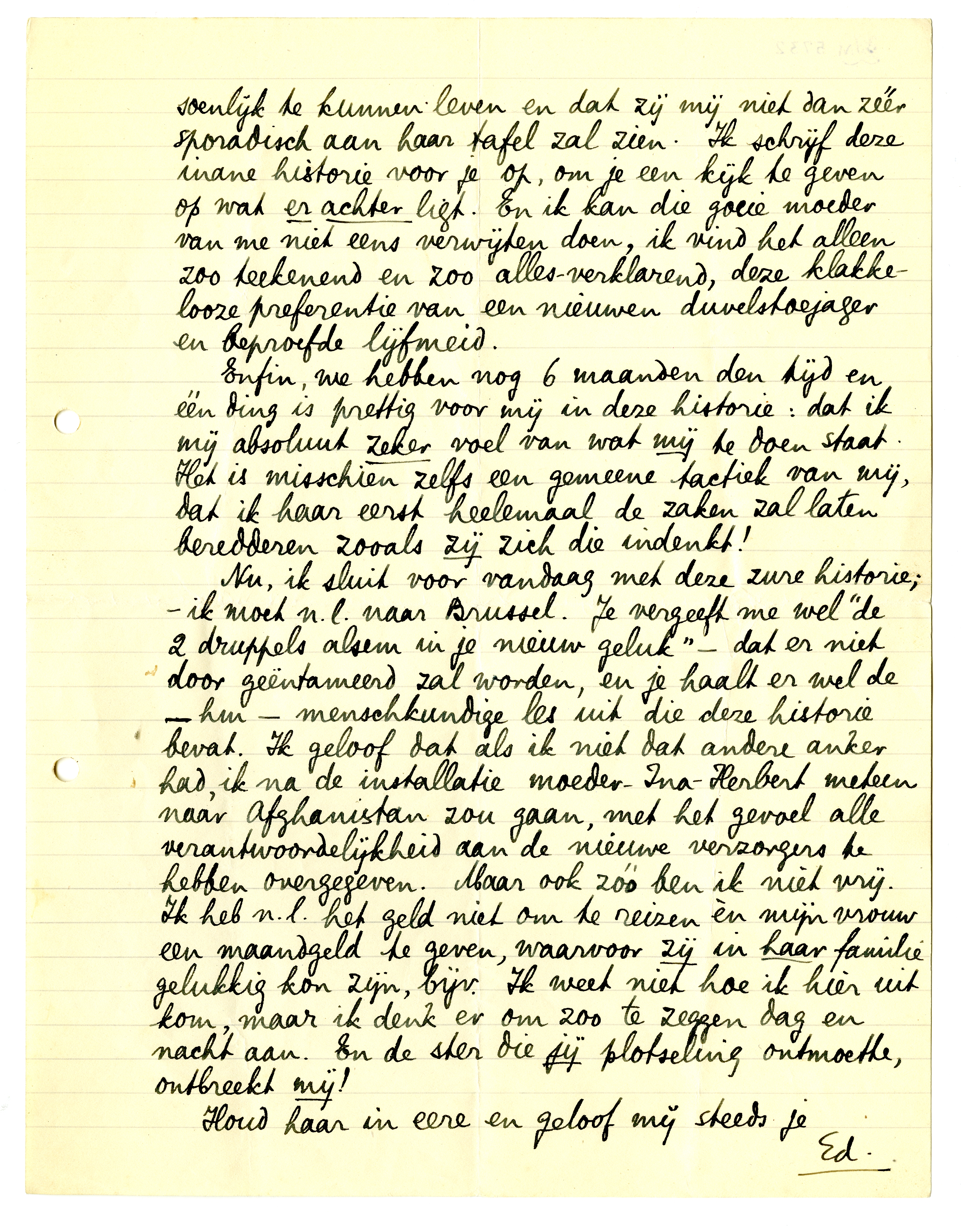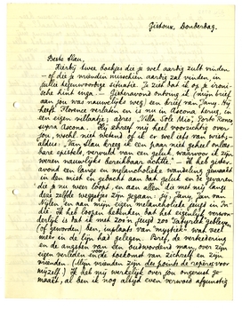 Nu, ik sluit voor vandaag met deze zure historie; - ik moet n.l. naar Brussel. Je vergeeft me wel ‘de 2 druppels alsem in je nieuwe geluk’ - dat er niet door geëntameerd zal worden, en je haalt er wel de - hm - menschkundige les uit die deze historie bevat. Ik geloof dat als ik niet dat andere anker had, ik na de installatie moeder-Ina-Herbert meteen naar Afghanistan7043 zou gaan, met het gevoel alle verantwoordelijkheid aan de nieuwe verzorgers te hebben overgegeven. Maar ook zóó ben ik niet vrij. Ik heb n.l. het geld niet om te reizen èn mijn vrouw een maandgeld te geven, waarvoor zij in haar familie gelukkig kon zijn, bijv. Ik weet niet hoe ik hier uit kom, maar ik denk er om zoo te zeggen dag en nacht aan. En de ster die jij plotseling ontmoette, ontbreekt mij!