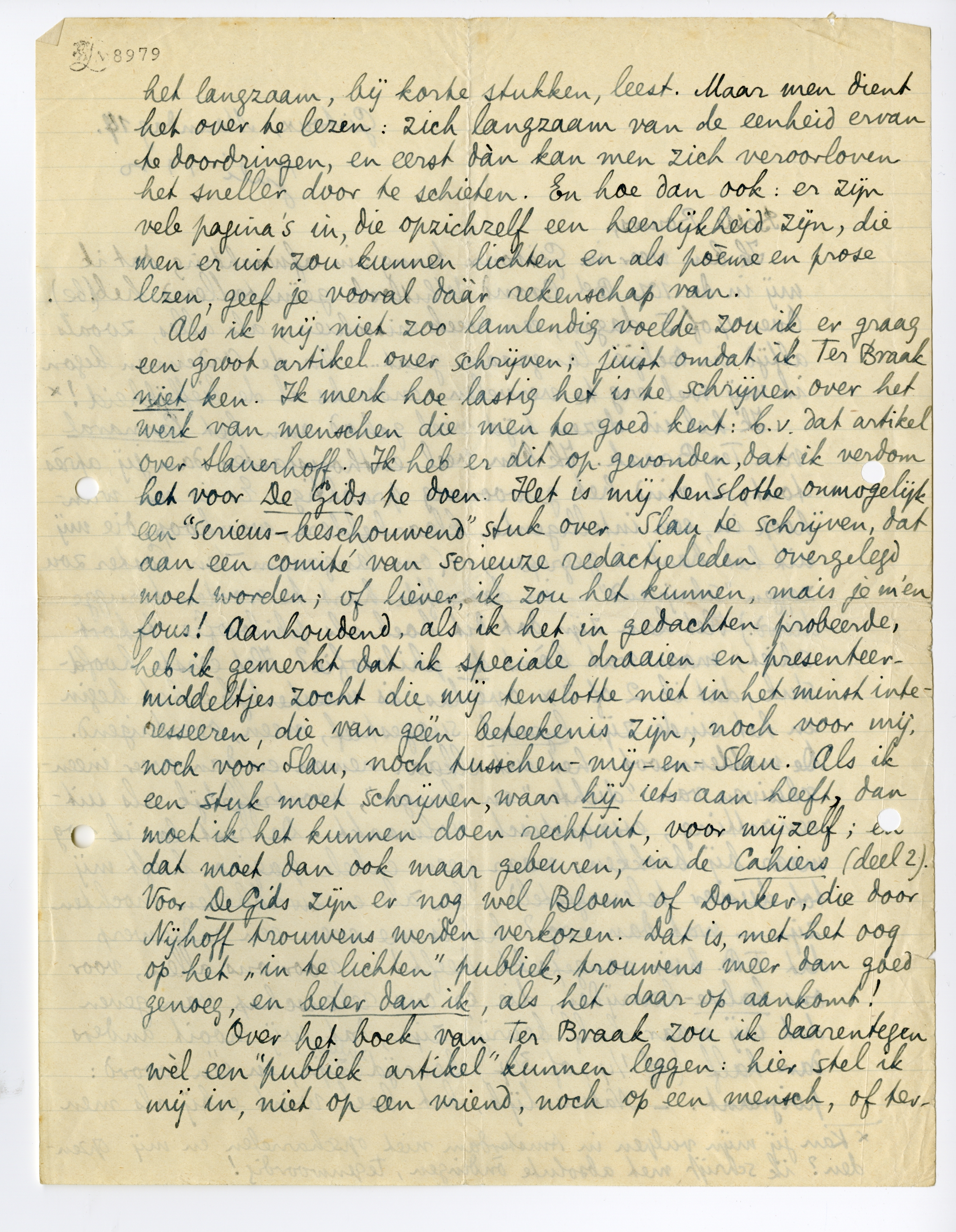 Als ik mij niet zoo lamlendig voelde zou ik er graag een groot artikel over schrijven; juist omdat ik Ter Braak niet ken. Ik merk hoe lastig het is te schrijven over het werk van menschen die men te goed kent: b.v. dat artikel over Slauerhoff. Ik heb er dit op gevonden, dat ik verdom het voor De Gids te doen. Het is mij tenslotte onmogelijk een ‘serieus-beschouwend’ stuk over Slau te schrijven, dat aan een comité van serieuze redactieleden overgelegd moet worden; of liever, ik zou het kunnen, mais je m'en fous! Aanhoudend, als ik het in gedachten probeerde, heb ik gemerkt dat ik speciale draaien en presenteermiddeltjes zocht die mij tenslotte niet in het minst interesseeren, die van géén beteekenis zijn, noch voor mij, noch voor Slau, noch tusschen-mij-en-Slau. Als ik een stuk moet schrijven, waar hij iets aan heeft, dan moet ik het kunnen doen rechtuit, voor mijzelf; en dat moet dan ook maar gebeuren, in de Cahiers (deel 2).7044 Voor De Gids zijn er nog wel Bloem of Donker, die door Nijhoff trouwens werden verkozen. Dat is, met het oog op het ‘in te lichten’ publiek, trouwens meer dan goed genoeg, en beter dan ik, als het daar op aankomt!