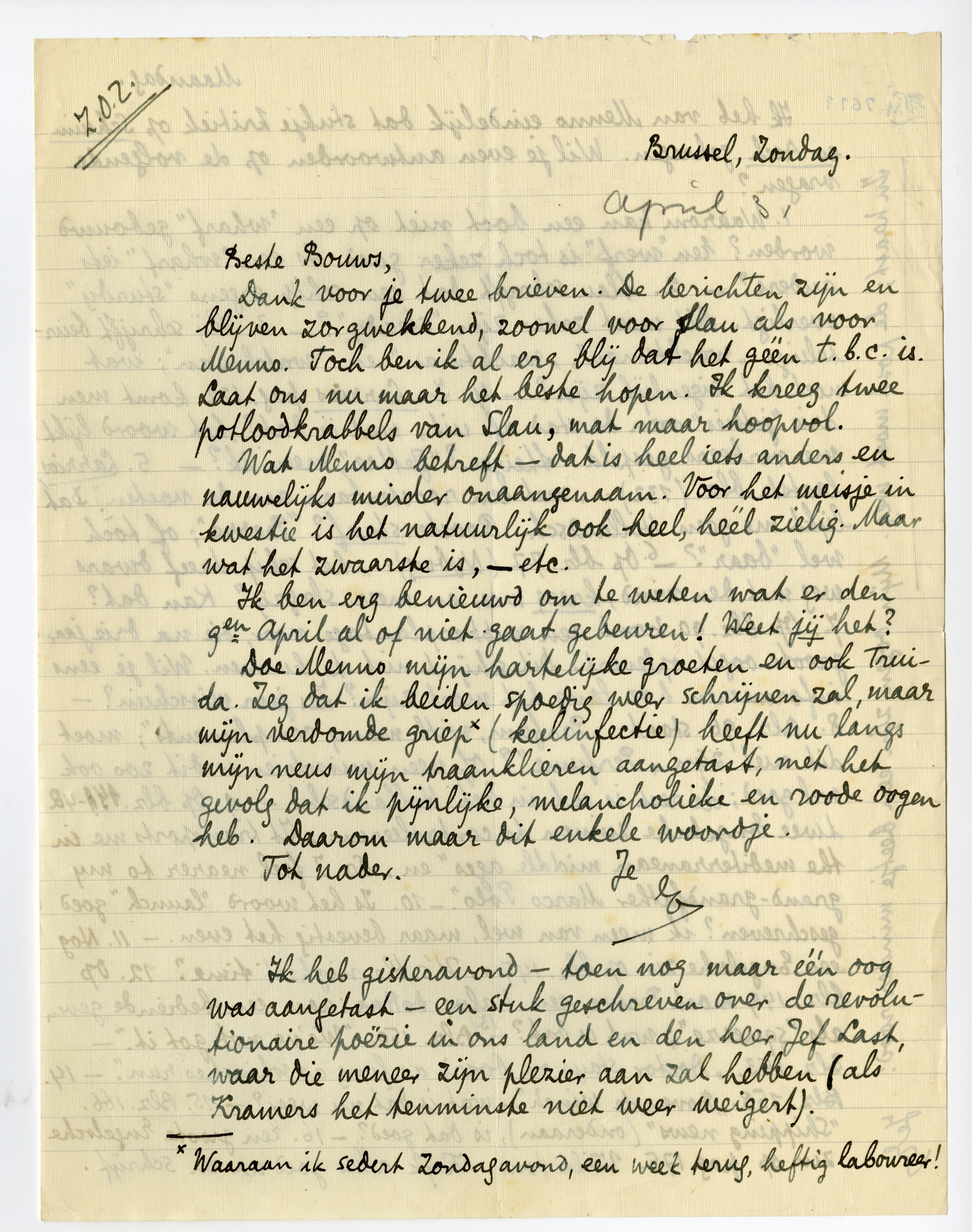 Doe Menno mijn hartelijke groeten en ook Truida. Zeg dat ik beiden spoedig weer schrijven zal, maar mijn verdomde griep* (keelinfectie) heeft nu langs mijn neus mijn traanklieren aangetast, met het gevolg dat ik pijnlijke, melancholieke en roode oogen heb. Daarom maar dit enkele woordje.