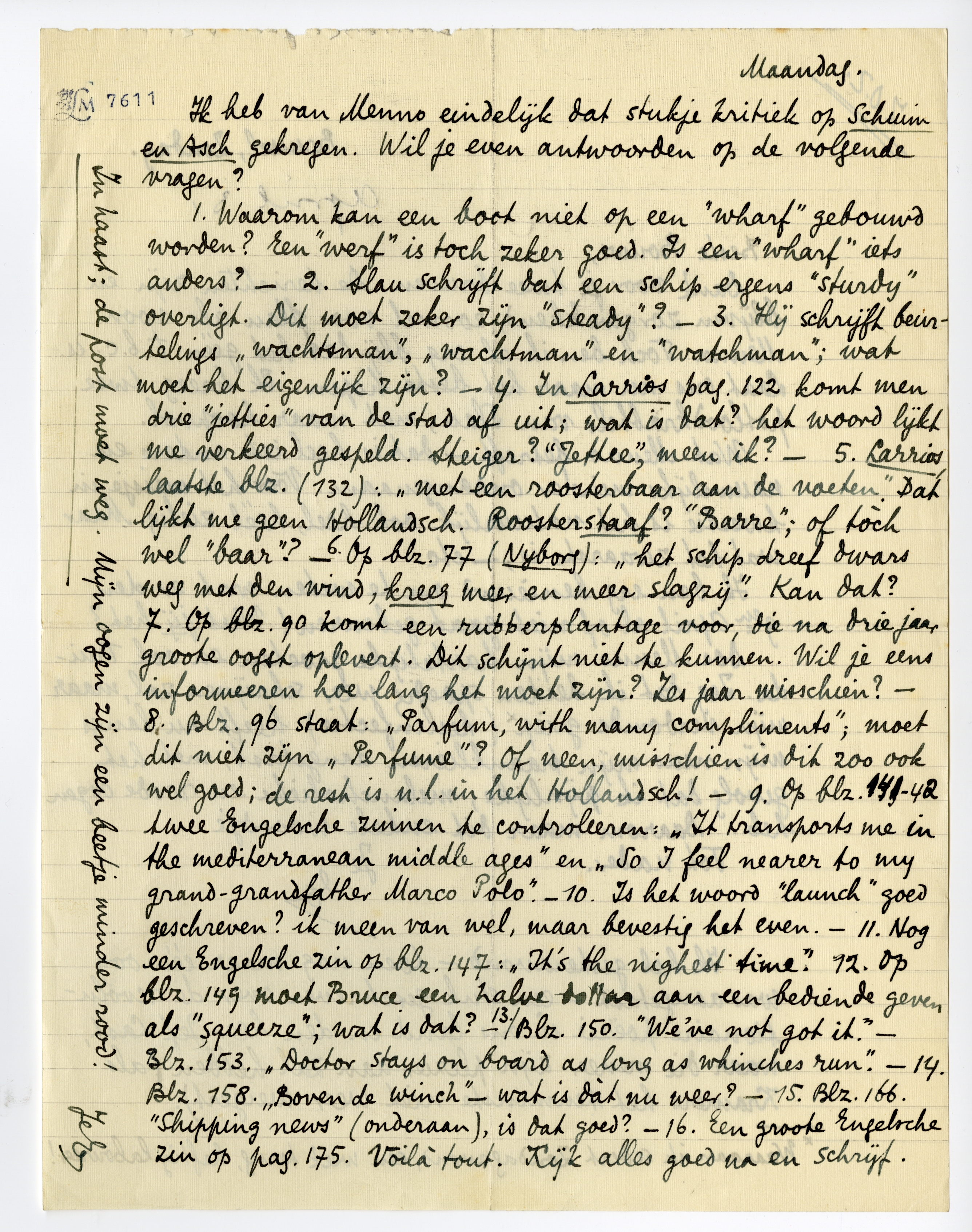 1. Waarom kan een boot niet op een ‘wharf’ gebouwd worden? Een ‘werf’ is toch zeker goed. Is een ‘wharf’ iets anders? - 2. Slau schrijft dat een schip ergens ‘sturdy’ overligt. Dit moet zeker zijn ‘steady’? - 3. Hij schrijft beurtelings ‘wachtsman’, ‘wachtman’ en ‘watchman’; wat moet het eigenlijk zijn? - 4. In Larrios pag. 122 komt men drie jetties’ van de stad af uit; wat is dat? het woord lijkt me verkeerd gespeld. Steiger? ‘Jettee’, meen ik? - 5. Larrios laatste blz. (132): ‘met een roosterbaar aan de voeten’. Dat lijkt me geen Hollandsch. Roosterstaaf? ‘Barre’; of tòch wel ‘baar’? - 6. Op blz. 77 (Nyborg): ‘het schip dreef dwars weg met den wind, kreeg meer en meer slagzij’. Kan dat? 7. Op blz. 90 komt een rubberplantage voor, die na drie jaar groote oogst oplevert. Dit schijnt niet te kunnen. Wil je eens informeeren hoe lang het moet zijn? Zes jaar misschien? - 8. Blz. 96 staat: ‘Parfum, with many compliments’; moet dit niet zijn ‘Perfume’? Of neen, misschien is dit zoo ook wel goed; de rest is n.l. in het Hollandsch! - 9. Op blz. 141-142 twee Engelsche zinnen te controleeren: ‘It transports me in the mediterranean middle ages’ en ‘So I feel nearer to my grand-grandfather Marco Polo’; - 10. Is het woord ‘launch’ goed geschreven? ik meen van wel, maar bevestig het even. - 11. Nog een Engelsche zin op blz. 147: ‘It's the nighest time’. 12. Op blz. 149 moet Bruce een halve dollar aan een bediende geven als ‘squeeze’; wat is dat? - 13. Blz. 150. ‘We've not got it’. - Blz. 153. ‘Doctor stays on board as long as whinches run’. - 14. Blz. 158. ‘Boven de winch’ - wat is dàt nu weer? - 15. Blz. 166. ‘Shipping news’ (onderaan), is dat goed? - 16. Een groote Engelsche zin op pag. 175. Voilà tout. Kijk alles goed na en schrijf.