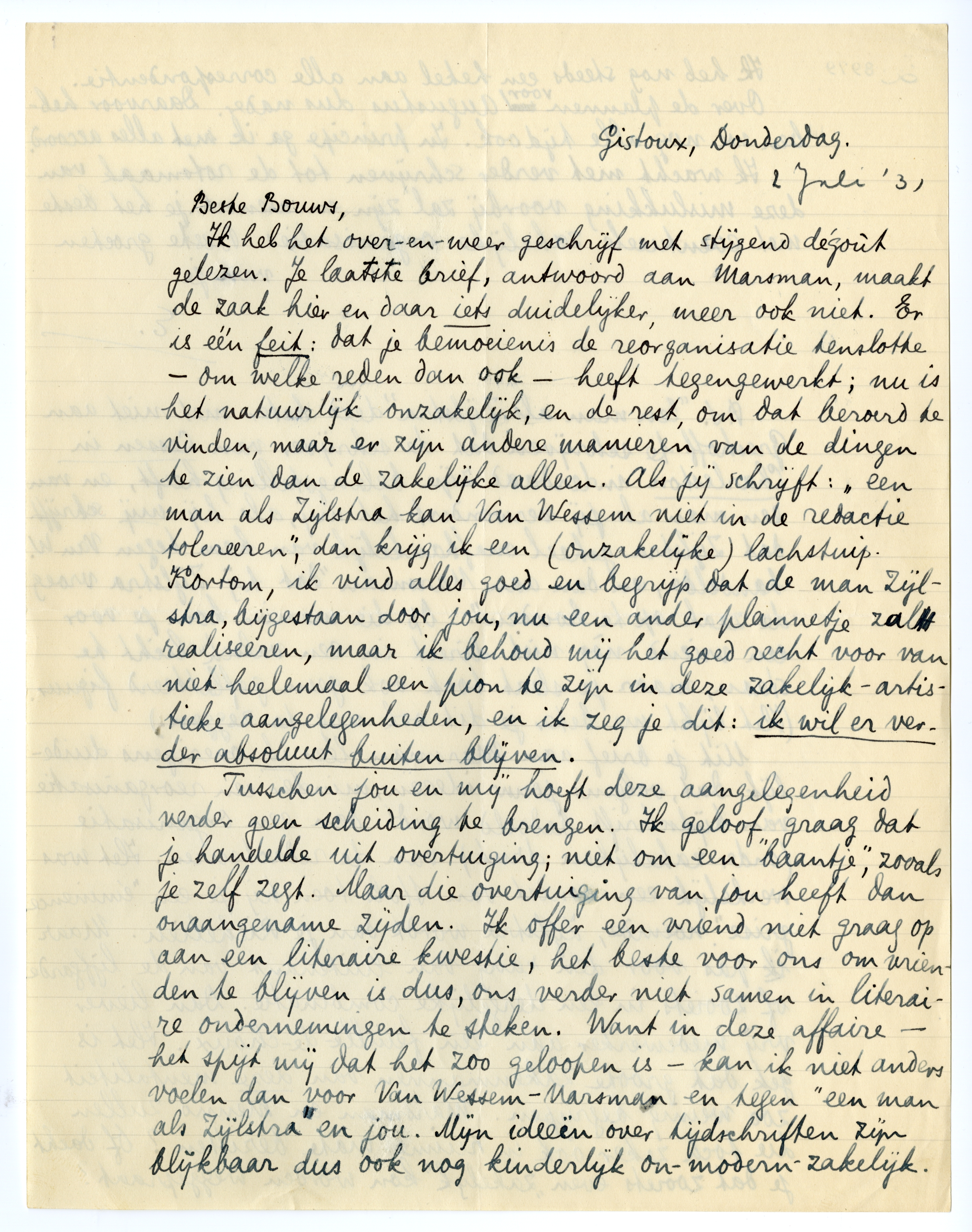 Ik heb het over-en-weer geschrijf met stijgend dégoût gelezen. Je laatste brief, antwoord aan Marsman, maakt de zaak hier en daar iets duidelijker, meer ook niet. Er is één feit: dat je bemoeienis de reorganisatie tenslotte - om welke reden dan ook - heeft tegengewerkt; nu is het natuurlijk onzakelijk, en de rest, om dat beroerd te vinden, maar er zijn andere manieren van de dingen te zien dan de zakelijke alleen. Als jij schrijft: ‘een man als Zijlstra kan Van Wessem niet in de redactie tolereeren’, dan krijg ik een (onzakelijke) lachstuip. Kortom, ik vind alles goed en begrijp dat de man Zijlstra, bijgestaan door jou, nu een ander plannetje zal realiseeren, maar ik behoud mij het goed recht voor van niet heelemaal een pion te zijn in deze zakelijk-artistieke aangelegenheden, en ik zegje dit: ik wil er verder absoluut buiten blijven.