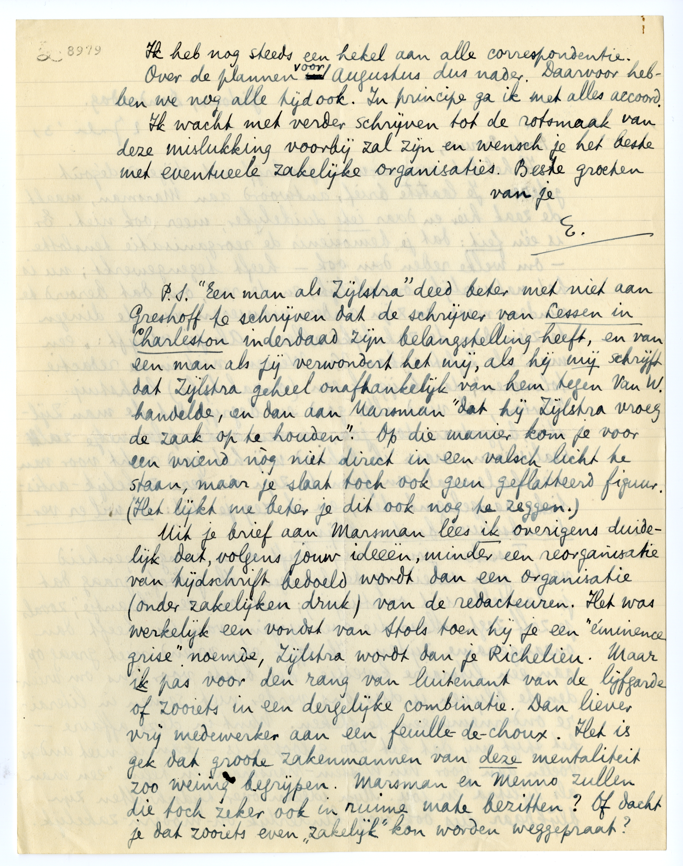 P.S. ‘Een man als Zijlstra’ deed beter met niet aan Greshoff te schrijven dat de schrijver van Lessen in Charleston inderdaad zijn belangstelling heeft, en van een man als jij verwondert het mij, als hij mij schrijft dat Zijlstra geheel onafhankelijk van hem tegen Van W. handelde, en dan aan Marsman ‘dat hij Zijlstra vroeg de zaak op te houden’. Op die manier kom je voor een vriend nòg niet direct in een valsch licht te staan, maar je slaat toch ook geen geflatteerd figuur. (Het lijkt me beter je dit ook nog te zeggen.)7097