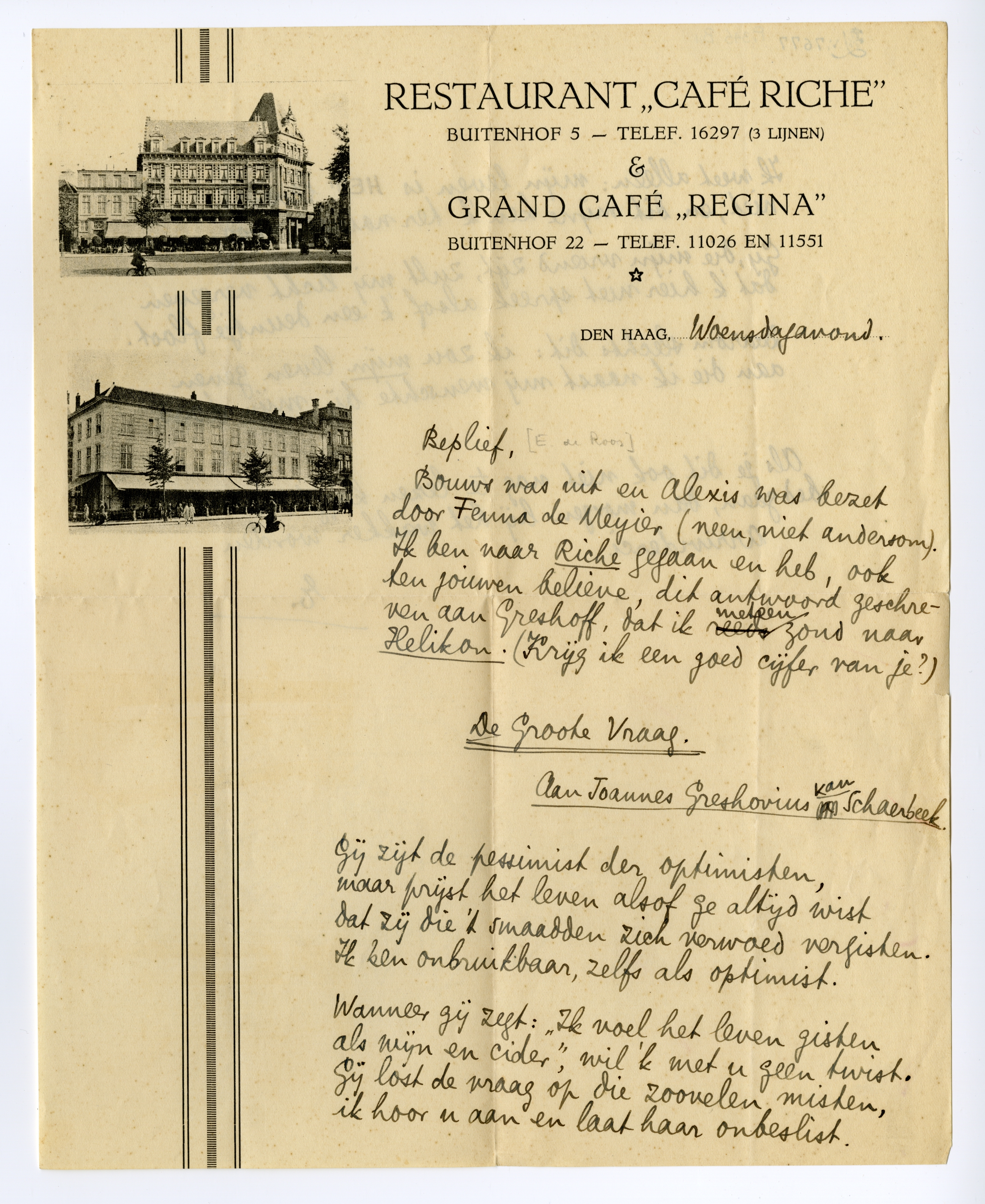 7134Geschreven op briefpapier van restaurant ‘Café Riche’ (Buitenhof 5) en grand café ‘Regina’ (Buitenhof 22).