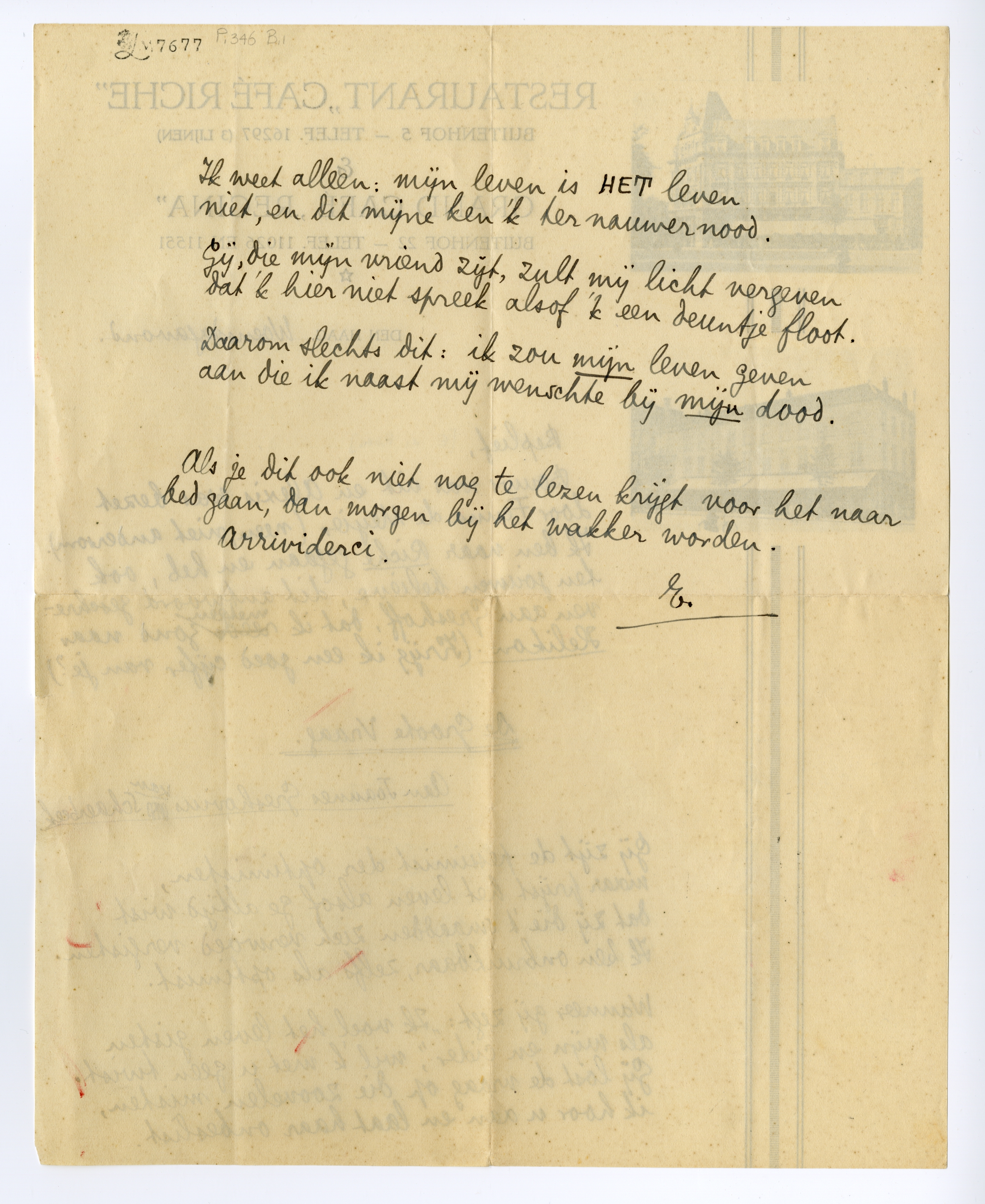 Bouws was uit en Alexis7135 was bezet door Fenna de Meyier7136 (neen, niet andersom). Ik ben naar Riche gegaan en heb, ook ten jouwen believe, dit antwoord7137 geschreven aan Greshoff, dat ik meteen zond naar Helikon. (Krijg ik een goed cijfer van je?)