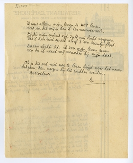 7138Geschreven op de achterzijde van een ongefrankeerde envelop, die geadresseerd was aan ‘Mejuffrouw Elisabeth de Roos (2e missive)’; de eerste is niet teruggevonden. DP koos met wijziging van ‘zou’ in ‘kon’ voor deze slotregel.