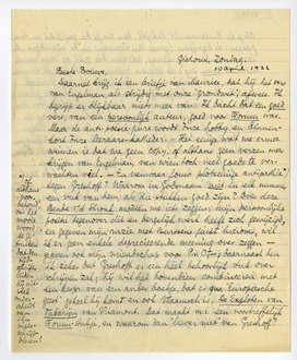 Daarnet krijg ik een briefje van Maurice, dat hij het vers van Engelman, als strijdig met onze ‘grondwet’, afwees.7139 Ik begrijp er blijkbaar niets meer van. Ik dacht dat een goed vers, van een persoonlijk auteur, goed voor Forum was. Maar de anti-poésie-pure wordt ònze hobby en binnenkort ònze leeraars-katheder. - Het eenige wat we ermee winnen is dat we geen copy, of althans geen verzen meer krijgen van Engelman, van wien toch veel goeds te verwachten viel. - En vanwaar jouw plotselinge antipathie* tegen Greshoff? Waarom in Godsnaam niet in elk nummer een stuk van hem, als die stukken goed zijn? Over deze Bende v/d Stronk moèten we iets zeggen; mijn persoonlijke positie tegenover dit en dergelijk werk heeft zich gewijzigd, en gegeven mijn ruzie met Burssens juist hierover, wil ik er geen enkele deprecieerende meening over zeggen - gegeven ook mijn vriendschap voor P.v.O. † -; daarnaast ben ik zeker dat Greshoff er een héél behoorlijk stuk over schrijven zal; hij wil het bovendien combineeren met een bespr. van een ander boekje, dat er qua ‘Europeesche geest’ geheel bij komt en ook Vlaamsch is, De Exploten van Tabarijn van Vriamont. Dat maakt m.i. een voortreffelijk Forum-stukje, en waarom dan ‘liever niet’ van Greshoff?7140 Als je de ‘buitenwereld’ bekijkt, dan zie je die gesplitst in twee groepen: de begrijpers (genre Van Leeuwen) en de vijandigen. De laatsten vinden mij, Menno, iedereen die zich op ‘onze manier’ uitdrukt even ‘erg’; de eersten ruimen, zooals je hebt kunnen zien, een goed plaatsje in voor Greshoff. Als wij Greshoff nu ook al zoo'n beetje afwijzend en uit de hoogte gaan behandelen, worden we idioot, d.w.z. aangestoken door een min-of-meer aesthetische literatoren-idiotie, waar we in Panopticum juist zoo tegen strijden. - En ook de liedjes van Greshoff, al schrijft hij dan misschien binnen zijn eigen productie wat te veel (dit is een ‘voorbehoud’ apart), blijven daarom toch niet minder, in het genre, van de beste!