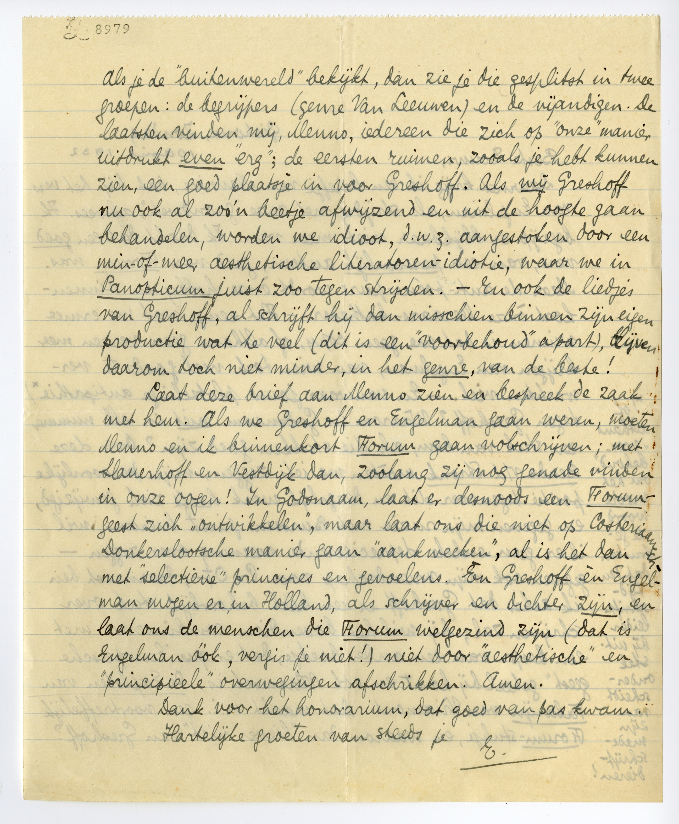 Laat deze brief aan Menno zien en bespreek de zaak met hem.7141 Als we Greshoff en Engelman gaan weren, moeten Menno en ik binnenkort Forum gaan volschrijven; met Slauerhoff en Vestdijk dan, zoolang zij nog genade vinden in onze oogen! In Godsnaam, laat er desnoods een Forum-geest zich ‘ontwikkelen’, maar laat ons die niet op Costeriaansch-Donkerslootsche manier gaan ‘aankweeken’, al is het dan met ‘selectieve’ principes en gevoelens. Èn Greshoff èn Engelman mogen er in Holland, als schrijver en dichter zijn, en laat ons de menschen die Forum welgezind zijn (dat is Engelman óók, vergis je niet!) niet door ‘aesthetische’ en ‘principieele’ overwegingen afschrikken. Amen.