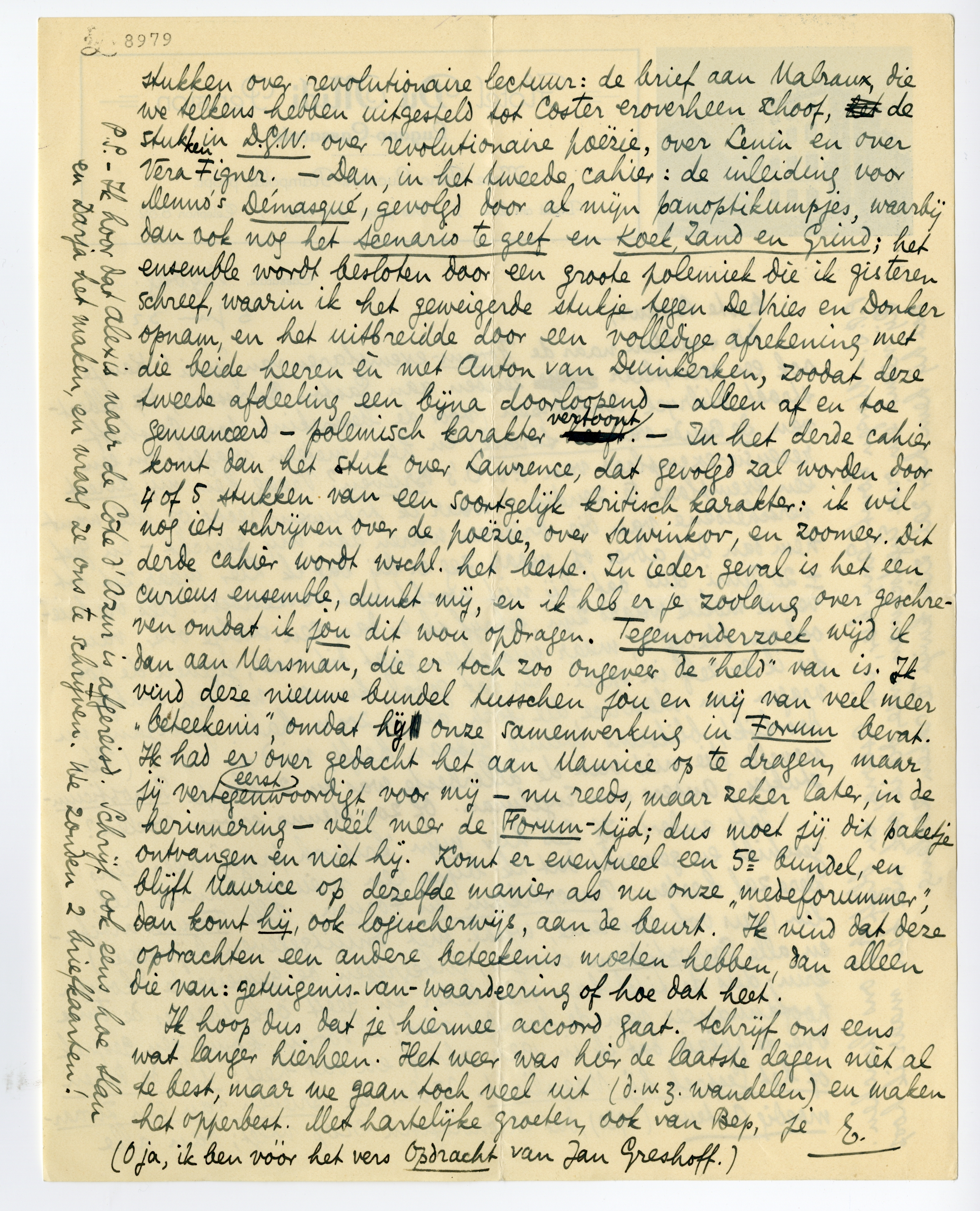 Iets anders. Ik heb hier mijn ‘kritisch proza’ weer eens geschikt en gemerkt dat ik bijna een nieuwe bundel heb. Deze zal heeten: Panoptikum en Forum. Alle Forum-artikelen (dus ook Lawrence, wschl. met onuitgegeven bijvoegsel) en alle Panoptikum-stukjes, inbegrepen de geweigerde, komen erin; dus de titel kan niet beter en geeft ook precies de twee hoofdnuances van de bundel aan! - Voorin komt een gesprek over de poëzie, dat ik in 1920 schreef en dat heet: Alle de Rozen of het Gesprek bij Maanlicht. Verder de Brieven van een Zwaarmoedig Auteur (1930), dat chronologisch erop volgt; dan alle stukken over revolutionaire lectuur: de brief aan Malraux die we telkens hebben uitgesteld tot Coster eroverheen schoof, de stukken in D.G.W. over revolutionaire poëzie, over Lenin en over Vera Figner. - Dan, in het tweede cahier: de inleiding voor Menno's Démasqué, gevolgd door al mijn panoptikumpjes, waarbij dan ook nog het Scenario te geef en Koek, Zand en Grind; het ensemble wordt besloten door een groote polemiek7151 die ik gisteren schreef, waarin ik het geweigerde stukje tegen De Vries en Donker opnam, en het uitbreidde door een volledige afrekening met die beide heeren èn met Anton van Duinkerken, zoodat deze tweede afdeeling een bijna doorloopend - alleen af en toe genuanceerd - polemisch karakter vertoont. - In het derde cahier komt dan het stuk over Lawrence, dat gevolgd zal worden door 4 of 5 stukken van een soortgelijk kritisch karakter: ik wil nog iets schrijven over de poëzie, over Sawinkov, en zoomeer. Dit derde cahier wordt wschl. het beste. In ieder geval is het een curieus ensemble, dunkt mij, en ik heb er je zoolang over geschreven omdat ik jou dit wou opdragen. Tegenonderzoek wijd ik dan aan Marsman, die er toch zoo ongeveer de ‘held’ van is. Ik vind deze nieuwe bundel tusschen jou en mij van veel meer ‘beteekenis’, omdat hij onze samenwerking in Forum bevat. Ik had er eerst over gedacht het aan Maurice op te dragen, maar jij vertegenwoordigt voor mij - nu reeds, maar zeker later, in de herinnering - véél meer de Forum-tijd; dus moet jij dit paketje ontvangen en niet hij. Komt er eventueel een 5e bundel, en blijft Maurice op dezelfde manier als nu onze ‘medeforummer’, dan komt hij, ook logischerwijs, aan de beurt. Ik vind dat deze opdrachten een andere beteekenis moeten hebben, dan alleen die van: getuigenis-van-waardeering of hoe dat heet.