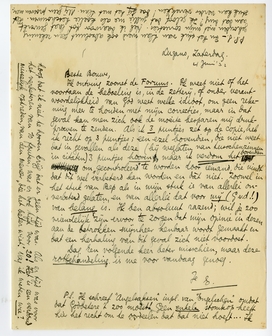 Ik ontving zoonet de Forums. Ik weet niet of het voortaan de bedoeling is, in de zetterij, of onder verantwoordelijkheid van God weet welke idioot, om geen rekening meer te houden met mijn correcties, maar in dat geval kan men zich ook de moeite besparen mij drukproeven te zenden. Als ik 3 puntjes zet op de copie, heb ik rècht op 3 puntjes; een ezel bovendien, die niet weet dat in gevallen als deze (bij weglaten van tusschenzinnen in citaten) 3 puntjes hooren, maar ik verdom7155 het bovendien om ‘gecontroleerd’ te worden door iemand, die vindt dat dìt wel verbeterd kan worden en dàt niet. Zoowel in het stuk van Bep7156 als in mijn stuk7157 is van allerlei onverbeterd gelaten, en van allerlei dat voor mij (G.v.d.!) van belang is. Ik ben absoluut razend; wil je zoo vriendelijk zijn ervoor te zorgen dat mijn opinie in dezen aan de betrokken mijnheer kenbaar wordt gemaakt en dat een herhaling van dit geval zich niet voordoet.