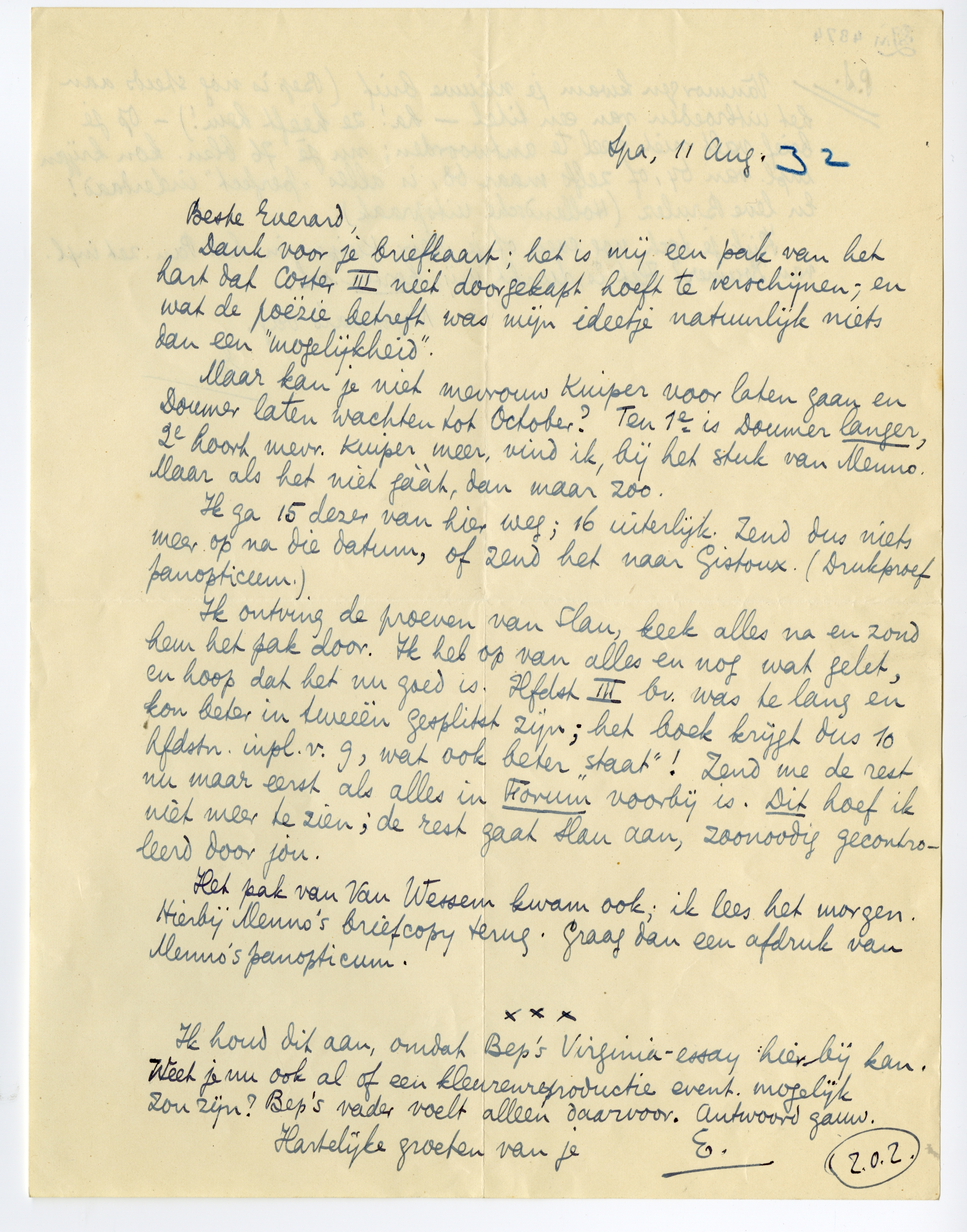 Dank voor je briefkaart; het is mij een pak van het hart dat Coster III7178 niet doorgekapt hoeft te verschijnen; en wat de poëzie7179 betreft was mijn ideetje natuurlijk niets dan een ‘mogelijkheid’.