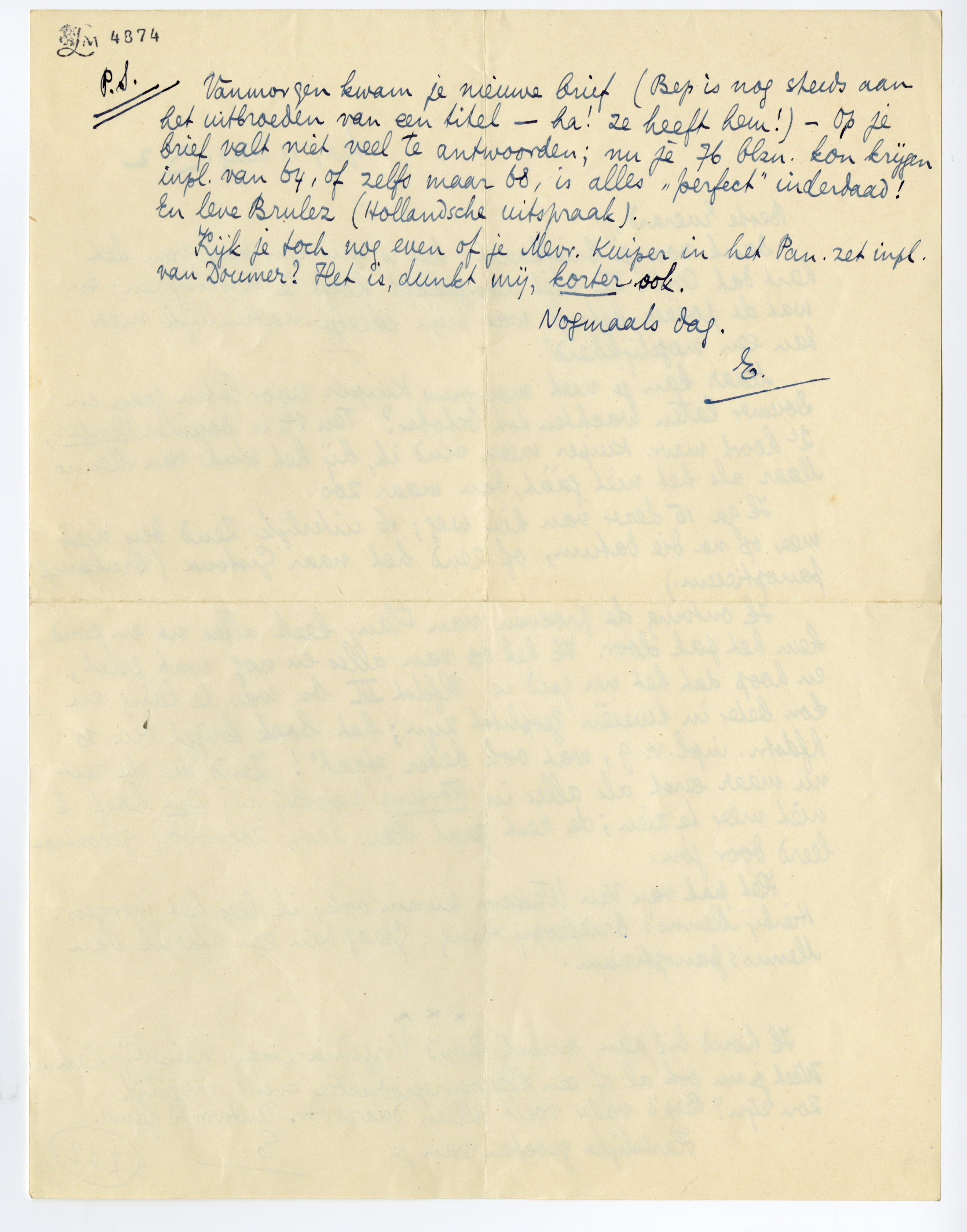 P.S.7187 Vanmorgen kwam je nieuwe brief (Bep is nog steeds aan het uitbroeden van een titel - ha! ze heeft hem!) - Op je brief valt niet veel te antwoorden; nu je 76 blzn. kon krijgen inpl. van 64, of zelfs maar 68, is alles ‘perfect’ inderdaad! En leve Brulez7188 (Hollandsche uitspraak).
