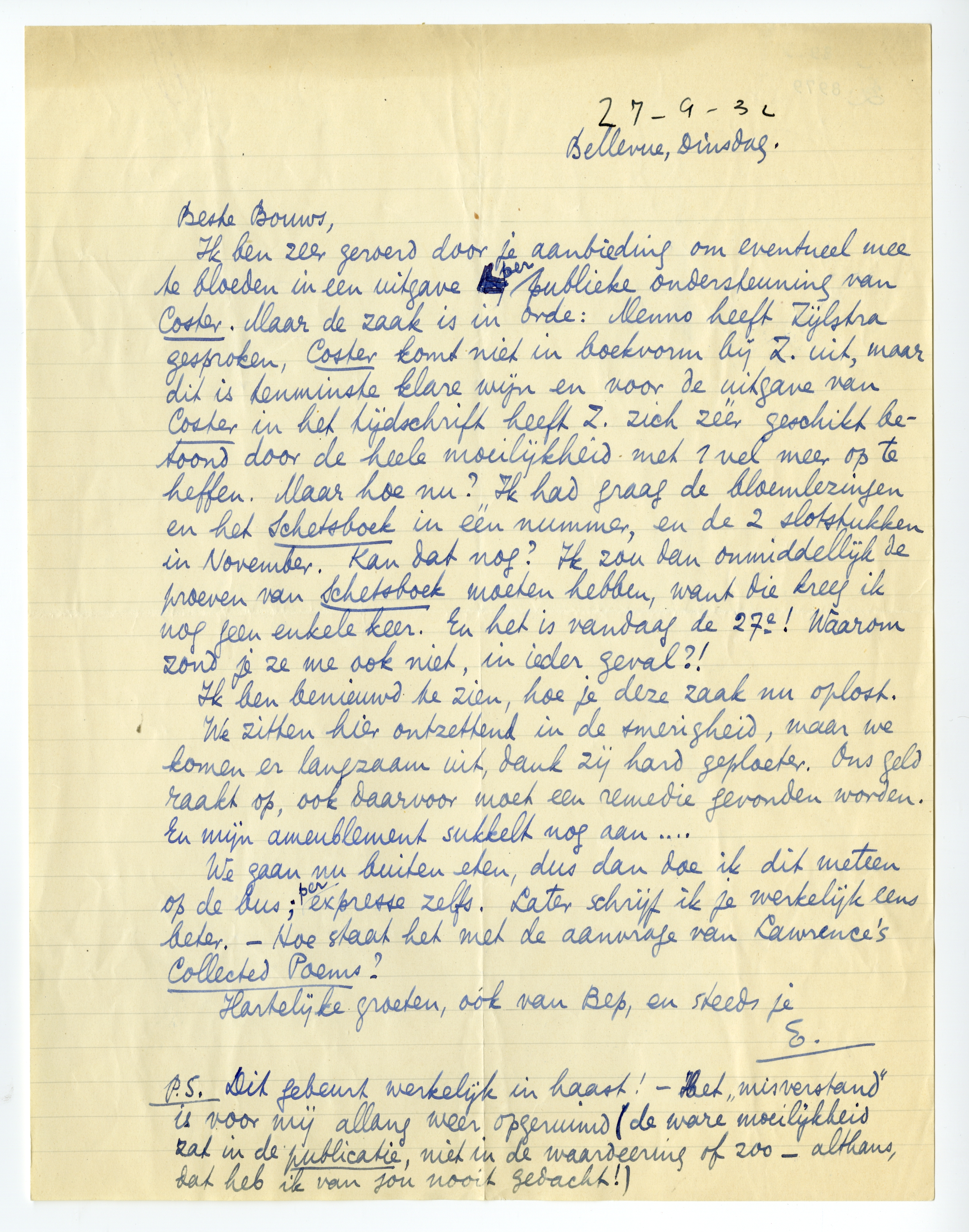 Ik ben zeer geroerd door je aanbieding om eventueel mee te bloeden in een uitgave ter publieke ondersteuning van Coster. Maar de zaak is in orde: Menno heeft Zijlstra gesproken,7213 Coster komt niet in boekvorm bij Z. uit, maar dit is tenminste klare wijn en voor de uitgave van Coster in het tijdschrift heeft Z. zich zéér geschikt betoond door de heele moeilijkheid met 1 vel meer op te heffen. Maar hoe nu? Ik had graag de bloemlezingen en het Schetsboek in één nummer, en de 2 slotstukken in November. Kan dat nog? Ik zou dan onmiddellijk de proeven van Schetsboek moeten hebben, want die kreeg ik nog geen enkele keer. En het is vandaag de 27e! Waarom zond je ze me ook niet, in ieder geval?!