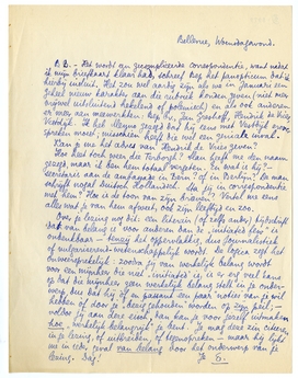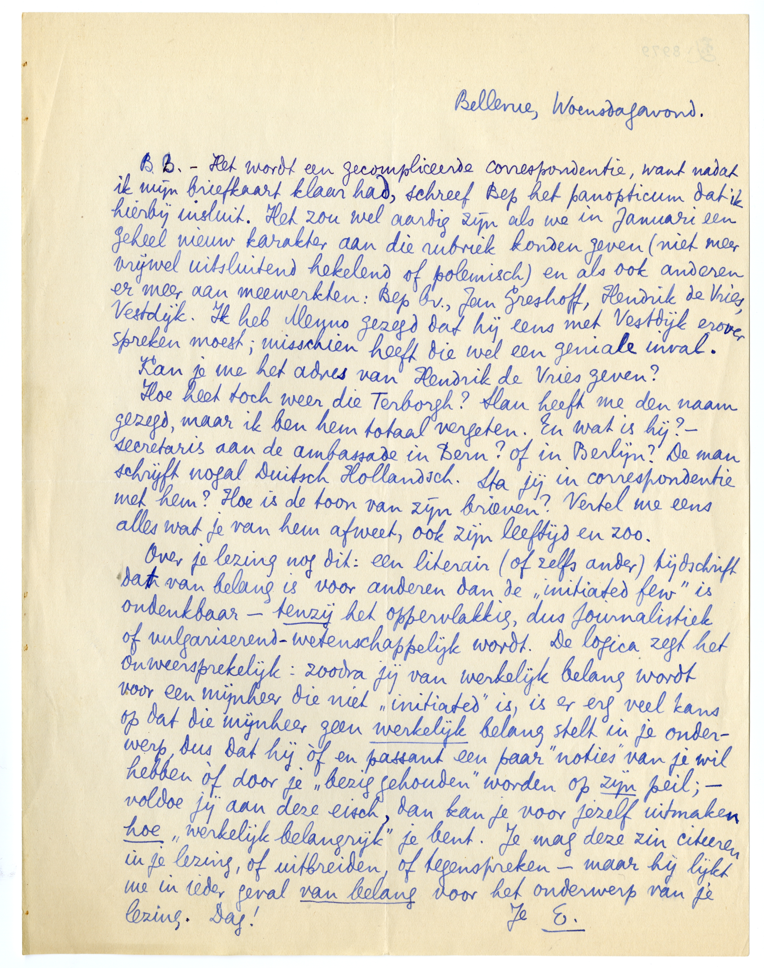 B.B. - Het wordt een gecompliceerde correspondentie, want nadat ik mijn briefkaart klaar had, schreef Bep het panopticum dat ik hierbij insluit.7225 Het zou wel aardig zijn als we in Januari een geheel nieuw karakter aan die rubriek konden geven (niet meer vrijwel uitsluitend hekelend of polemisch) en als ook anderen er meer aan meewerkten: Bep bv., Jan Greshoff, Hendrik de Vries, Vestdijk. Ik heb Menno gezegd dat hij eens met Vestdijk erover spreken moest; misschien heeft die wel een geniale inval.