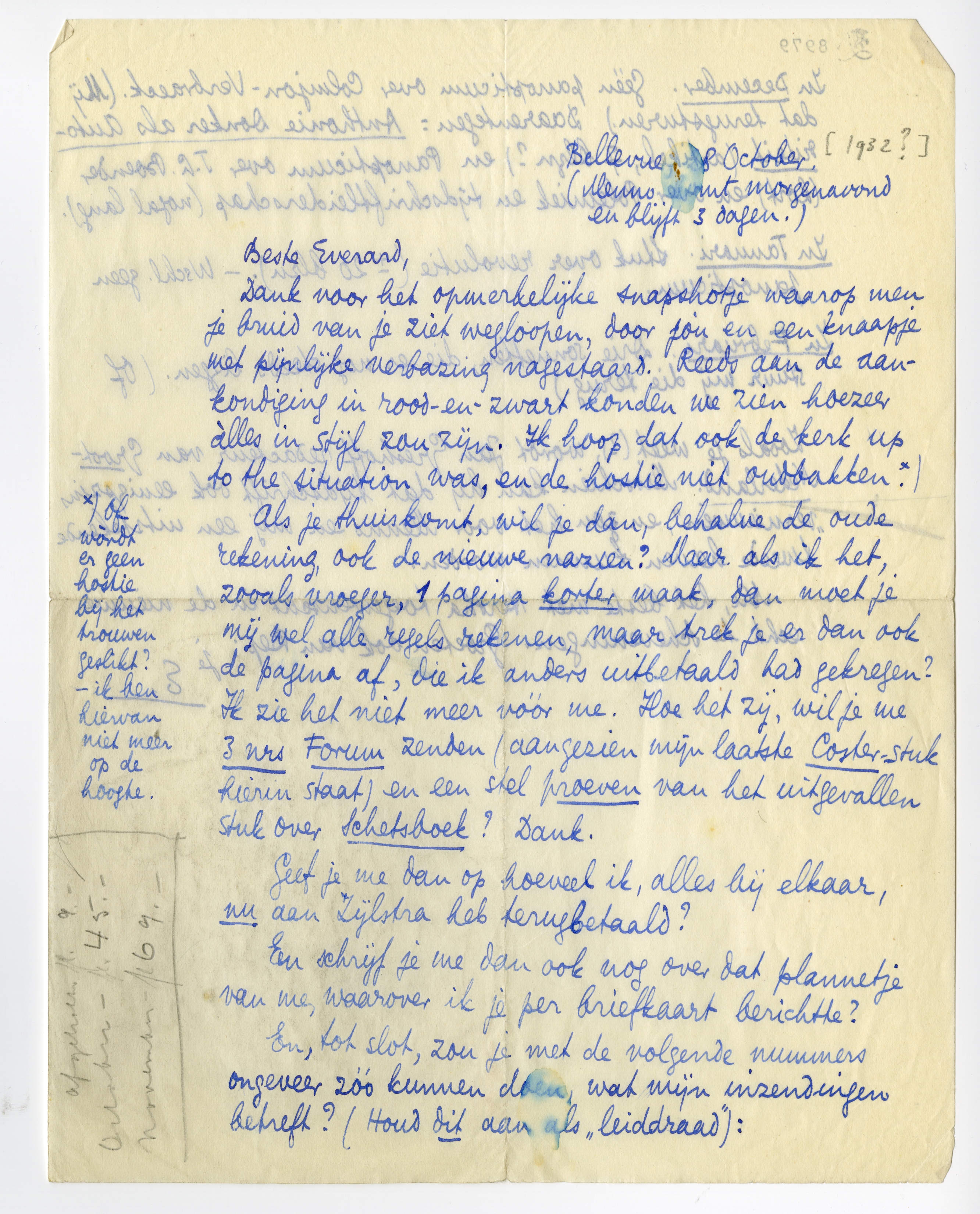 Als je thuiskomt, wil je dan, behalve de oude rekening, ook de nieuwe nazien? Maar als ik het, zooals vroeger, 1 pagina korter maak, dan moet je mij wel alle regels rekenen, maar trekje er dan ook de pagina af, die ik anders uitbetaald had gekregen? Ik zie het niet meer vóór me. Hoe het zij, wil je me 3 nrs Forum zenden (aangezien mijn laatste Coster-stuk hierin staat) en een stel proeven van het uitgevallen stuk over Schetsboek? Dank.