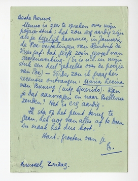 Menno is zeer te spreken over mijn poëzie-stuk; het zou erg aardig zijn als je tegelijk daarmee, in Januari, de Poe-vertalingen van Hendrik de Vries7246 gaf: dat geeft zoo'n gevoel van samenwerking. (Er is n.l. in mijn stuk een heel gedeelte over de poëzie van Poe.) - Verder zou ik graag ter recensie ontvangen: Maria Lecina van Buning (uitg. Querido). Kan je dat aanvragen en naar Bellevue zenden? Het is erg aardig.