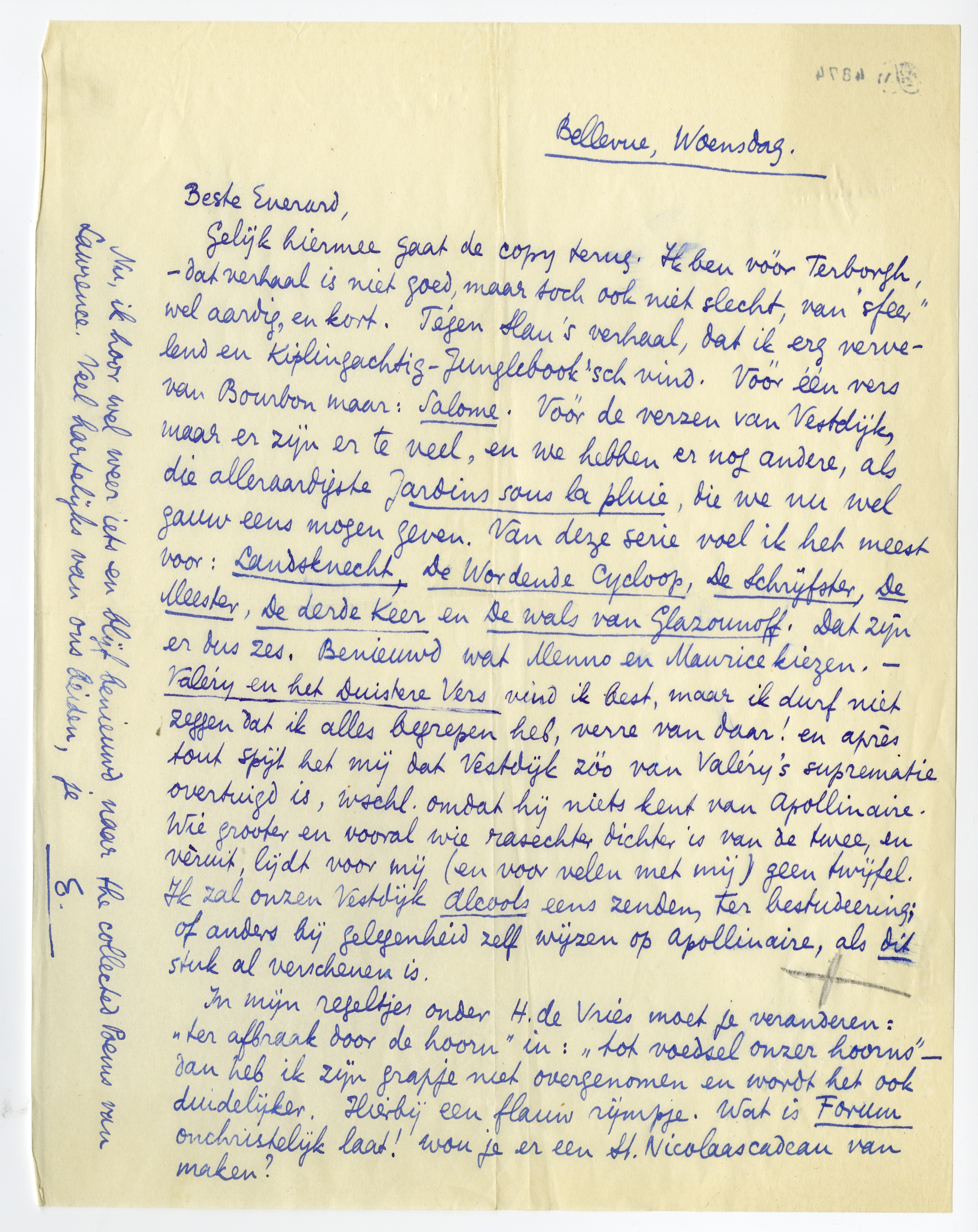 Gelijk hiermee gaat de copy terug. Ik ben vóór Terborgh, - dat verhaal is niet goed, maar toch ook niet slecht, van ‘sfeer’ wel aardig, en kort.7254 Tégen Slau's verhaal, dat ik erg vervelend en Kiplingachtig - Junglebook'sch vind.7255 Vóór één vers van Bourbon maar: Salome.7256 Vóór de verzen van Vestdijk, maar er zijn er te veel, en we hebben er nog andere, als die alleraardigste Jardins sous la pluie, die we nu wel gauw eens mogen geven. Van deze serie voel ik het meest voor: Landsknecht, De Wordende Cycloop, De Schrijfster, De Meester, De derde Keer en De wals van Glazounoff Dat zijn er dus zes.7257 Benieuwd wat Menno en Maurice kiezen. - Valéry en het Duistere Vers7258 vind ik best, maar ik durf niet zeggen dat ik alles begrepen heb, verre van daar! en après tout spijt het mij dat Vestdijk zóó van Valéry's suprematie overtuigd is, wschl. omdat hij niets kent van Apollinaire. Wie grooter en vooral wie rasechter dichter is van de twee, en vèruit, lijdt voor mij (en voor velen met mij) geen twijfel. Ik zal onzen Vestdijk Alcools eens zenden ter bestudeering; of anders bij gelegenheid zelf wijzen op Apollinaire, als dit stuk al verschenen is.