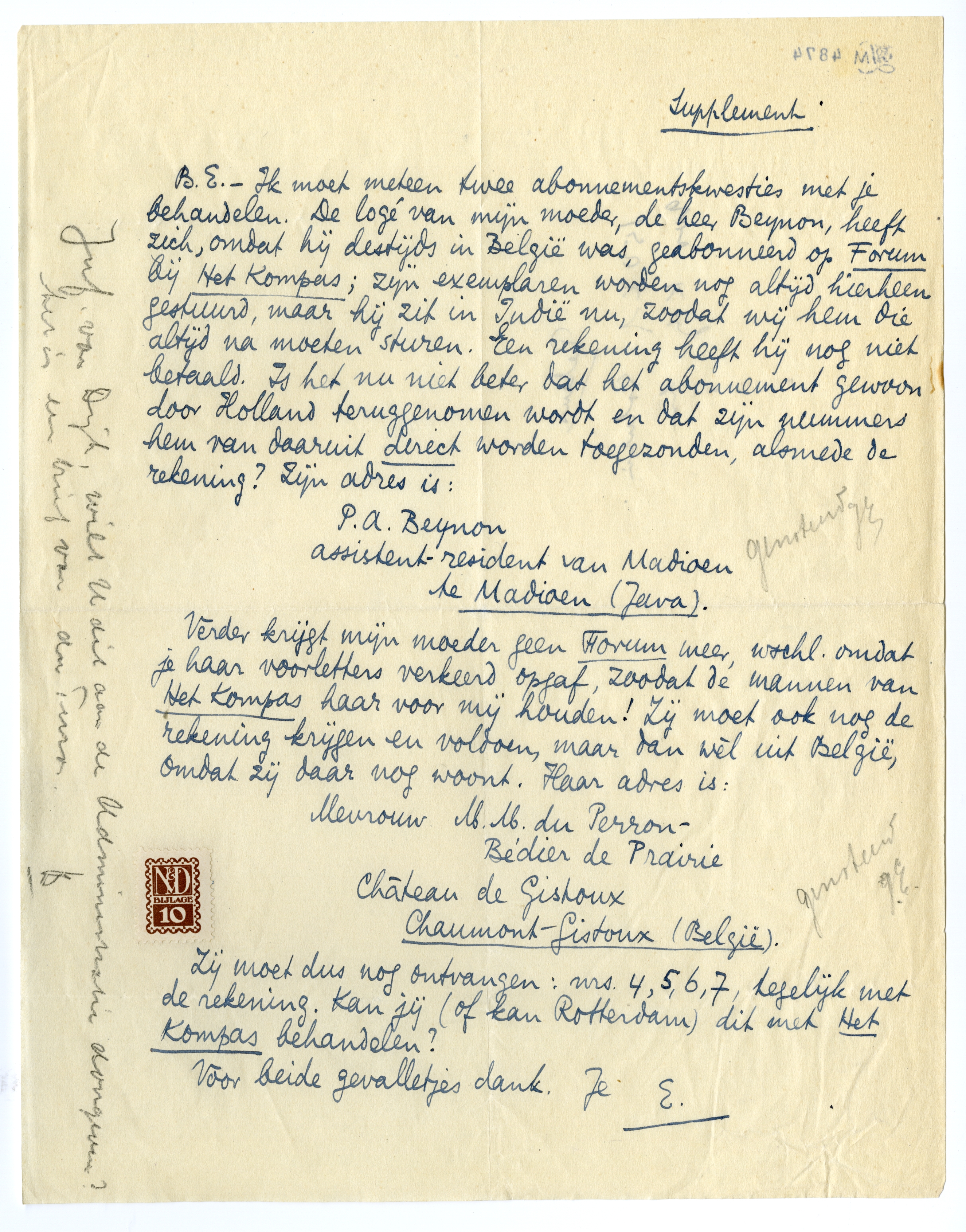 B.E. - Ik moet meteen twee abonnementskwesties met je behandelen. De logé van mijn moeder, de heer Beynon, heeft zich, omdat hij destijds in België was, geabonneerd op Forum bij Het Kompas; zijn exemplaren worden nog altijd hierheen gestuurd, maar hij zit in Indië nu, zoodat wij hem die altijd na moeten sturen. Een rekening heeft hij nog niet betaald. Is het nu niet beter dat het abonnement gewoon door Holland teruggenomen wordt en dat zijn nummers hem van daaruit direct worden toegezonden, alsmede de rekening? Zijn adres is: