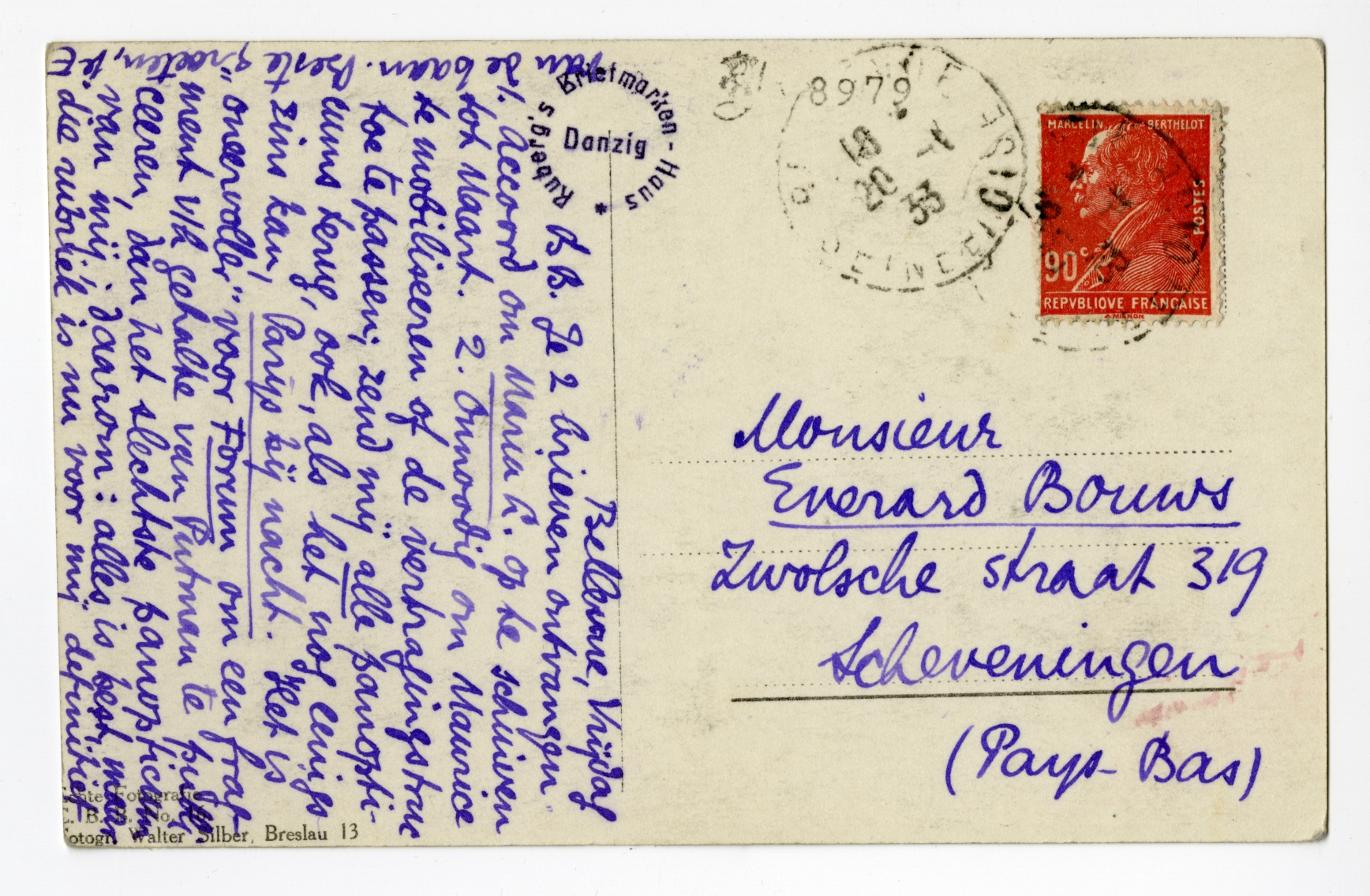 B.B. Je 2 brieven ontvangen. 1. Accoord om Maria L. op te schuiven tot Maart. 2. Onnoodig om Maurice te mobiliseeren of de vertragingstruc toe te passen; zend mij alle panopticums7298 terug, ook, als het nog eenigszins kan, Parijs bij nacht.7299 Het is ‘oneervoller’ voor Forum om een fragment v/h gehalte van Putman te publiceeren, dan het slechtste panopticum van mij; daarom: alles is best, maar die rubriek is nu voor mij definitief van de baan.7300 Beste groeten, je