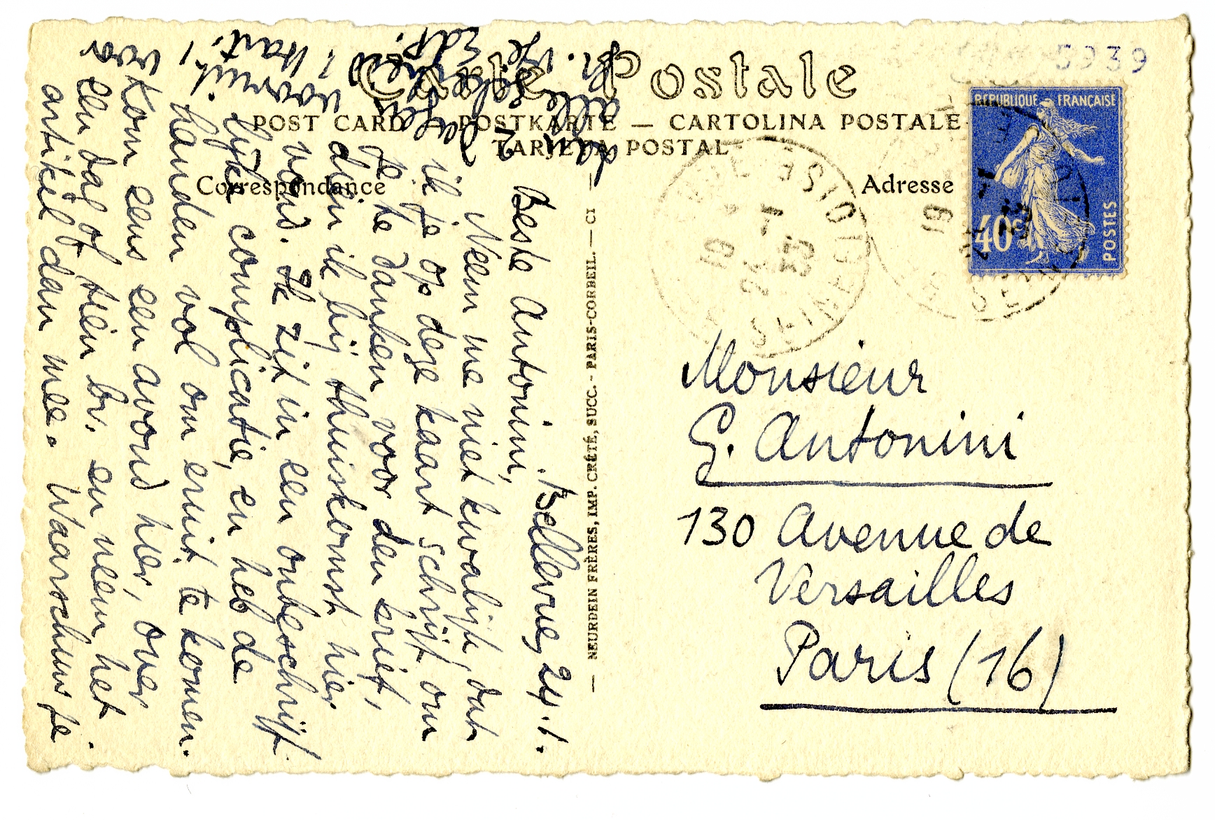 Neem me niet kwalijk, dat ik je op deze kaart schrijf om je te danken voor den brief, dien ik bij thuiskomst hier vond. Ik zit in een onbeschrijflijke complicatie, en heb de handen vol om eruit te komen.7303 Kom eens een avond hier, over een dag of tien bv. en neem het artikel7304 dan mee. Waarschuw je dan 2 dagen vooruit, voor alle zekerheid?
