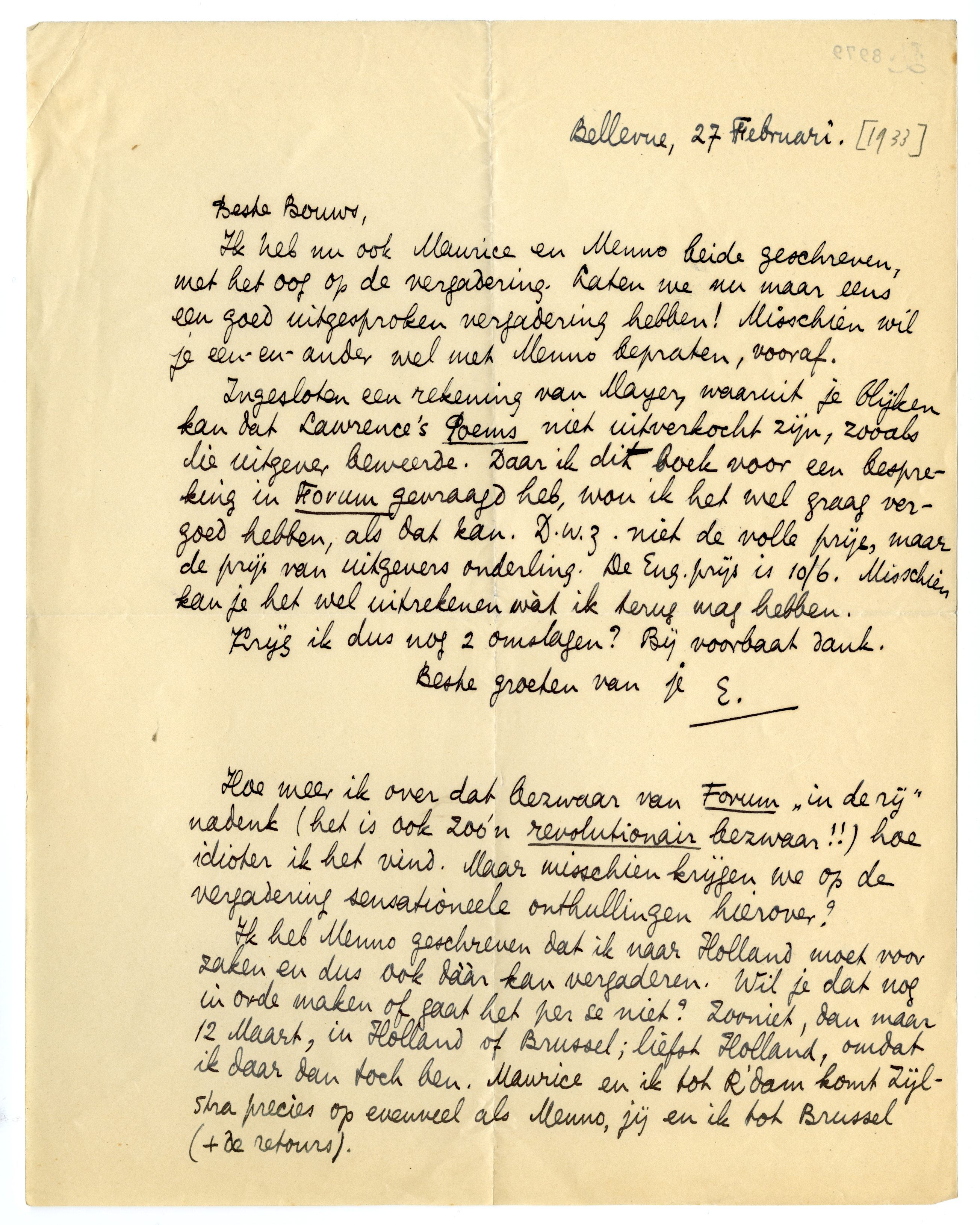 Ingesloten een rekening van Mayer, waaruit je blijken kan dat Lawrence's Poems niet uitverkocht zijn, zooals die uitgever beweerde. Daar ik dit boek voor een bespreking in Forum gevraagd heb,7313 wou ik het wel graag vergoed hebben, als dat kan. D.w.z. niet de volle prijs, maar de prijs van uitgevers onderling. De Eng. prijs is 10/6. Misschien kan je het wel uitrekenen wàt ik terug mag hebben.
