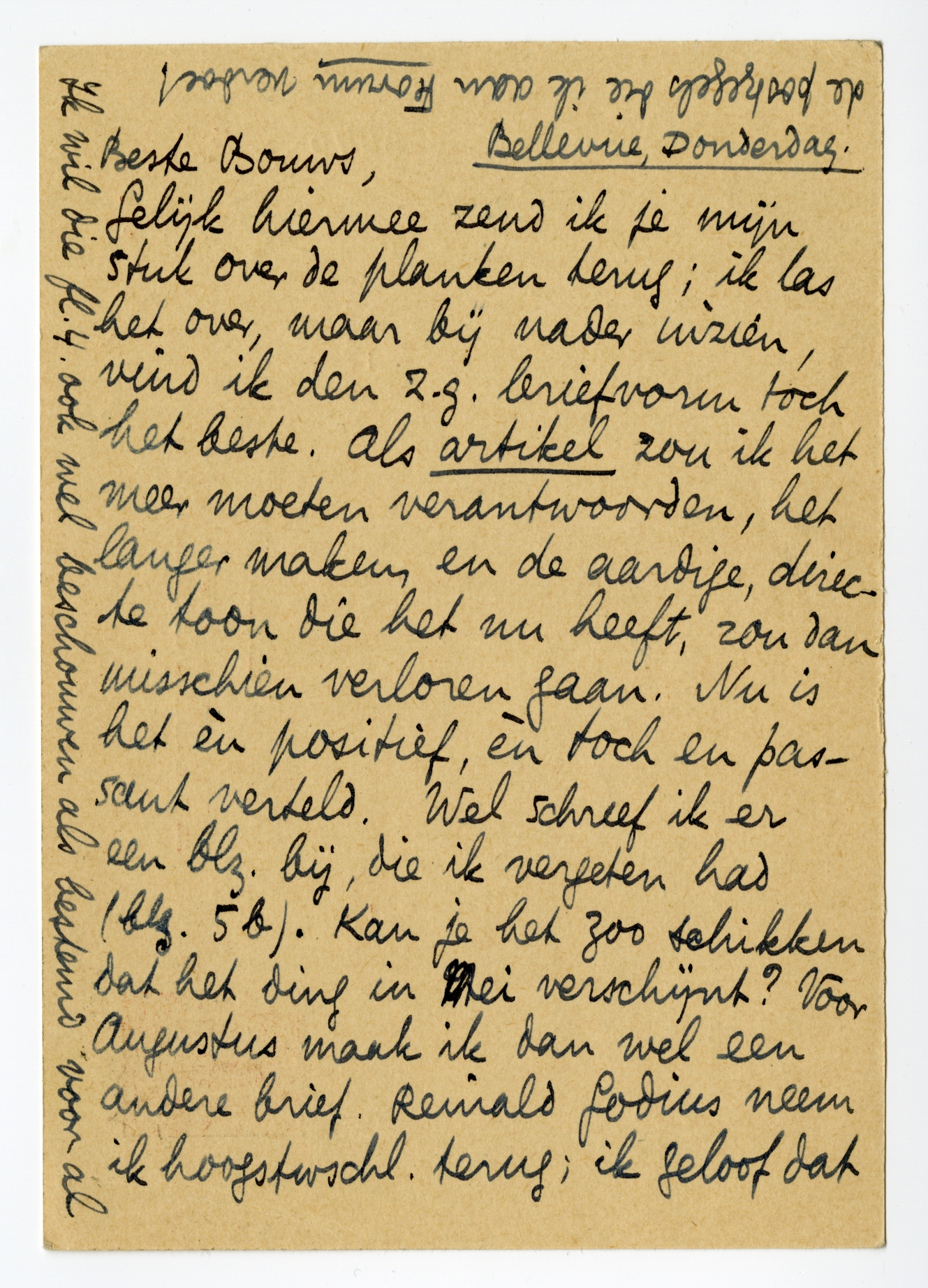 Gelijk hiermee zend ik je mijn stuk over de planken terug; ik las het over, maar bij nader inzien, vind ik den z.g. briefvorm toch het beste.7316 Als artikel zou ik het meer moeten verantwoorden, het langer maken, en de aardige, directe toon die het nu heeft, zou dan misschien verloren gaan. Nu is het èn positief, èn toch en passant verteld. Wel schreef ik er een blz. bij, die ik vergeten had (blz. 5b). Kan je het zoo schikken dat het ding in Mei verschijnt? Voor Augustus maak ik dan wel een andere brief. Reinald Godius7317 neem ik hoogstwschl. terug; ik geloof dat ding toch maar ga versmelten in mijn ‘roman’.