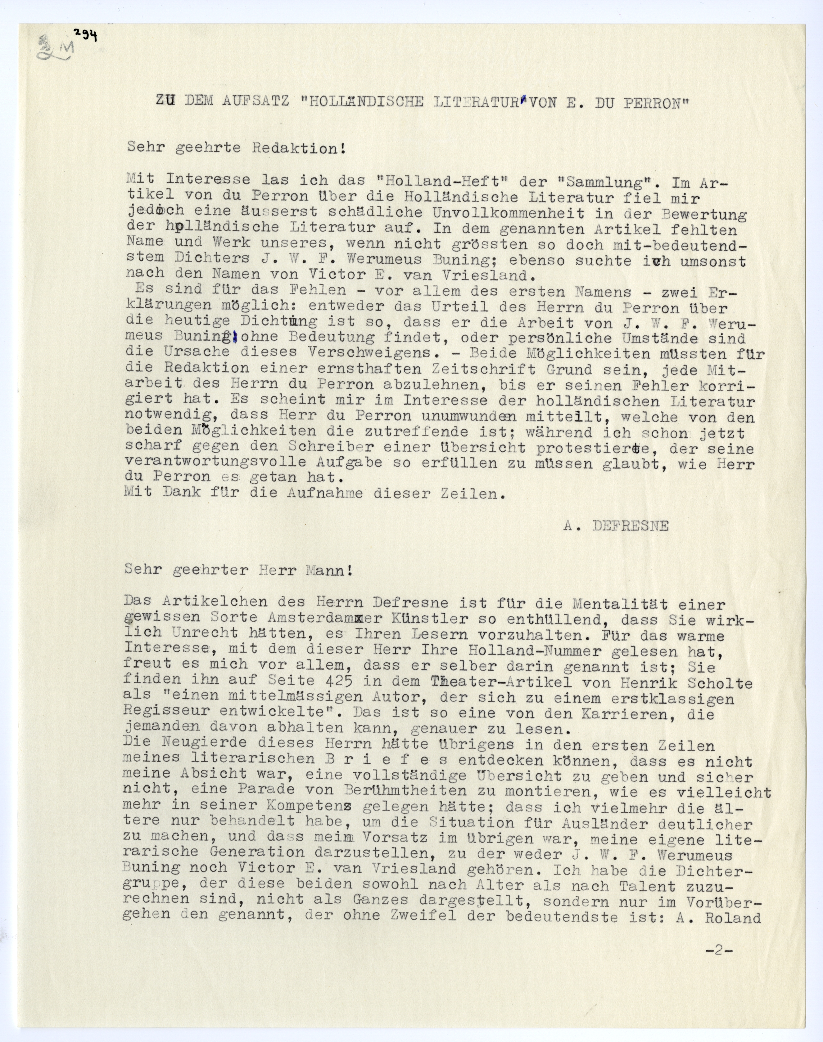 Die Neugierde dieses Herrn hätte übrigens in den ersten Zeilen meines literarischen Briefes entdecken können, dass es nicht meine Absicht war, eine vollständige Übersicht zu geben and sicher nicht, eine Parade von Berühmtheiten zu montieren, wie es vielleicht mehr in seiner Kompetenz gelegen hätte; dass ich vielmehr die ältere Literatur nur behandelt habe, um die Situation für Ausländer deutlicher zu machen, and dass mein Vorsatz im übrigen war, mein eigene literarische Generation darzustellen, zu der weder J.W.F. Werumeus Buning noch Victor E. van Vriesland gehören. Ich habe die Dichtergruppe, der diese beiden sowohl nach Alter als nach Talent zuzurechnen sind, nicht als Ganzes Dargestellt, sondern nur im Vorubergehen den genannt, der ohne Zweifel der bedeutendste ist: A. Roland Holst. Andernfalls würde ich nicht nur J.W.F. Werumeus Buning genannt haben sondern auch Geerten Gossaert, J.C. Bloem and Jan van Nijlen: Dichter, die ich samt und sonders für genau so bedeutend halte wie J.W.F. Werumeus Buning, auch wenn Herr Defresne es mir noch so sehr verübeln sollte.