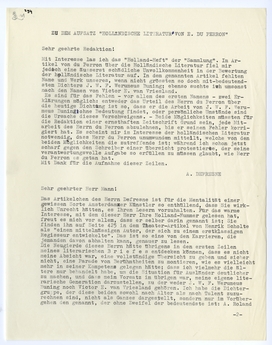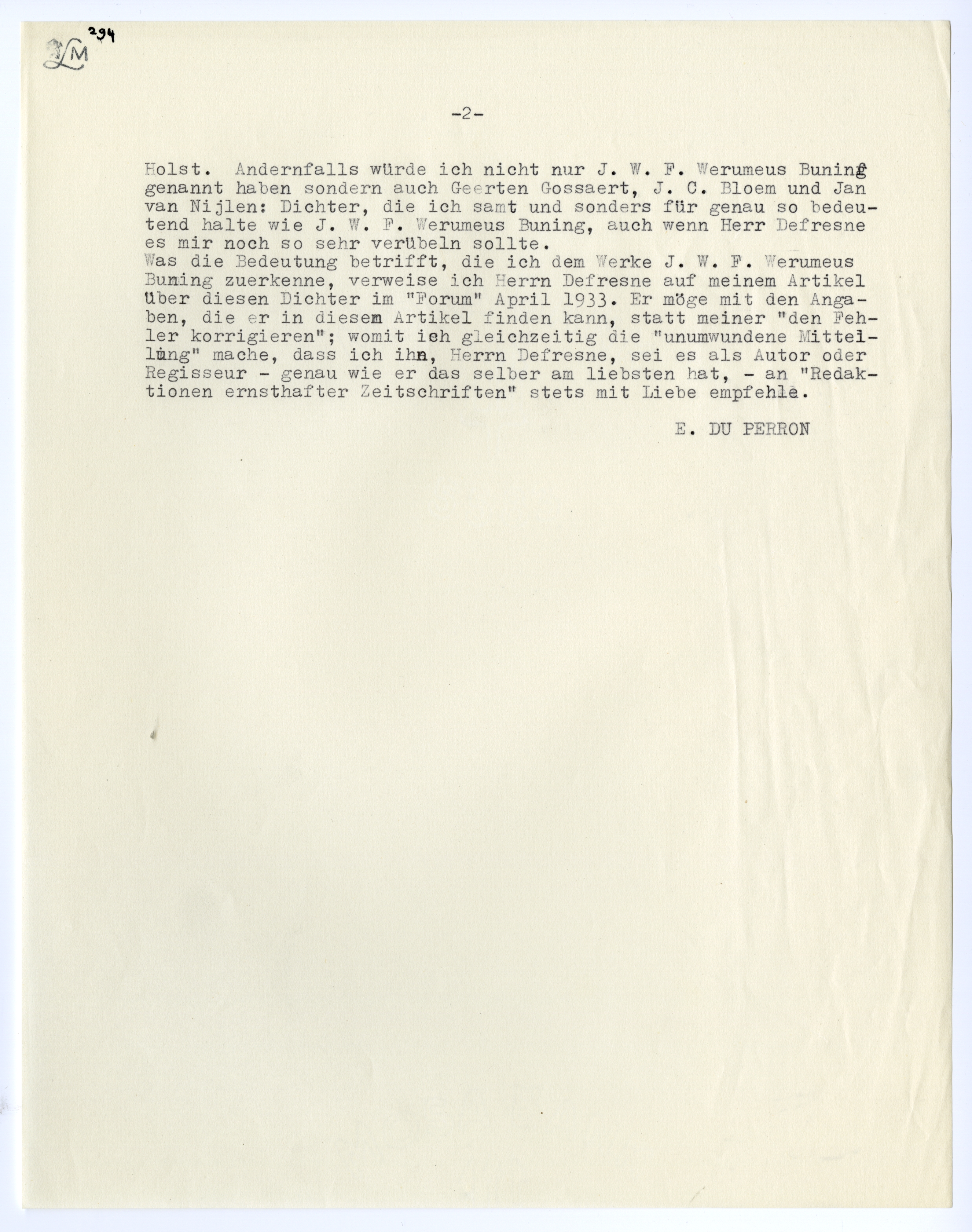 Was die Bedeutung betrifft, die ich dem Werke J.W.F. Werumeus Buning's zuerkenne, verweise ich Herrn Defresne auf meinem Artikel über diesen Dichter im ‘Forum’ April 1933.7398 Er möge mit den Angaben, die er in diesem Artikel finden kann, statt meiner ‘den Fehler korrigieren’; womit ich gleichzeitig die ‘unumwundene Mitteilung’ mache, dass ich ihn, Herrn Defresne, sei es als Autor oder Regisseur - genau wie er das selber am liebsten hat, - an ‘Redaktionen ernsthafter Zeitschriften’ stets mit Liebe empfehle.
