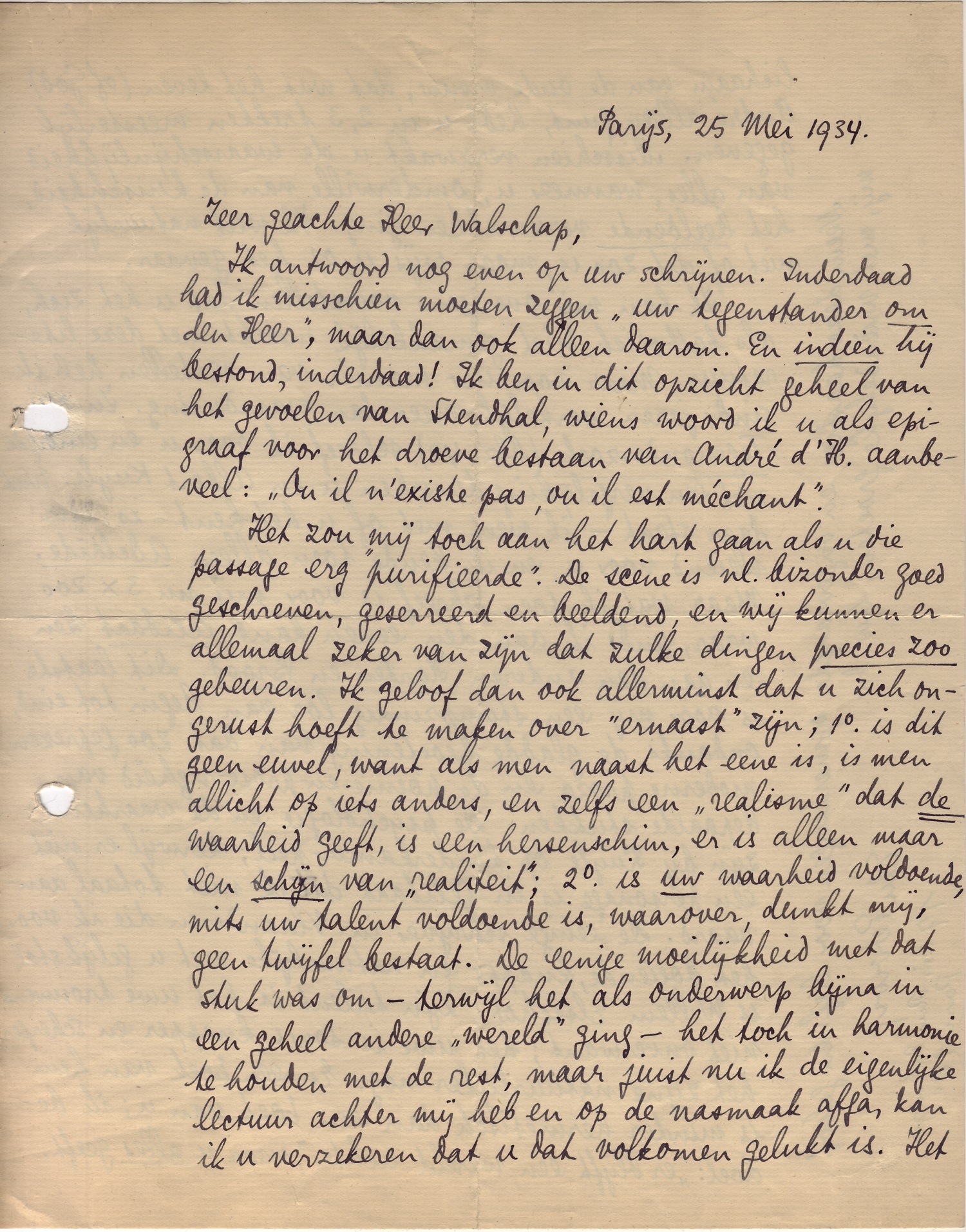 Ik antwoord nog even op uw schrijven. Inderdaad had ik misschien moeten zeggen ‘Uw tegenstander om den Heer’, maar dan ook alleen daarom. En indien hij bestond, inderdaad! Ik ben in dit opzicht geheel van het gevoelen van Stendhal, wiens woord ik u als epigraaf voor het droeve bestaan van André d'H. aanbeveel: ‘Ou il n'existe pas, ou il est méchant’.7410