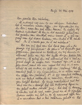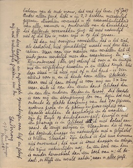 Het zou mij toch aan het hart gaan als u die passage7411 erg ‘purifieerde’. De scène is nl. bizonder goed geschreven, geserreerd en beeldend, en wij kunnen er allemaal zeker van zijn dat zulke dingen precies zoo gebeuren. Ik geloof dan ook allerminst dat u zich ongerust hoeft te maken over ‘ernaast’ zijn; 1o. is dit geen euvel, want als men naast het eene is, is men allicht op iets anders, en zelfs een ‘realisme’ dat de7412 waarheid geeft, is een hersenschim, er is alleen maar een schijn van ‘realiteit’; 2o. is uw waarheid voldoende, mits uw talent voldoende is, waarover, dunkt mij, geen twijfel bestaat. De eenige moeilijkheid met dat stuk was om - terwijl het als onderwerp bijna in een geheel andere ‘wereld’ ging - het toch in harmonie te houden met de rest, maar juist nu ik de eigenlijke lectuur achter mij heb en op de nasmaak afga, kan ik u verzekeren dat u dat volkomen gelukt is. Het lichaam van de oude vrouw, dat wat het leven (of God) André alleen gunt, hebt u in 2, 3 trekken meesterlijk gegeven. Misschien verzwakt u de waarschijnlijkheid van alles, wanneer u, omderwille van de kuischheid, het beeldende verzwakken ging. Ik weet natuurlijk niet of dit zoo is, maar wijs u op het gevaar.
