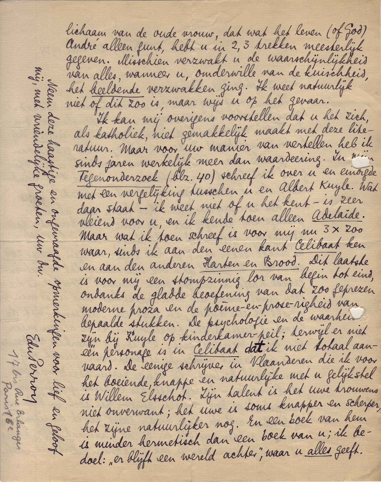 Ik kan mij overigens voorstellen dat u het zich, als katholiek, niet gemakkelijk maakt met deze literatuur. Maar voor uw manier van vertellen heb ik sinds jaren werkelijk meer dan waardeering. In mijn Tegenonderzoek (blz. 40) schreef ik over u7413 en eindigde met een vergelijking tusschen u en Albert Kuyle. Wat daar staat - ik weet niet of u het kent - is zeer vleiend voor u, en ik kende toen alleen Adelaïde. Maar wat ik toen schreef is voor mij nu 3 × zoo waar, sinds ik aan den eenen kant Celibaat ken en aan den anderen Harten en Brood. Dit laatste is voor mij zoo geprezen moderne proza en de poème-en-prose-righeid van bepaalde stukken. De psychologie en de waarheid zijn bij Kuyle op kinderkamer-peil; terwijl er niet één personage is in Celibaat dat ik niet totaal aanvaard. De eenige schrijver in Vlaanderen die ik voor het boeiende, knappe en natuurlijke met u gelijk stel is Willem Elsschot. Zijn talent is het uwe trouwens niet onverwant; het uwe is soms knapper en scherper, het zijne natuurlijker nog. En een boek van hem is minder hermetisch dan een boek van u; ik bedoel: ‘er blijft een wereld achter’, waar u alles geeft.