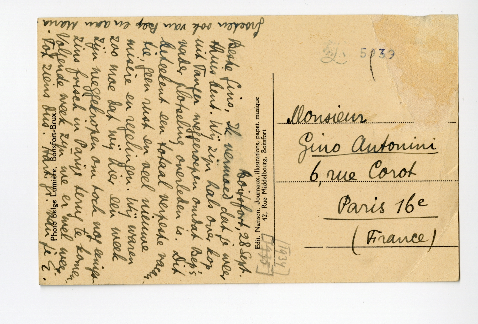 Beste Gino, Ik vermoed dat je weer thuis bent. Wij zijn hals over kop uit Tanger weggeroepen omdat Bep's vader plotseling overleden is.7424 Dit beteekent een totaal verpeste vacantie, geen rust en veel nieuwe misère en regelingen. Wij waren zoo moe dat wij hier een week zijn weggekropen7425 om toch nog eenigszins frisch in Parijs terug te komen. Volgende week zijn we er wel weer.7426 Tot ziens dus. Hart. gr. van je