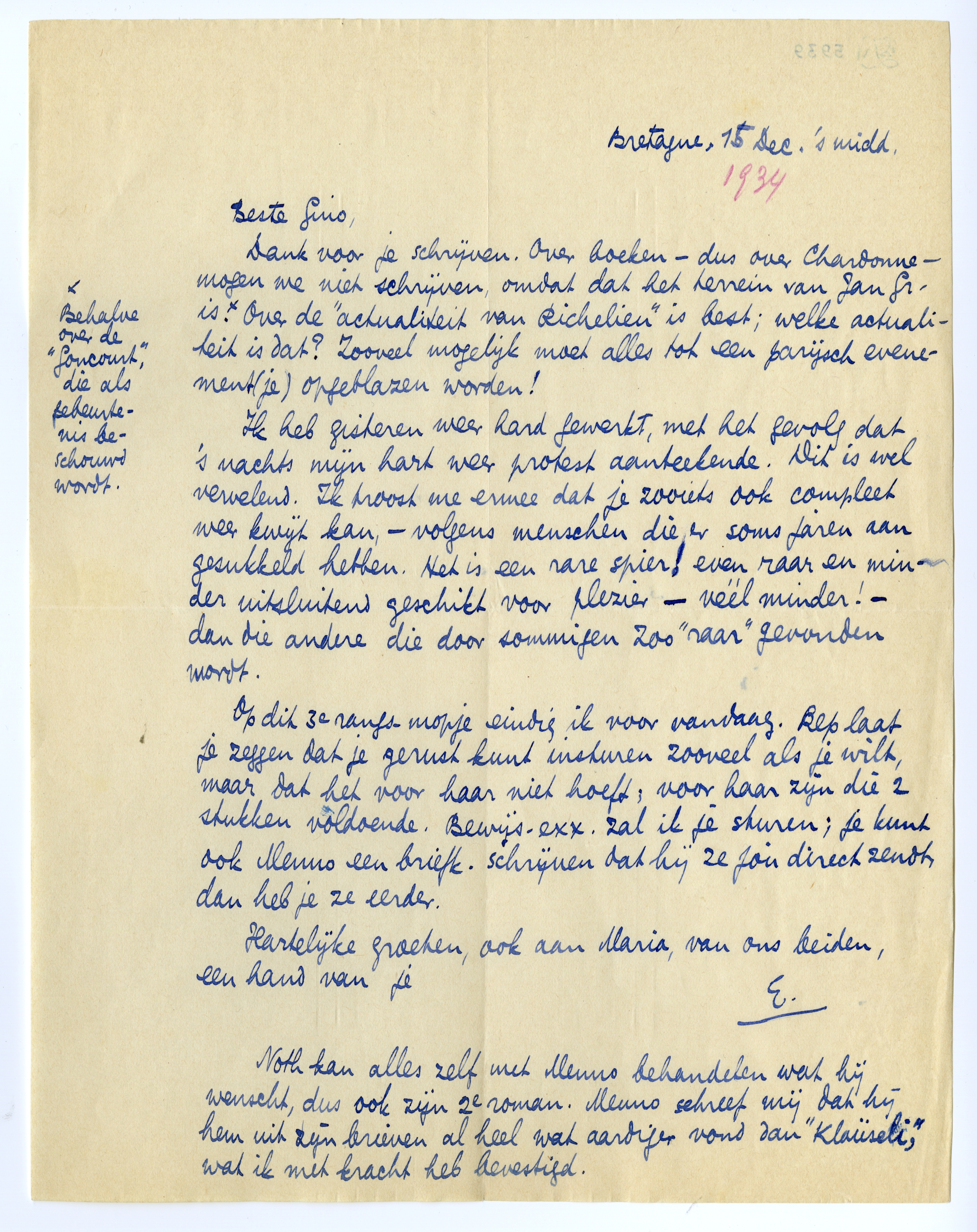 Dank voor je schrijven. Over boeken - dus over Chardonne7438, - mogen we niet schrijven, omdat dat het terrein van Jan Gr. is.* Over de ‘actualiteit van Richelieu’ is best; welke actualiteit is dat?7440 Zooveel mogelijk moet alles tot een parijsch evenement(je) opgeblazen worden!