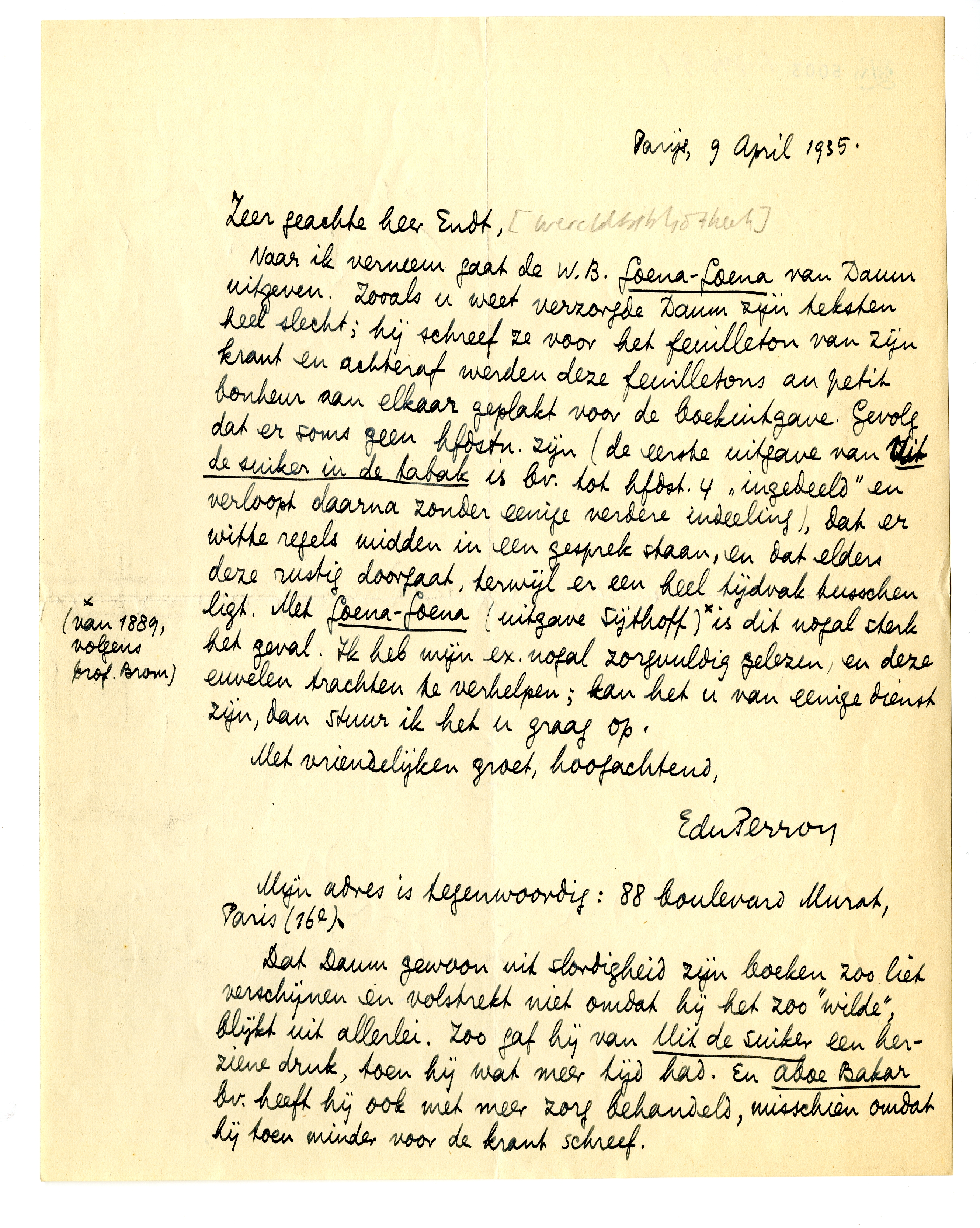 Naar ik verneem gaat de W.B. Goena-Goena van Daum uitgeven. Zooals u weet verzorgde Daum zijn teksten heel slecht; hij schreef ze voor het feuilleton van zijn krant en achteraf werden deze feuilletons au petit bonheur aan elkaar geplakt voor de boekuitgave.7474 Gevolg dat er soms geen hfdstn. zijn (de eerste uitgave van Uit de suiker in de tabak7475 is bv. tot hfdst. 4 ‘ingedeeld’ en verloopt daarna zonder eenige verdere indeeling), dat er witte regels midden in een gesprek staan, en dat elders deze rustig doorgaat, terwijl er een heel tijdvak tusschen ligt. Met Goena-Goena (uitgave Sijthoff)* is dit nogal sterk het geval. Ik heb mijn ex. nogal zorgvuldig gelezen, en deze euvelen trachten te verhelpen; kan het u van eenige dienst zijn, dan stuur ik het u graag op.