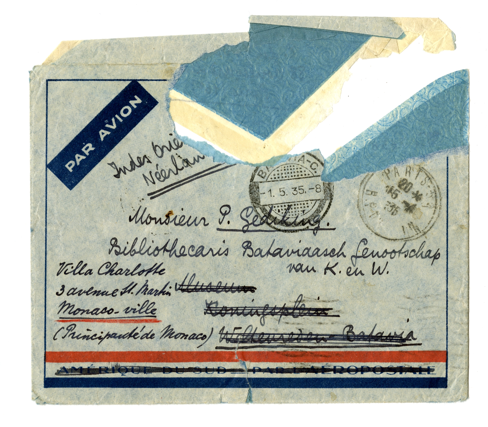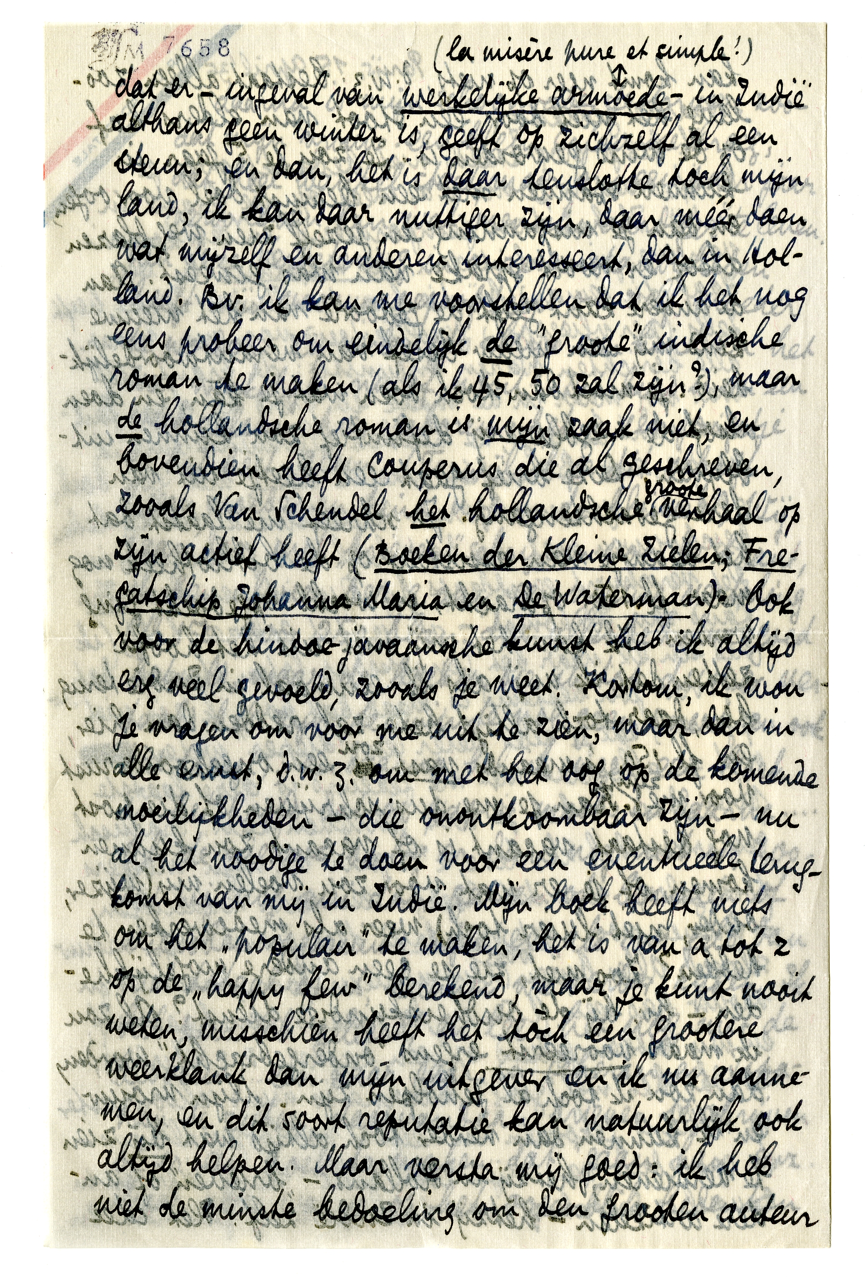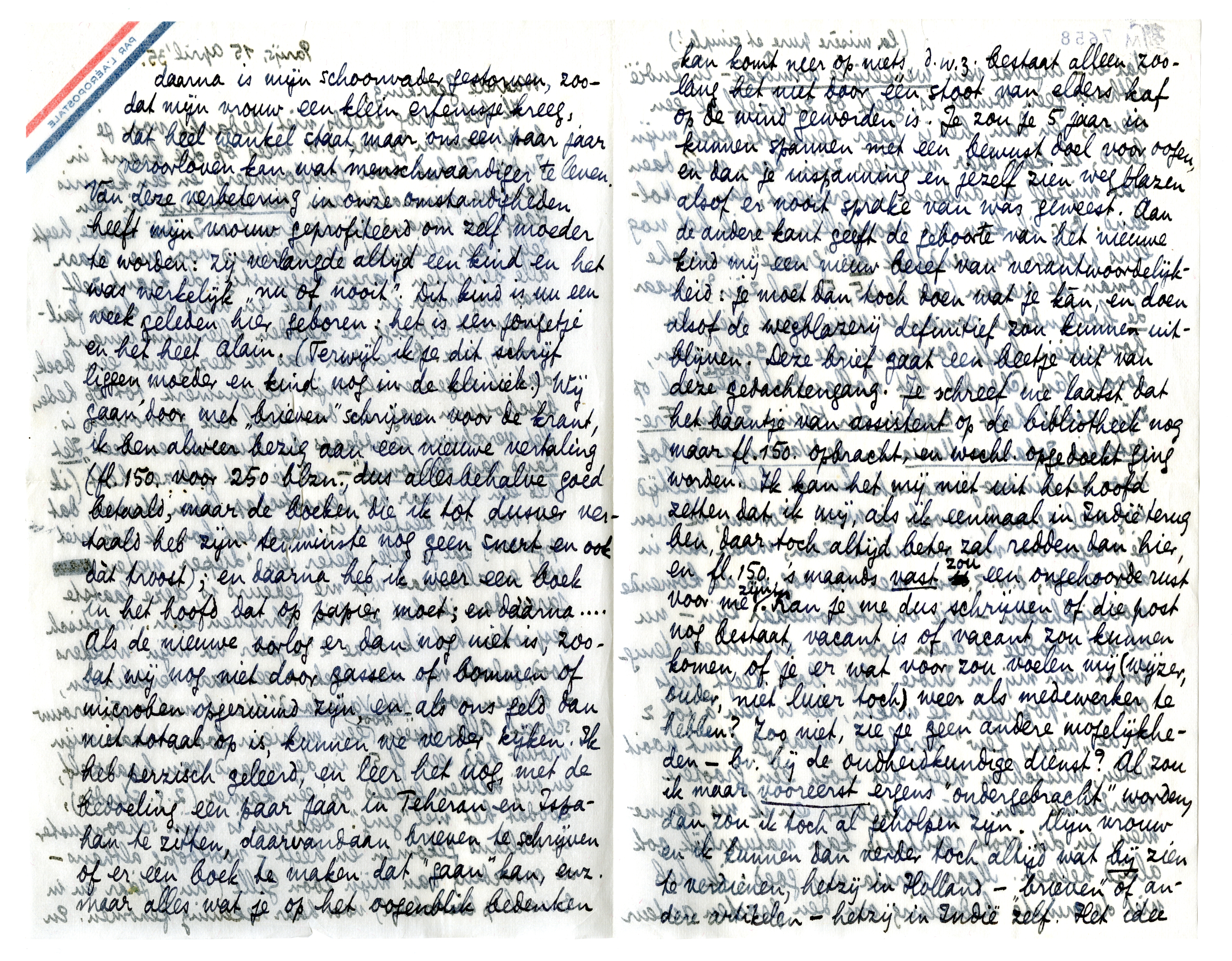 Ik heb je nog steeds niet bedankt voor je brief, waarin je me o.a. wees op die krant in Indië. Ik heb daar geïnformeerd, en een kennis van me, journalist aan ‘Het Vaderland’ in Den Haag,7478 die iemand bij die krant in Indië kende, heeft zelfs (per vliegpost) gesolliciteerd voor me, maar alle berichten waren ongunstig: de krant zelf was nog maar in de maak en werd al door faillissement bedreigd, ze hadden allerminst iemand noodig, enz. Bovendien was ik bezig met een boek, dat ik ongeveer als mijn ‘levenswerk’ tot op heden beschouwen mag, en dat heel dik geworden is. Het verschijnt eerstdaags bij Querido en heet ‘Het Land van Herkomst’ - als je het gelezen hebt (ik heb een ex. naar het Genootschap laten sturen, dat eig. voor jou bestemd is, maar dat kon ik zóó niet opgeven) zal je alles beter en ‘dieper’ weten wat er allemaal met me gebeurd is, deze laatste jaren, dan ik het je hier schrijven kan. Practisch gesproken heb ik, deze 2½ jaar na mijn moeders dood, geleefd van dat boek, + een paar vertalingen, + brieven voor ‘Het Vaderland’ die ik met mijn vrouw schreef. Alles bijeen voor een miniem loon; maar mijn vrouw had een fl. 50. in de maand van haarzelf, en wij hebben geleefd op één kamer (z.g. studio), zoodat het wel ‘ging’. Daarna is mijn schoonzuster in Holland gekomen en heeft - voorloopig althans - de opvoeding van mijn zoon Gille (nu 9 jaar en in Brussel op kostschool) voor haar rekening genomen. En daarna is mijn schoonvader gestorven, zoodat mijn vrouw een klein erfenisje kreeg, dat heel wankel staat, maar ons een paar jaar veroorloven kan wat menschwaardiger te leven. Van deze verbetering in onze omstandigheden heeft mijn vrouw geprofiteerd om zelf moeder te worden: zij verlangde altijd een kind en het was werkelijk ‘nu of nooit’. Dit kind is nu een week geleden hier geboren: het is een jongetje en het heet Alain. (Terwijl ik je dit schrijf liggen moeder en kind nog in de kliniek.) Wij gaan door met ‘brieven’ schrijven voor de krant, ik ben alweer bezig aan een nieuwe vertaling7479 (fl. 150. voor 250 blzn., dus allesbehalve goed betaald, maar de boeken die ik tot dusver vertaald heb zijn tenminste nog geen snert en ook dat troost); en daarna heb ik weer een boek in het hoofd dat op papier moet; en dààrna... Als de nieuwe oorlog er dan nog niet is, zoodat wij nog niet door gassen of bommen of microben opgeruimd zijn, en als ons geld dan niet totaal op is, kunnen we verder kijken. Ik heb perzisch geleerd, en leer het nog, met de bedoeling een paar jaar in Teheran en Ispahan te zitten, daarvandaan brieven te schrijven of er een boek te maken dat ‘gaan’ kan, enz. Maar alles wat je op het oogenblik bedenken kan komt neer op niets, d.w.z. bestaat alleen zoolang het niet door één stoot van elders kaf op de wind geworden is. Je zou je 5 jaar in kunnen spannen met een bewust doel voor oogen, en dan je inspanning en jezelf zien weg blazen alsof er nooit sprake van was geweest. Aan de andere kant geeft de geboorte van het nieuwe kind mij een nieuw besef van verantwoordelijkheid: je moet dan toch doen wat je kàn, en doen alsof de wegblazerij definitief zou kunnen uitblijven. Deze brief gaat een beetje uit van deze gedachtengang. Je schreef me laatst dat het baantje van assistent op de bibliotheek nog maar fl. 150. opbracht, en wschl. opgedoekt ging worden. Ik kan het mij niet uit het hoofd zetten dat ik mij, als ik eenmaal in Indië terug ben, daar toch altijd beter zal redden dan hier, en fl. 150. 's maands vast zou een ongehoorde rust voor me zijn. Kan je me dus schrijven of die post nog bestaat, vacant is of vacant zou kunnen komen, of je er wat voor zou voelen mij (wijzer, ouder, niet luier toch) weer als medewerker te hebben? Zoo niet, zie je geen andere mogelijkheden - bv. bij de oudheidkundige dienst? Al zou ik maar vooreerst ergens ‘ondergebracht’ worden, dan zou ik toch al geholpen zijn. Mijn vrouw en ik kunnen dan verder toch altijd wat bij zien te verdienen, hetzij in Holland - ‘brieven’ of andere artikelen - hetzij in Indië zelf. Het idee dat er - ingeval van werkelijke armoede (la misère pure et simple!) - in Indië althans geen winter is, geeft op zichzelf al een steun; en dan, het is daar tenslotte toch mijn land, ik kan daar nuttiger zijn, daar méér doen wat mijzelf en anderen interesseert, dan in Holland. Bv. ik kan me voorstellen dat ik het nog eens probeer om eindelijk de ‘groote’ indische roman te maken (als ik 45, 50 zal zijn?), maar de hollandsche roman is mijn zaak niet, en bovendien heeft Couperus die al geschreven, zooals Van Schendel het hollandsche groote verhaal op zijn actief heeft (Boeken der Kleine Zielen; Fregatschip Johanna Maria en De Waterman). Ook voor de hindoe-javaansche kunst heb ik altijd erg veel gevoeld, zooals je weet. Kortom, ik wou je vragen om voor me uit te zien, maar dan in alle ernst, d.w.z. om met het oog op de komende moeilijkheden - die onontkoombaar zijn - nu al het noodige te doen voor een eventueele terugkomst van mij in Indië. Mijn boek heeft niets om het ‘populair’ te maken, het is van a tot z op de ‘happy few’ berekend, maar je kunt nooit weten, misschien heeft het tòch een grootere weerklank dan mijn uitgever en ik nu aannemen, en dit soort reputatie kan natuurlijk ook altijd helpen. Maar versta mij goed: ik heb niet de minste bedoeling om den grooten auteur in Indië te gaan uithangen (lezingen, enz.) - ik heb daarvoor èn te veel trots èn te weinig theater in me. Mijn ideaal zou zijn: een rustig werk, met iemand van jouw soort, waarop ik door-en-door vertrouwen kan als op een honnête homme, buiten allerlei ‘gedoe’, dat bij mij toch altijd op onaangename reacties uitloopt, - en voor mijzelf, daarnaast, met de grootst mogelijke moreele vrijheid te kunnen schrijven. Mijn vrouw, die vroeger bezwaren had tegen Indië, is nu - nu ik haar verzekerd heb dat men ook dààr curieuze en aardige menschen ontmoeten kan - en vooral na haar vaders dood, geheel bere